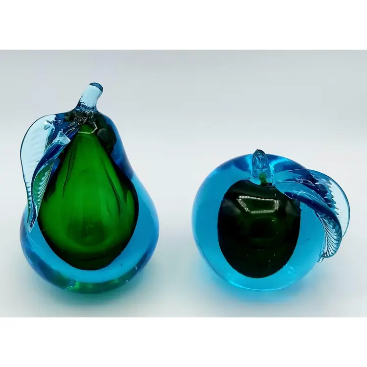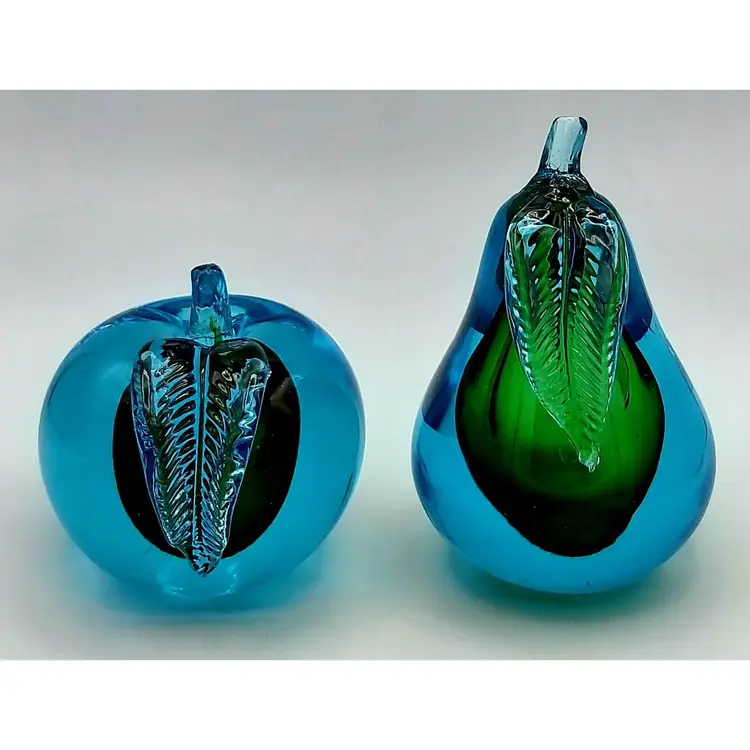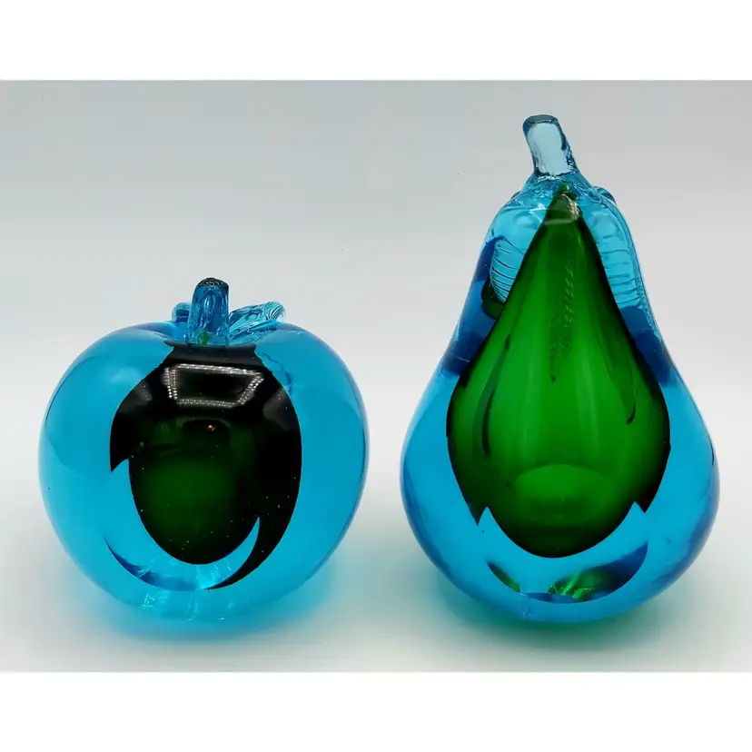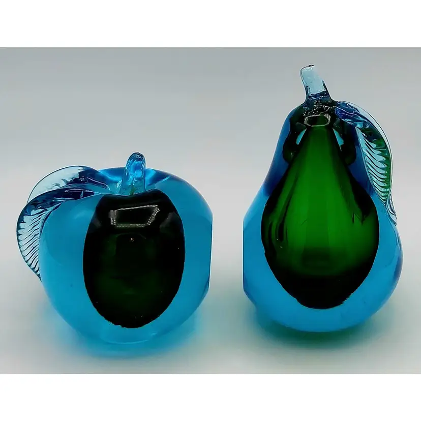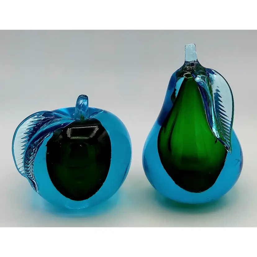 This pair of art glass paperweights / bookends are stunning. Unmarked but very similar to Murano Barbini. They are well made, have clean lines, good weight, with polished bottoms and sides. Stems are more straight (no button) and have tool marks. Tip of the pear's leaf has a nick. See pictures for details. Apple measures 4" high x 4 1/2" wide x 4 1/4" wide. Pear measures 6 1/4" high x 4" wide x 4" wide. Fantastic paperweight / bookends. Will be shipping double boxed and weighs approx. 3.65kg or over 8lbs.