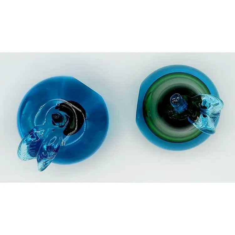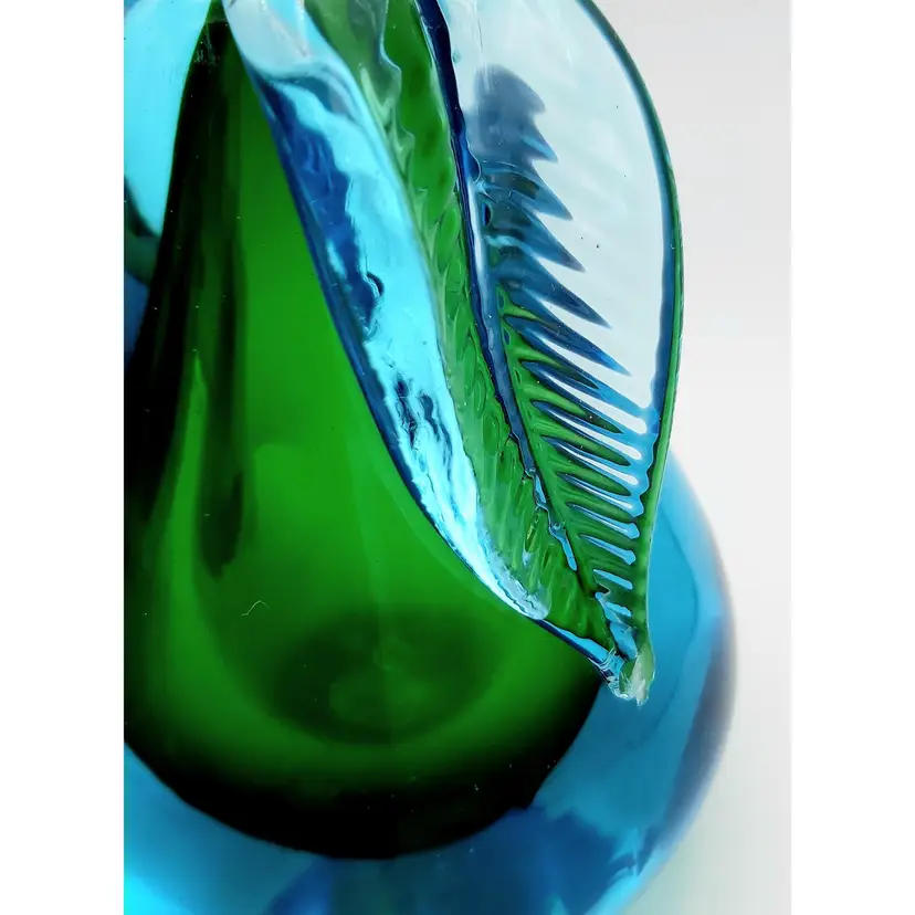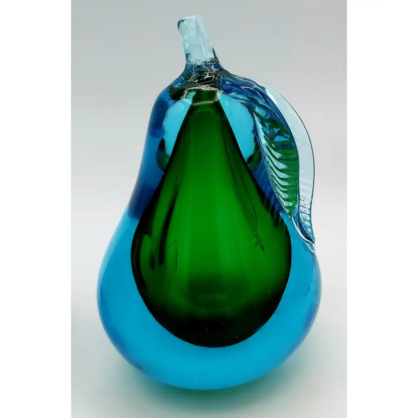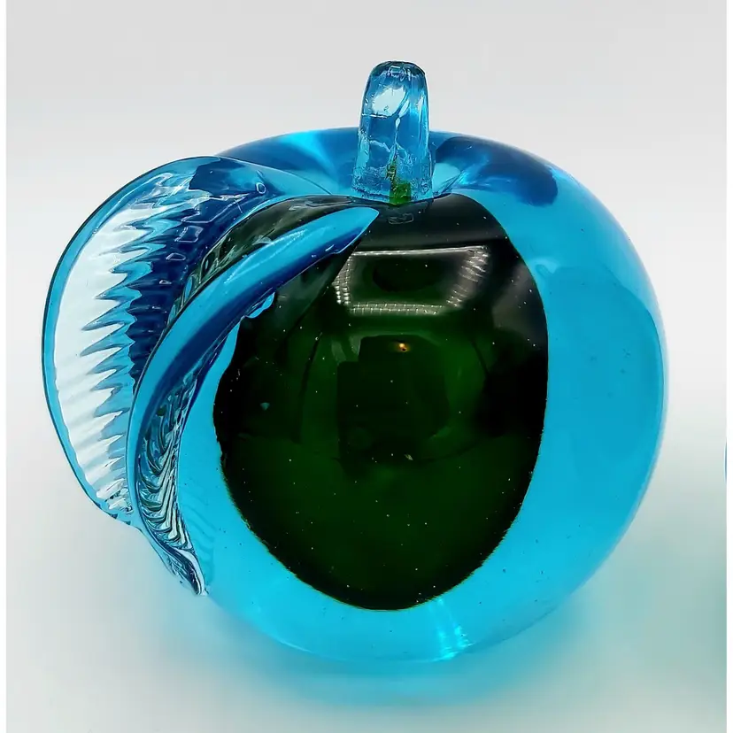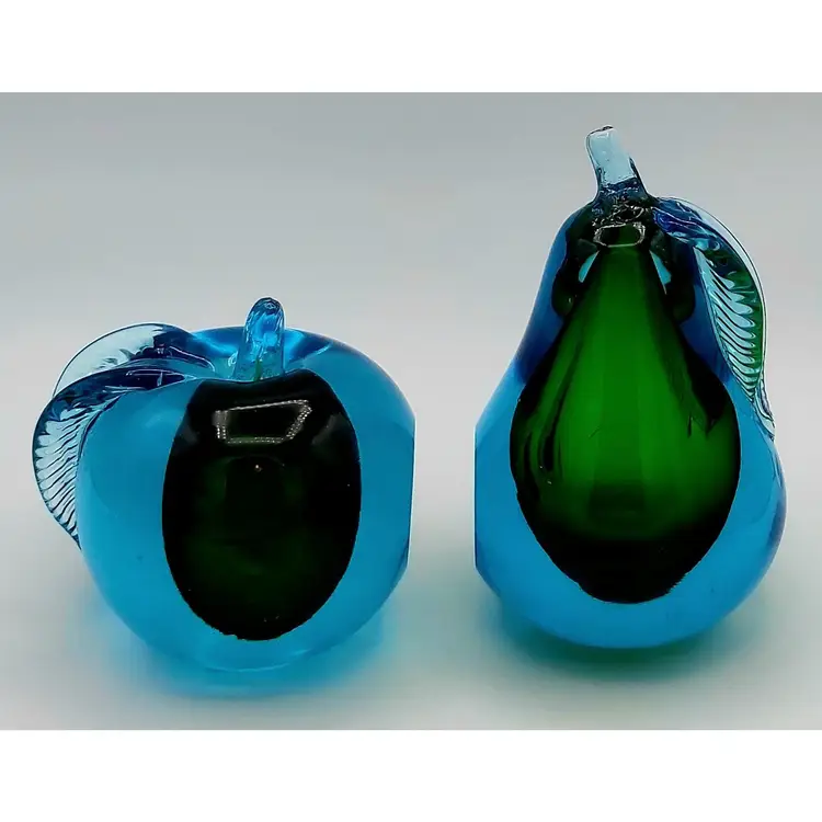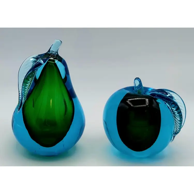 This pair of art glass paperweights / bookends are stunning. Unmarked but very similar to Murano Barbini. They are well made, have clean lines, good weight, with polished bottoms and sides. Stems are more straight (no button) and have tool marks. Tip of the pear's leaf has a nick. See pictures for details. Apple measures 4" high x 4 1/2" wide x 4 1/4" wide. Pear measures 6 1/4" high x 4" wide x 4" wide. Fantastic paperweight / bookends. Will be shipping double boxed and weighs approx. 3.65kg or over 8lbs.