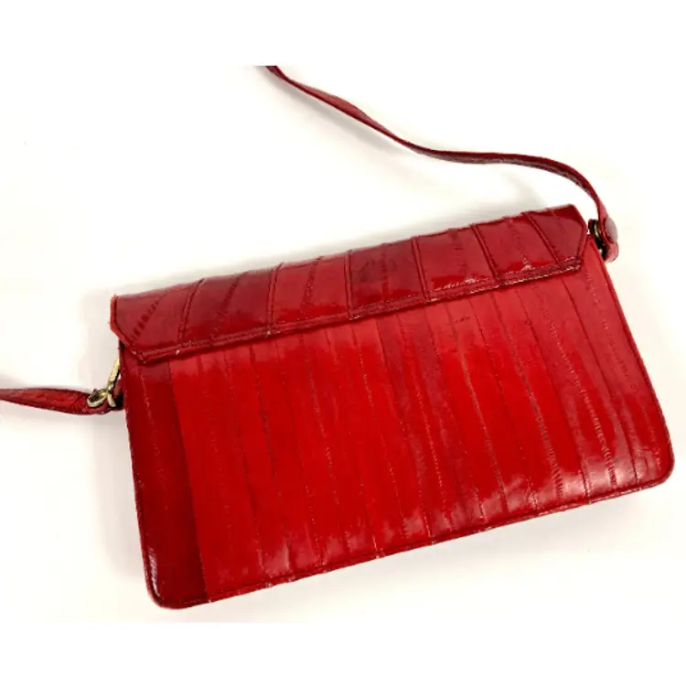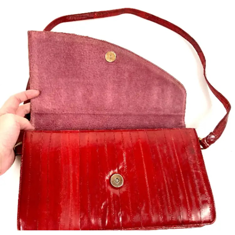 vintage red eel skin bag. magnetic snap flap closure. suede interior.