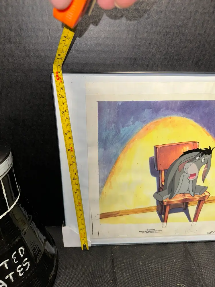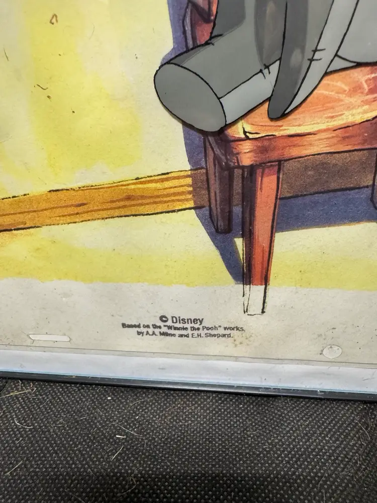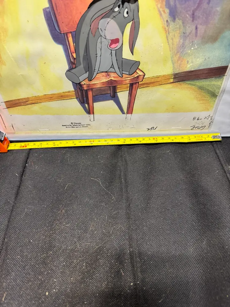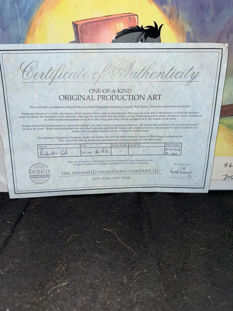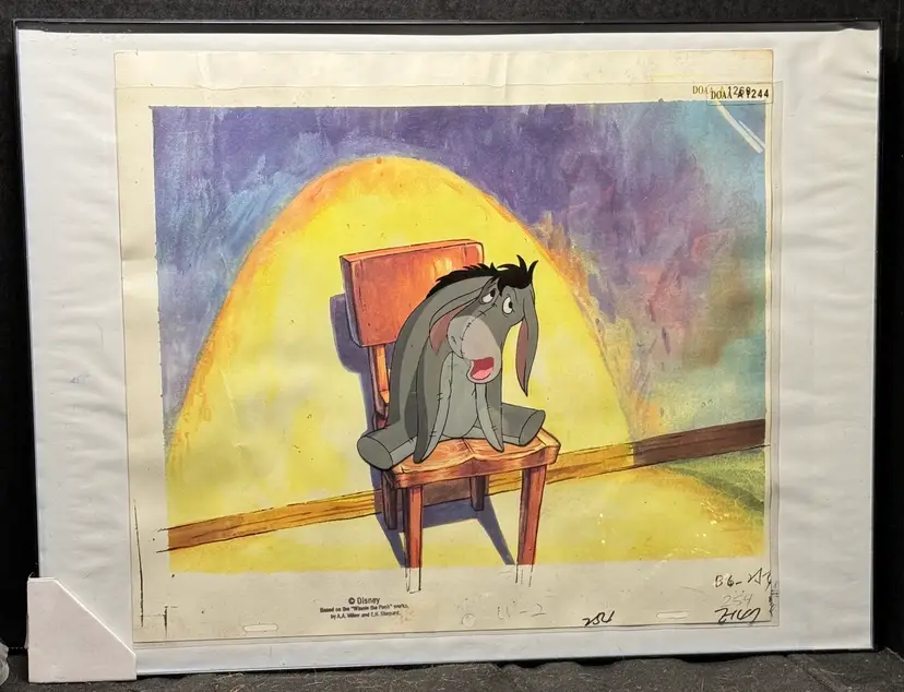 This unique piece of art features Eeyore from Disney's Winnie the Pooh franchise. The production cel is accompanied by the original background and comes with a certificate of authenticity. It is a one-of-a-kind piece of animation history that any collector would love to add to their collection. It comes with the certificate of Authenticity with specific references to the piece.