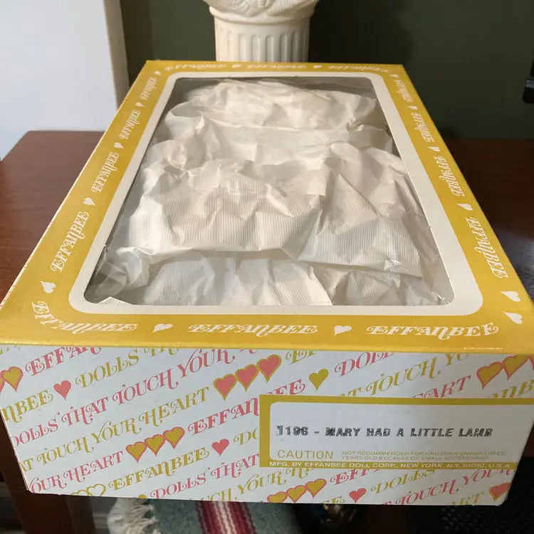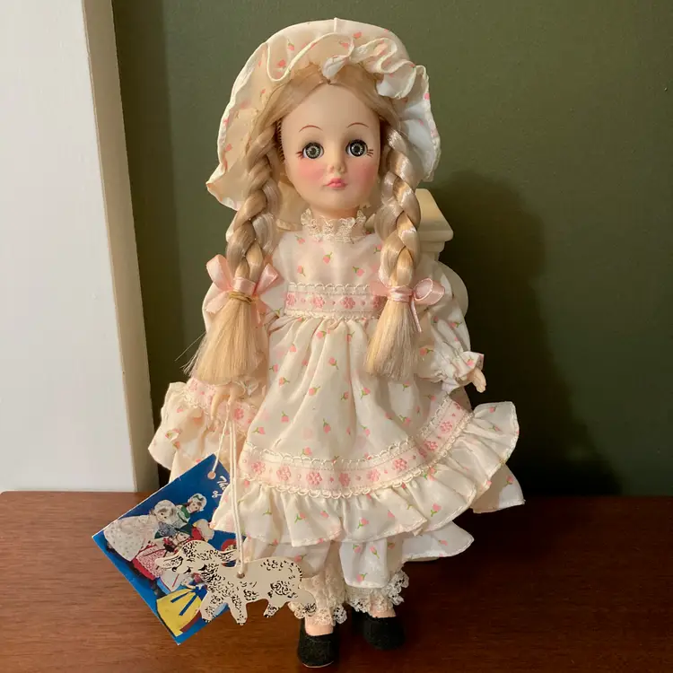 Wonderful World of Effanbee Dolls Collection. 11" doll. Made in USA. Complete with box. Box base in very good condition; lid with cellophane fragile. Will be shipped carefully to protect doll, who retains good color in facial screening and in clothes. The elastic in her cap is loose and so sits loosely on her head.