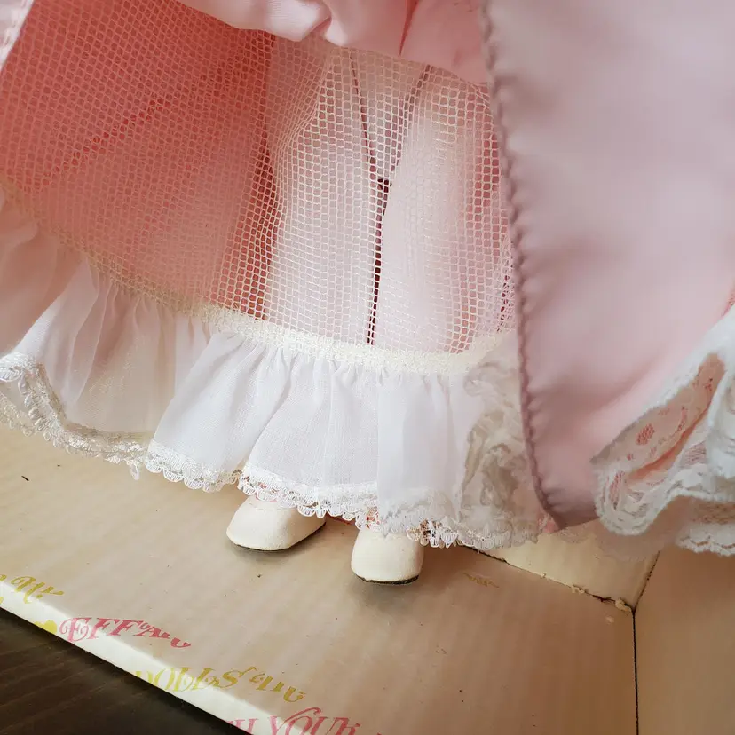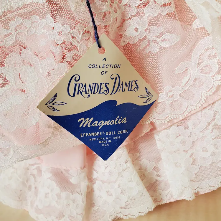 Effanbee Grandes Dames Magnolia Doll 15" Box w Tag Blonde Pink Bonnet Fan Shoes Secured in Original Box with tag- No lid. Box shows wear- Doll appears never taken out of box. See photos! Ships Fast- Smoke Free! CLOTHING AND FABRIC ITEMS: All clothing and fabric items have been steam cleaned and/or washed.