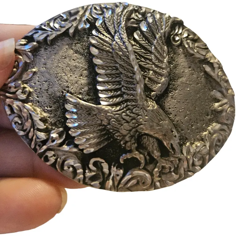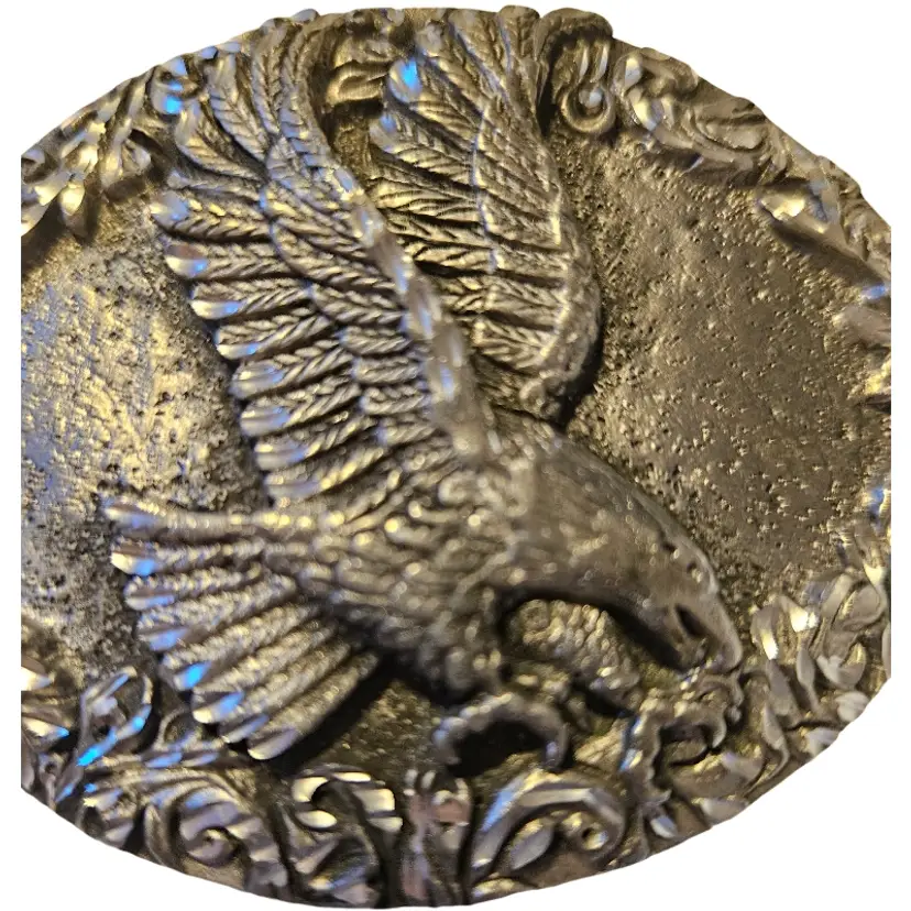 This belt buckle features a detailed eagle design cut from pewter, showcasing a silver color that adds a touch of elegance to any outfit.
