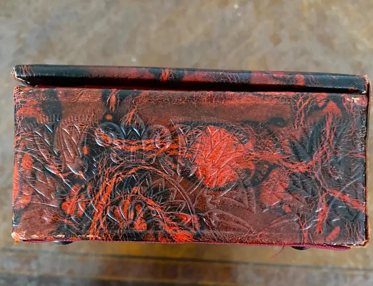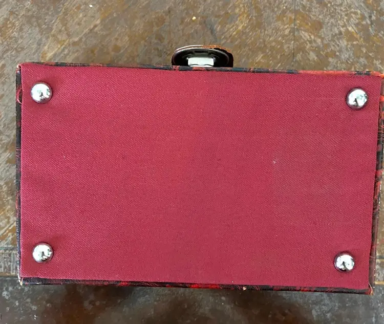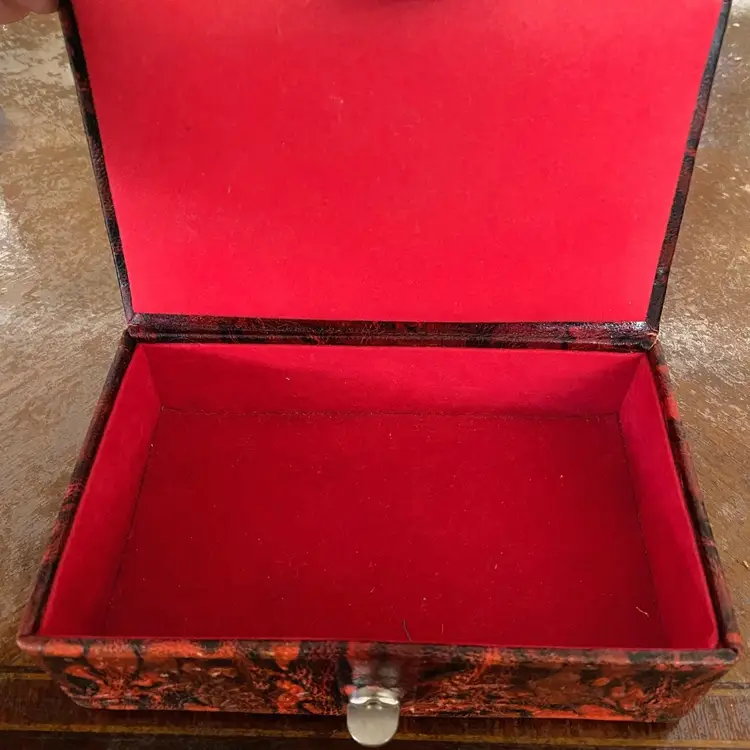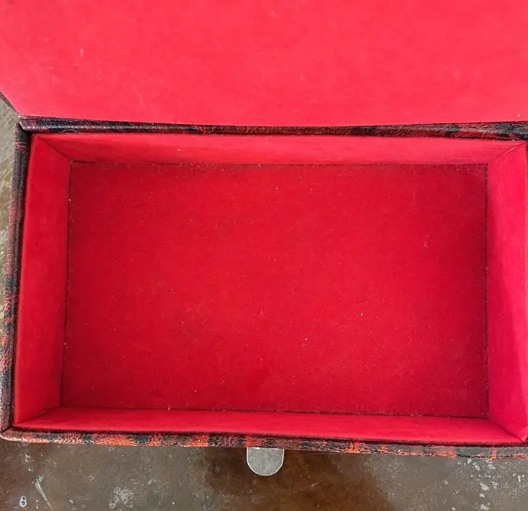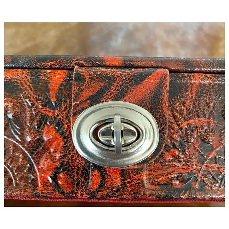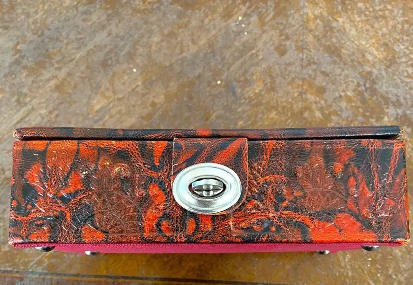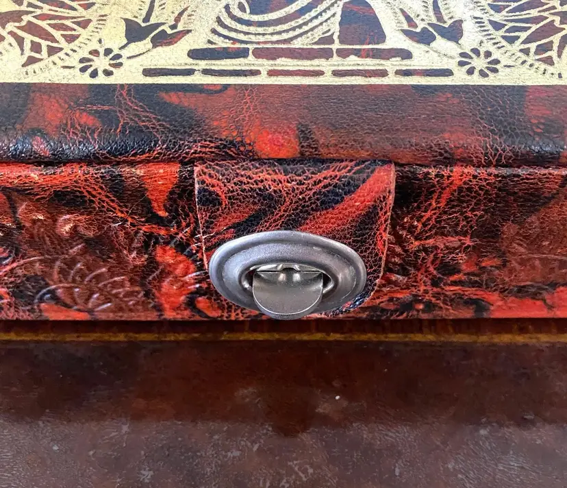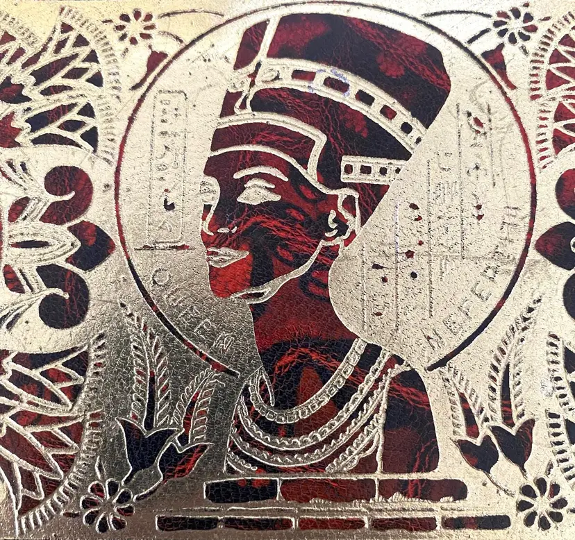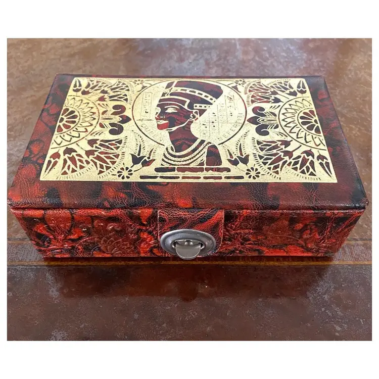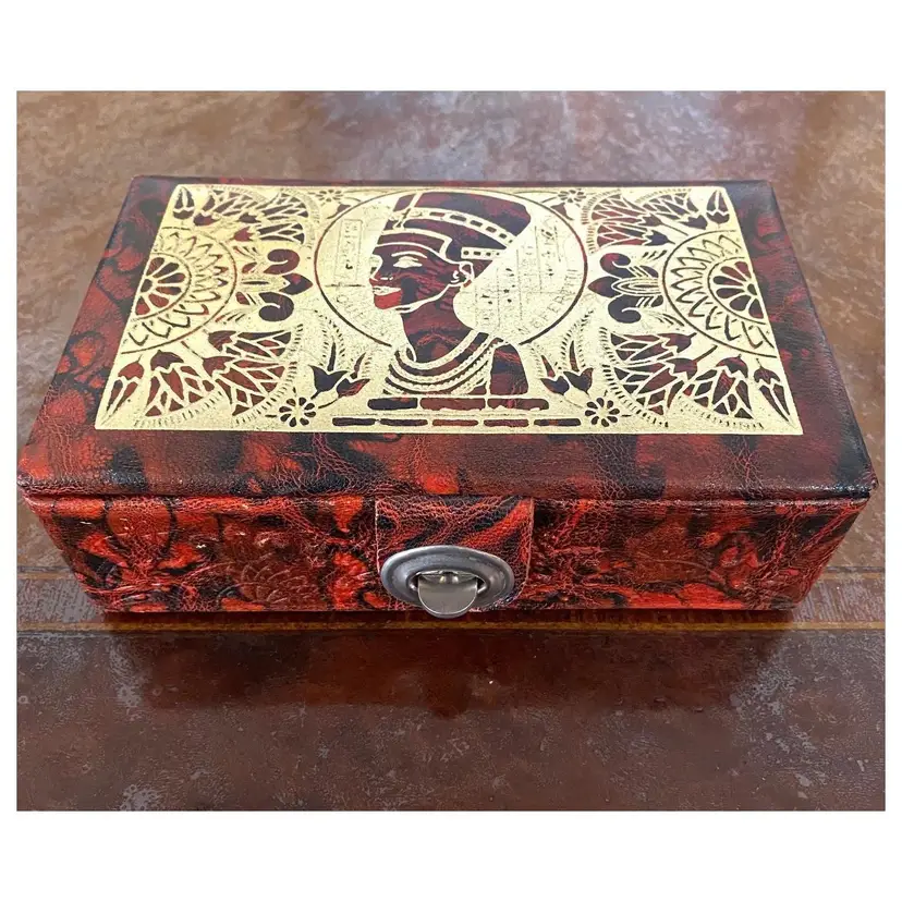 Egyptian Leather Jewelry Box w/Queen Nefertiti Design. Great for trinkets. Minor wear. In good pre-owned condition. Measures: 7" x 4" x 2"