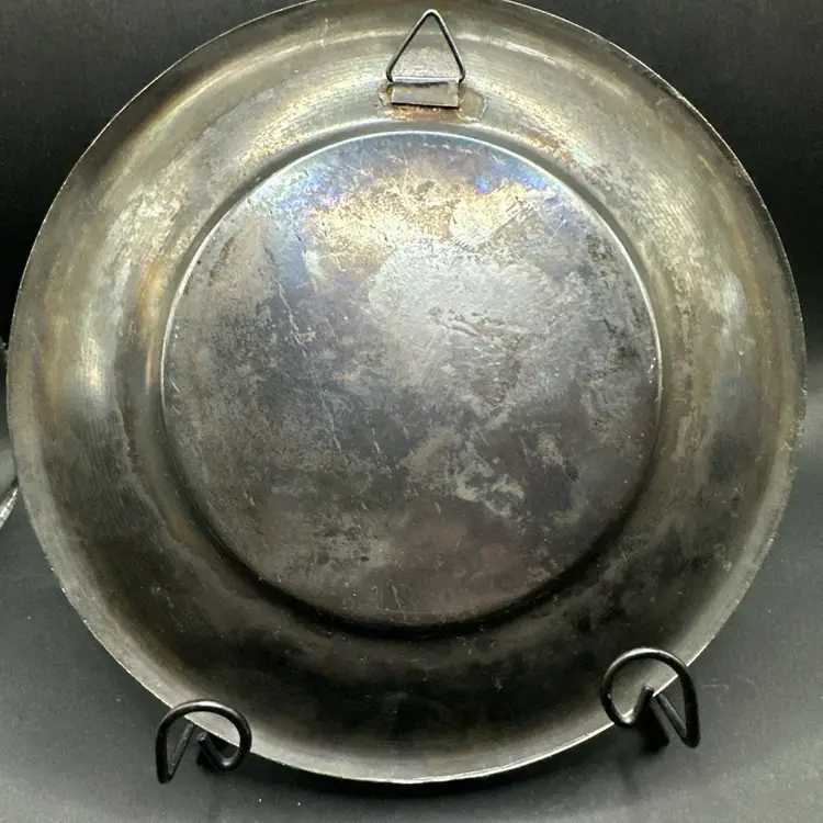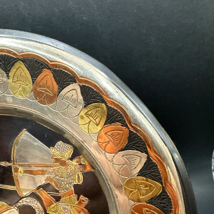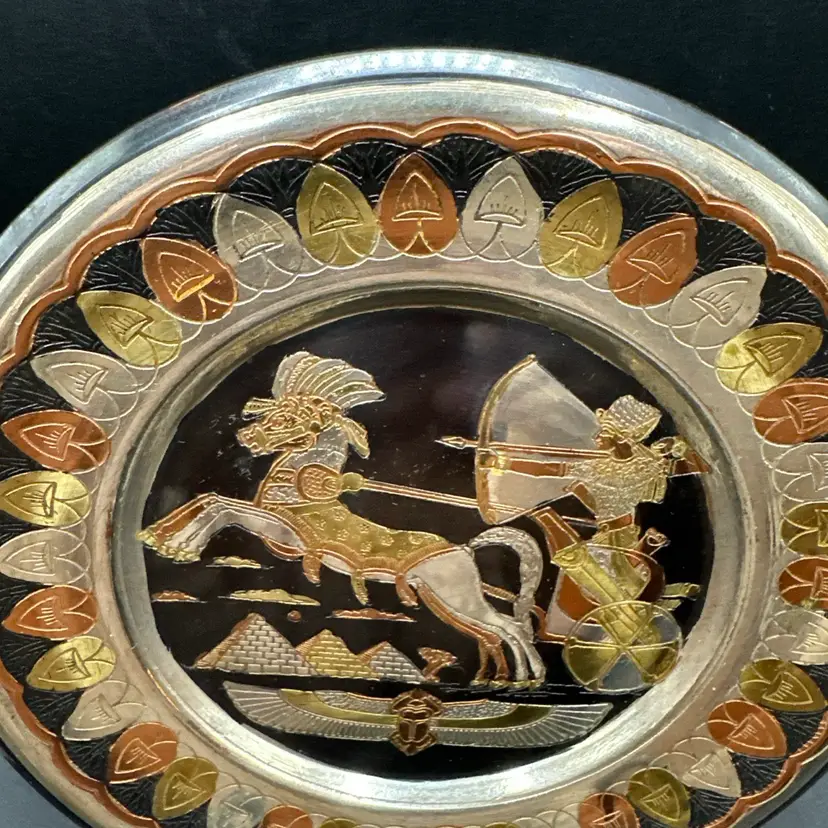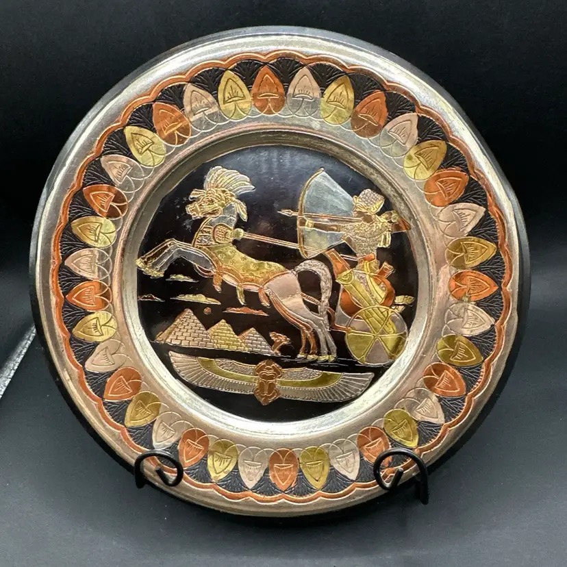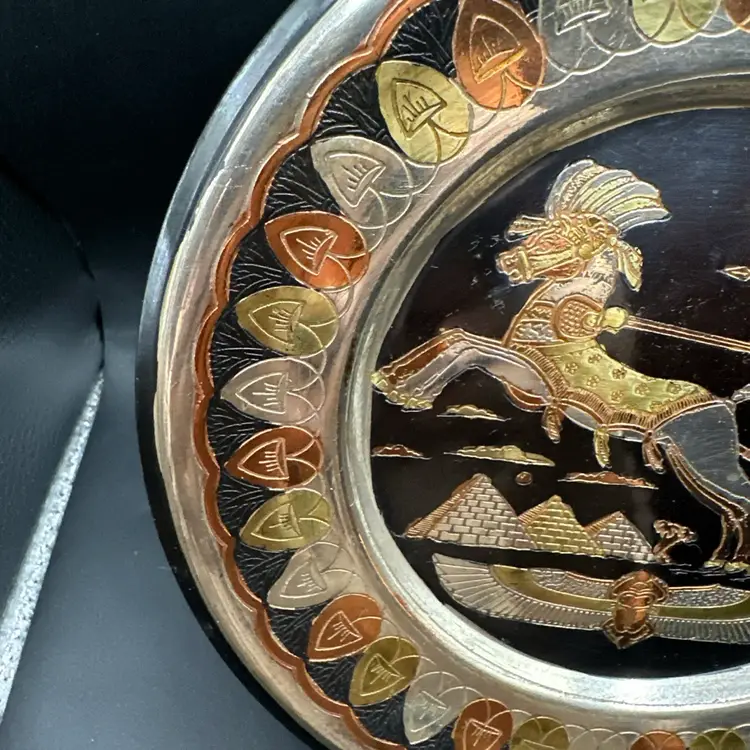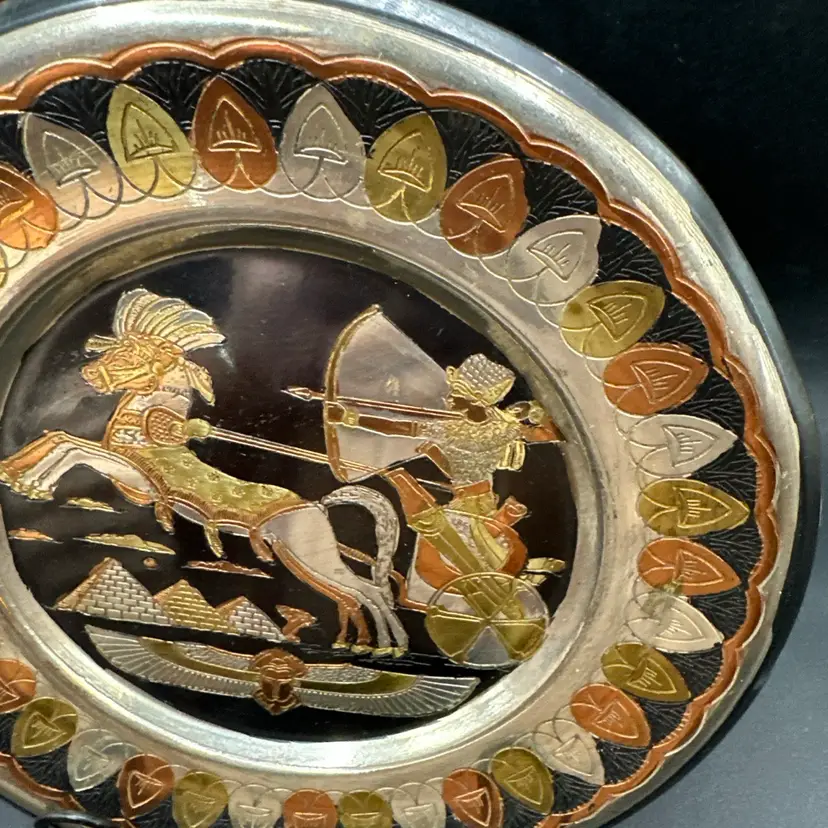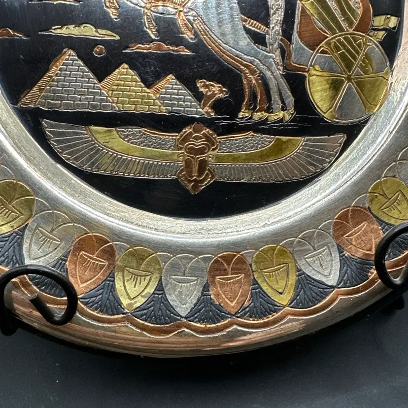 This is a vintage Egyptian decorative metal plate made of mixed metals. There are copper, brass, and silver-toned metals with a black background. They are ornate and intricately etched with Egyptian themes of Pharaohs, hieroglyphics, and design. It measures 6.75”wide. It has a hanger on the back so it can hang on a wall. It weighs 5 oz. It is in very good condition. There are some minimal signs of wear, consistent with age. There is a little misshapen area along the edge but it is very minor. Overall, it is simply stunning. Please see the photos for specifics on the condition of this beautiful piece of Middle-Eastern artwork.