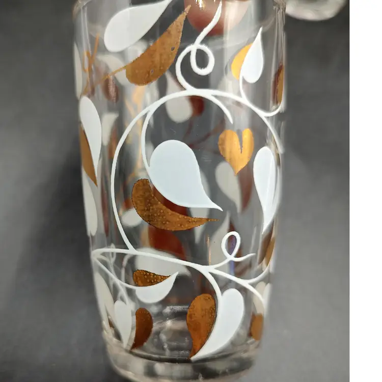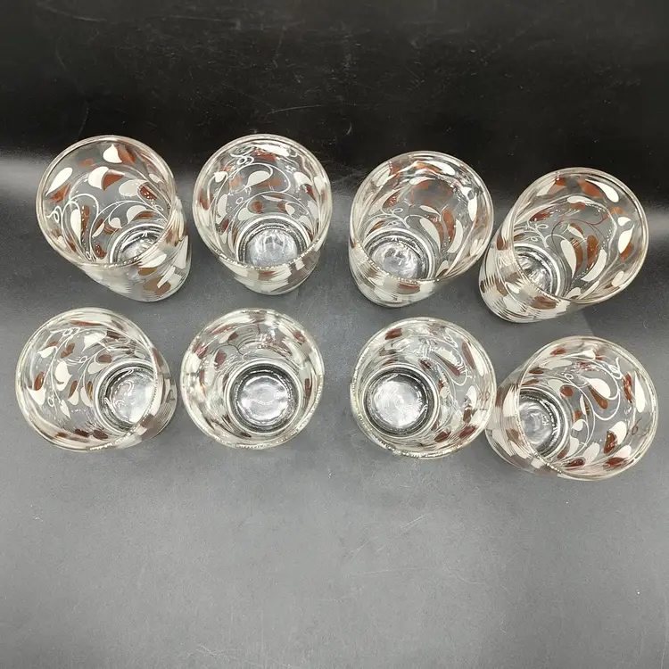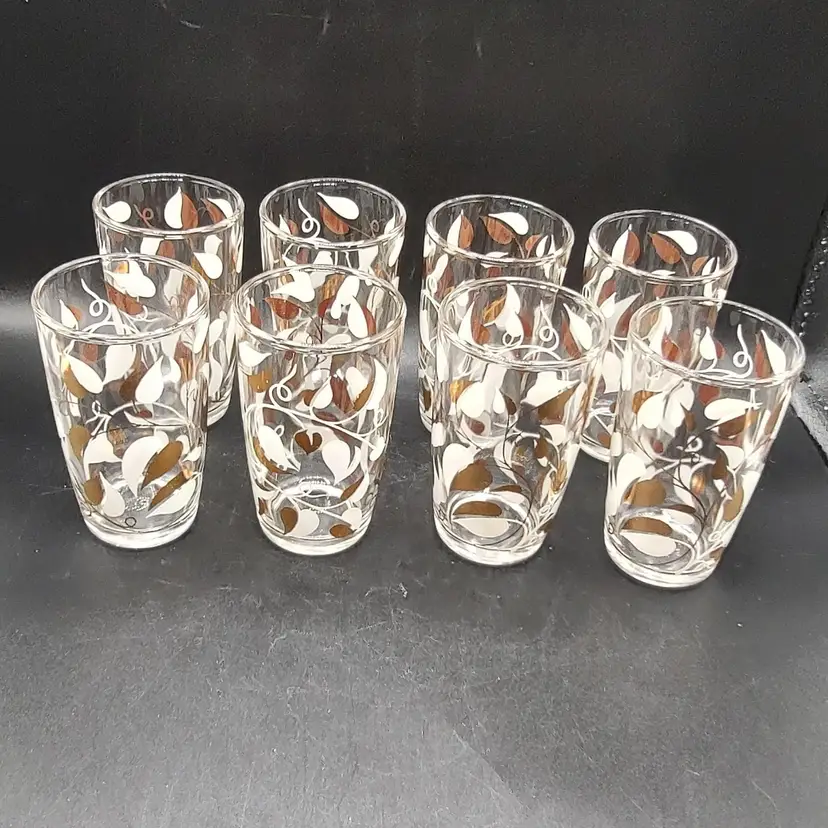 Eight Vintage Mid Century Modern Gold And White Leaves Juice Glasses height 3.5" x diameter 2". Holds 4oz