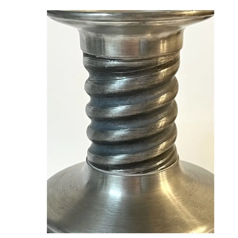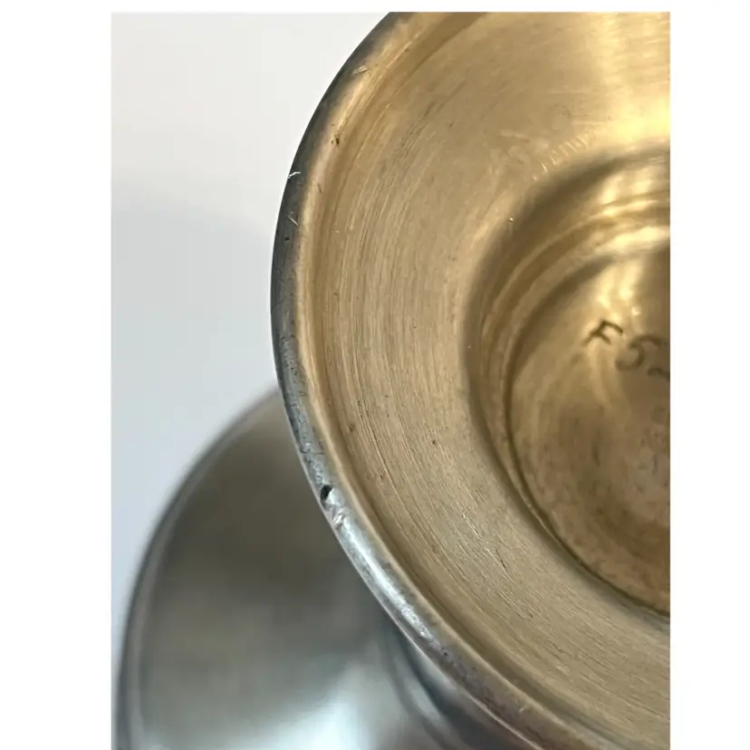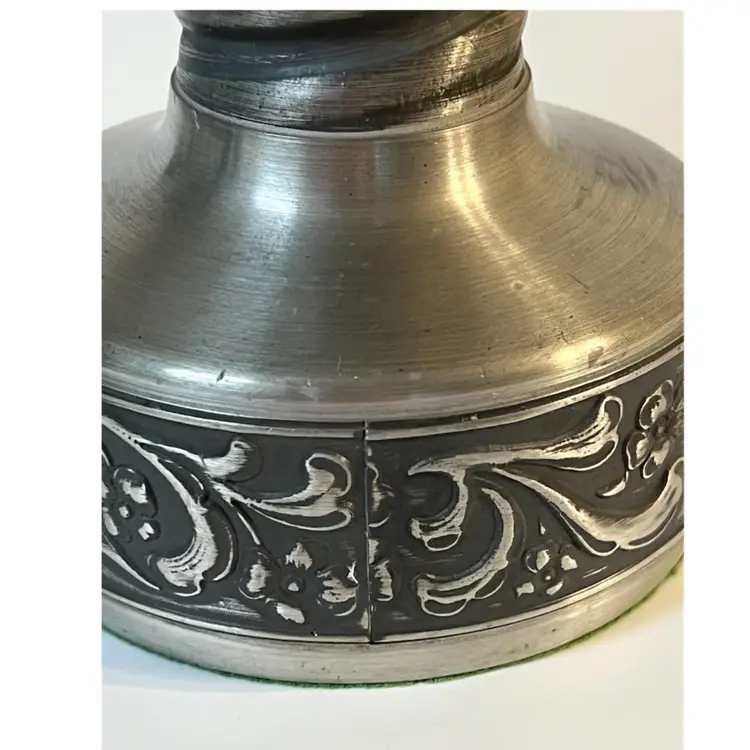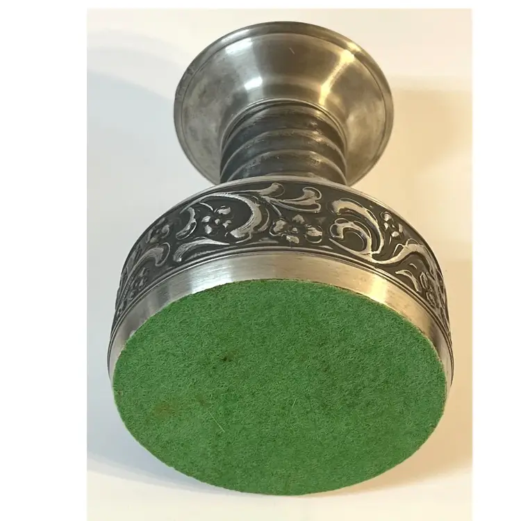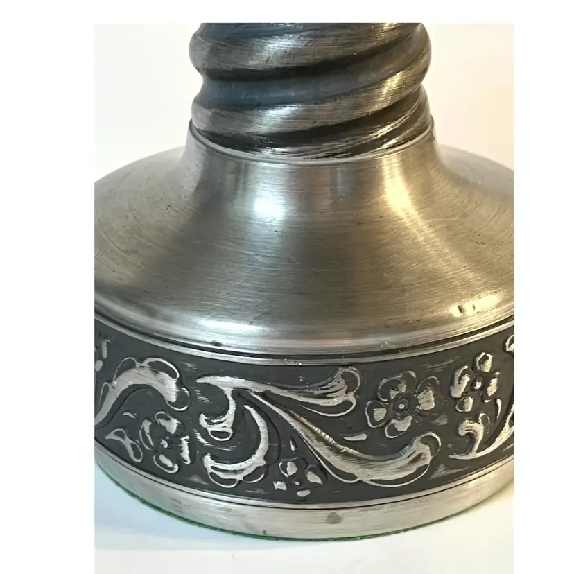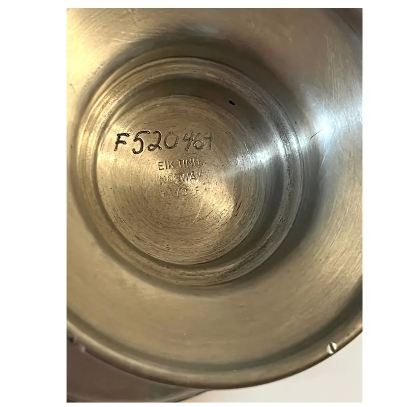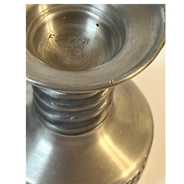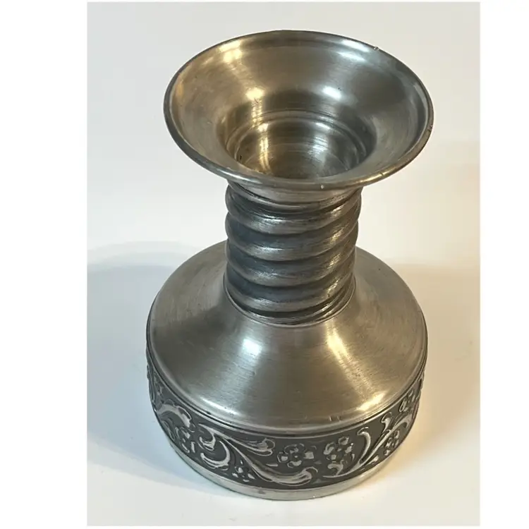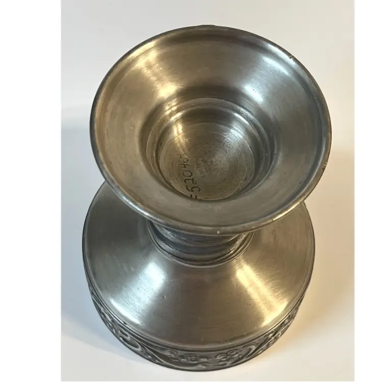 Eik Tinn Norway Stamped F520464 Handmade Pewter Tealights Votive Candle Holder Ornate Floral Base Pattern 6 in Height. Bottom diameter 4.2 in, top diameter 3.5 in. Has some scratches and imperfections on the edges (PLEASE SEE ALL PHOTOS)