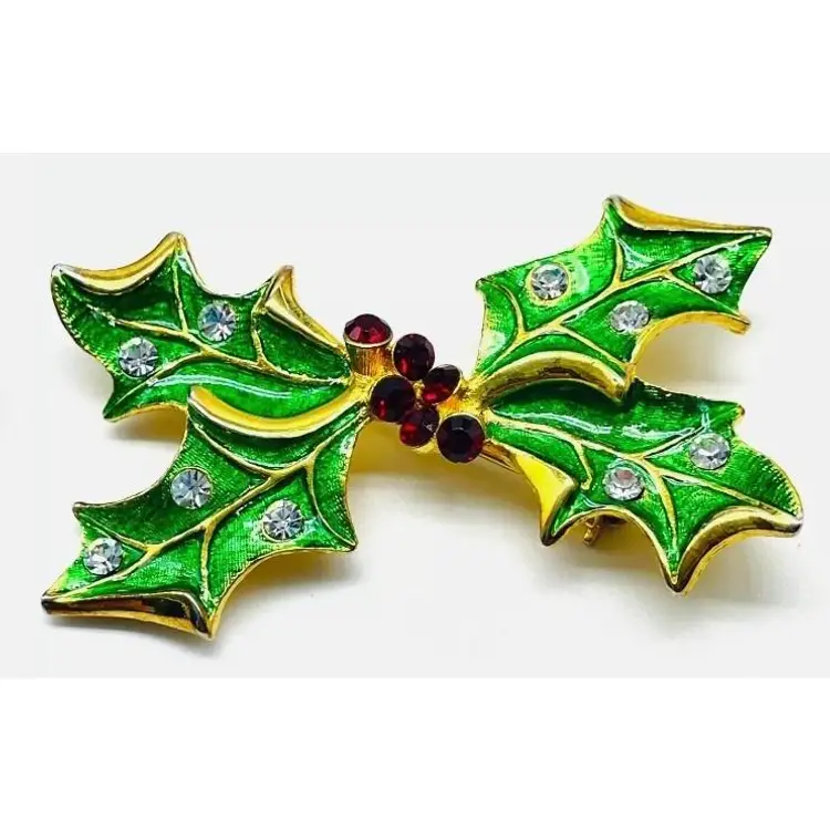 Add a festive touch to your outfit with this vintage holly leaf brooch. Featuring green enamel leaves, gold tone accents, and sparkling rhinestones, this piece is perfect for the holiday season.