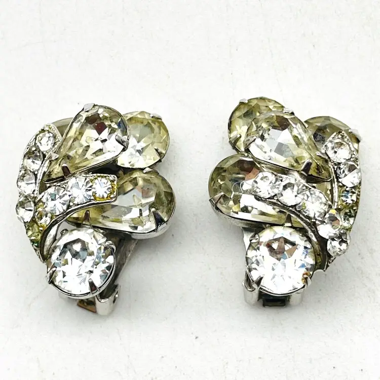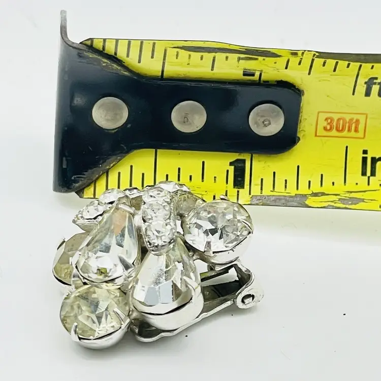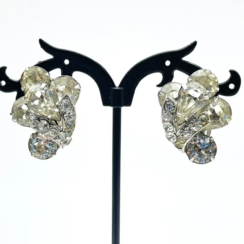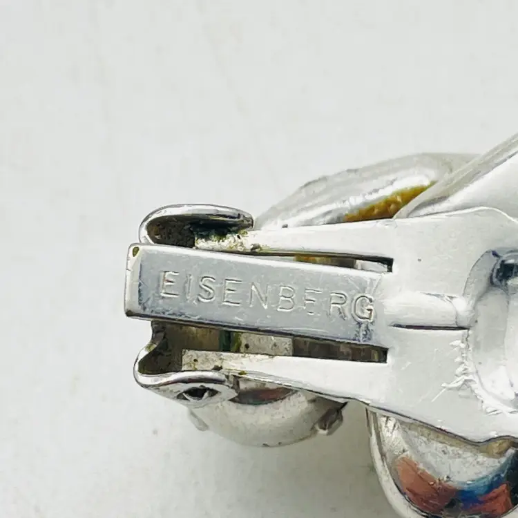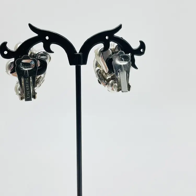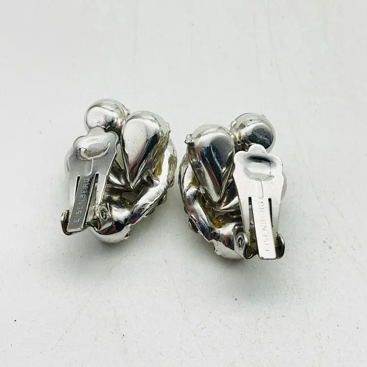 Features Signed Eisenberg earrings Silver tone setting with clear rhinestones Classic cluster style Clip-on backs (no pierced ears required) Vintage collectible costume jewelry Approx. size: 1"