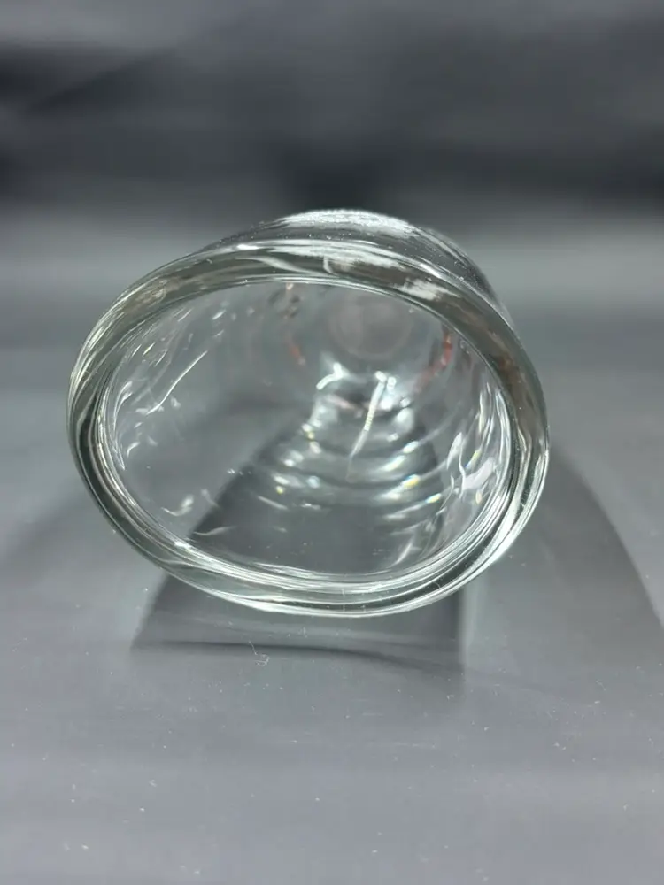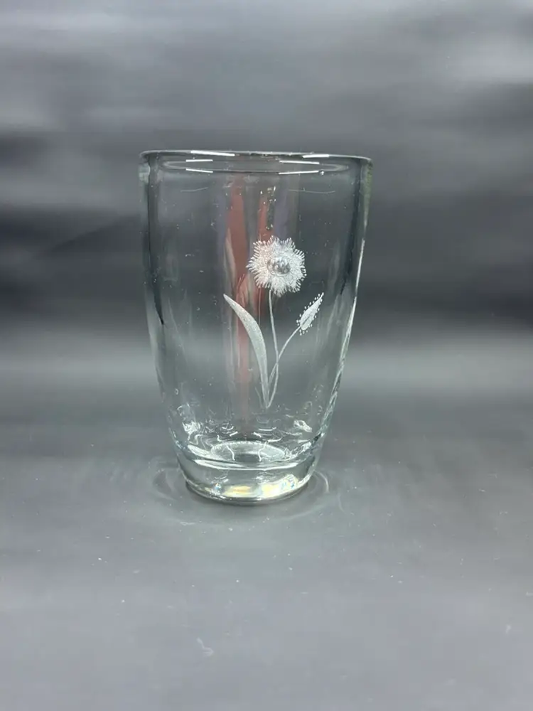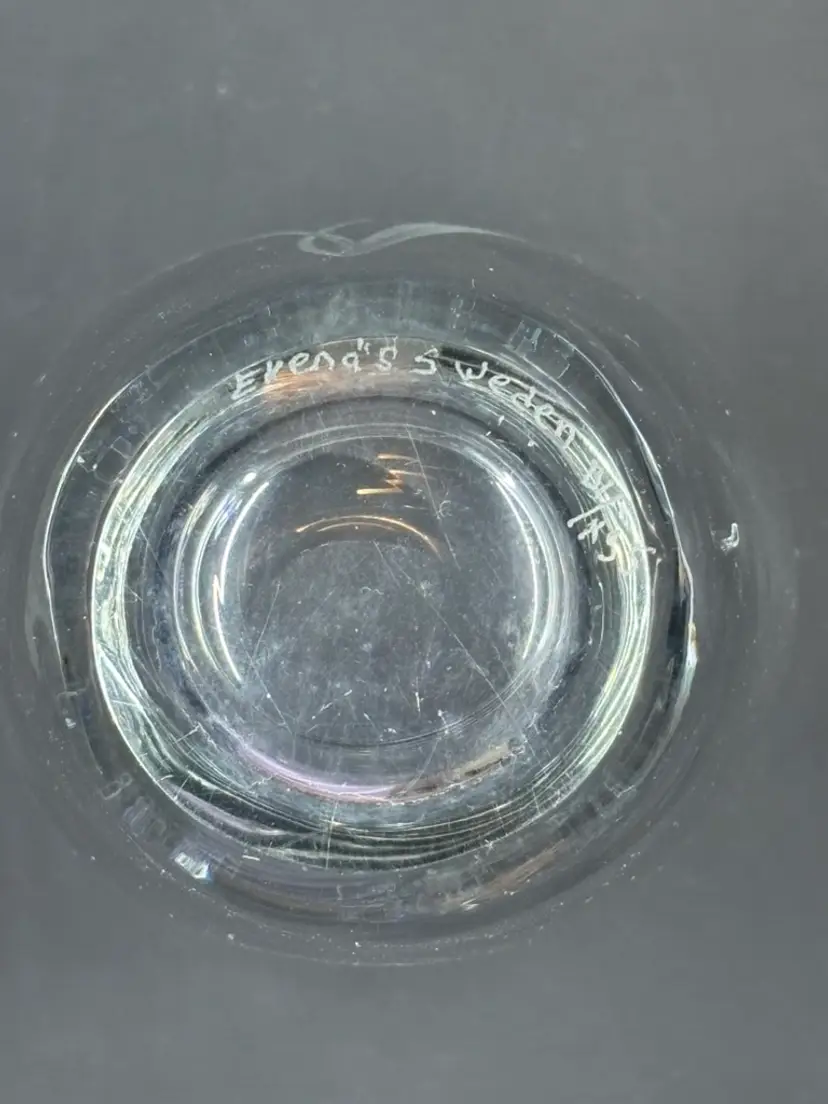 A small (5"x3.25"), heavy, clear glass vase, likely made of crystal or lead crystal, which accounts for its substantial weight. The vase is decorated with a fine, hand-etched design of a single flower. The base is etched with the signature "Ekenäs Sweden" and additional production marks. Ekenäs Glasbruk was a prominent Swedish glassworks founded in 1917. They specialized in both utilitarian glassware and designer art glass. Pieces like this, featuring etched designs, are often signed by the cutter or designer and are a popular example of collectible Scandinavian Modern design.
