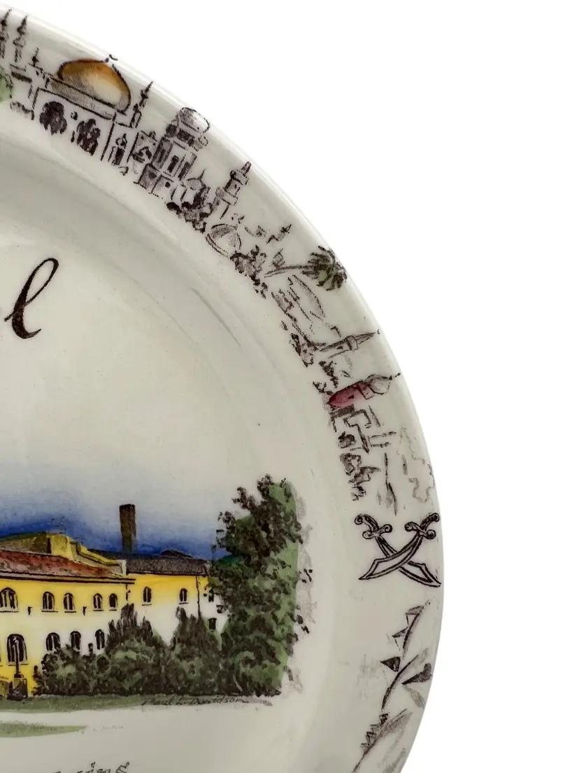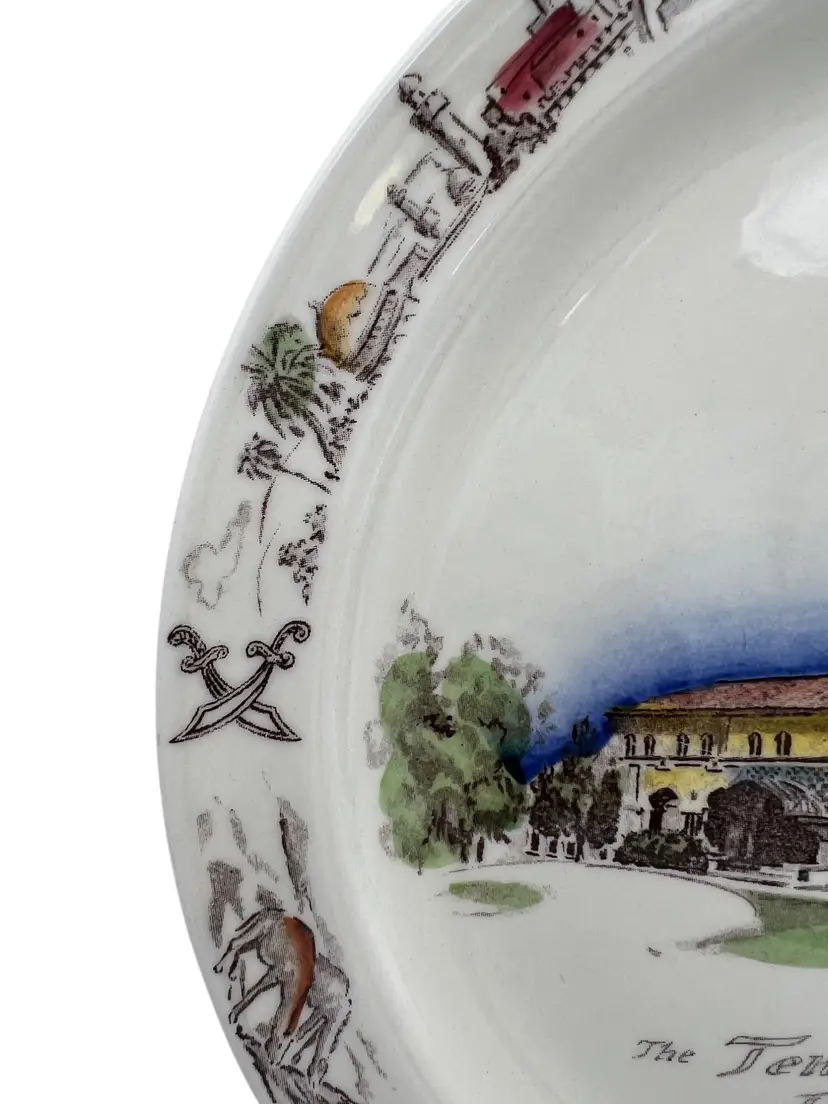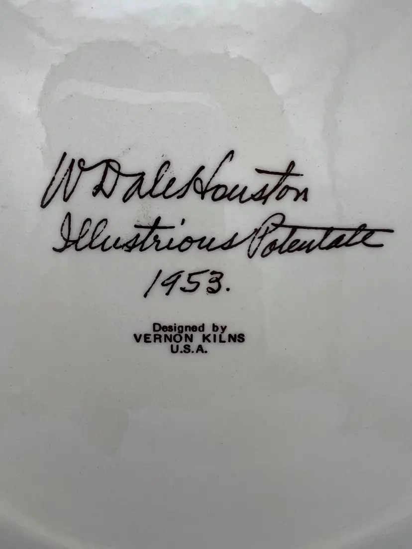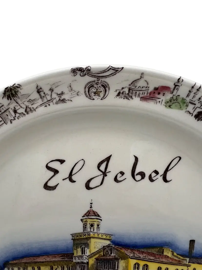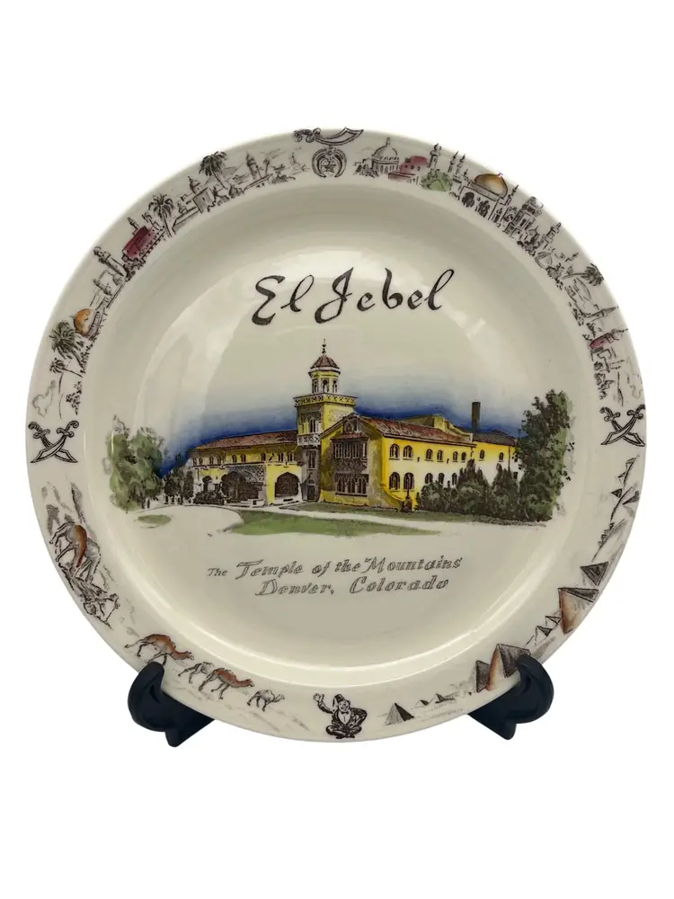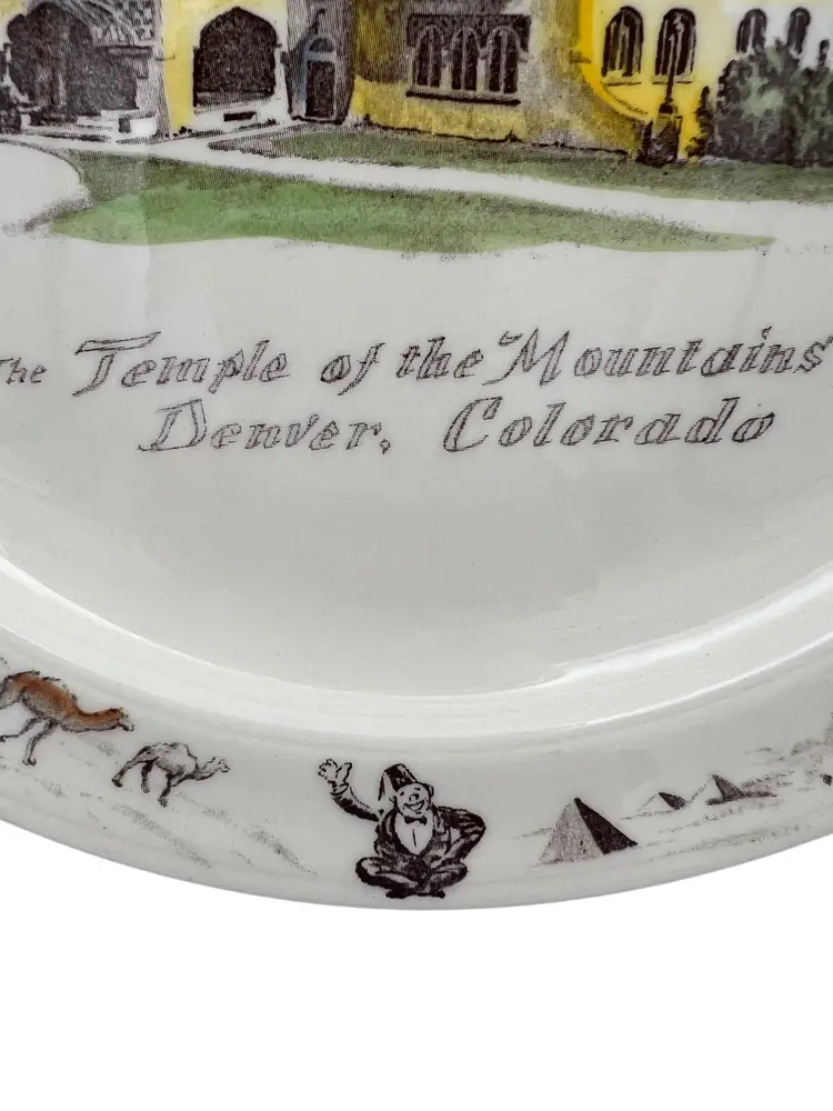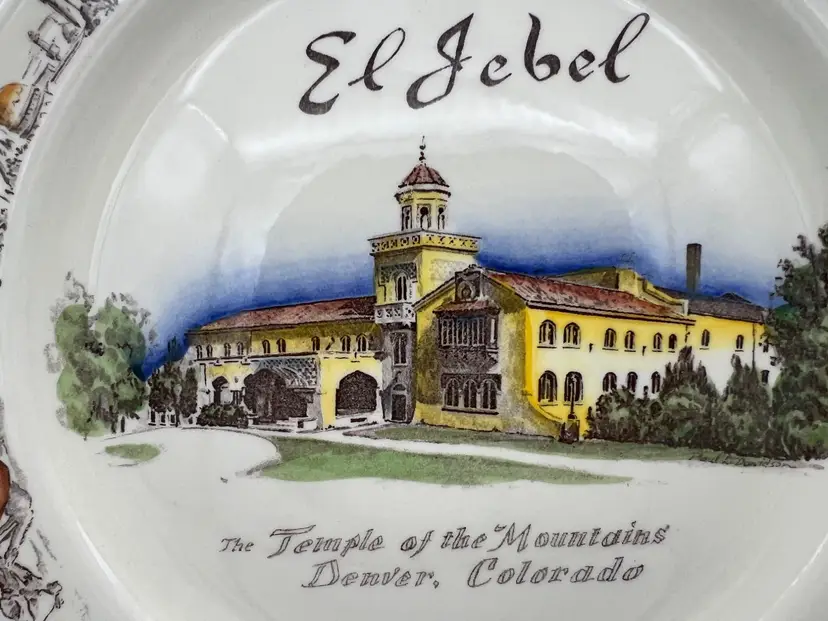 A vintage Vernon Kilns commemorative plate (~10.5″ diameter) honoring the El Jebel Shrine Temple (“Mosque of El Jebel”) in Denver, Colorado. Decorated with a multicolor design, it celebrates the historic Moorish-style Shriners building (built 1907). A fine piece for Shrine collectors, Masonic collectible enthusiasts, or Denver history buffs.