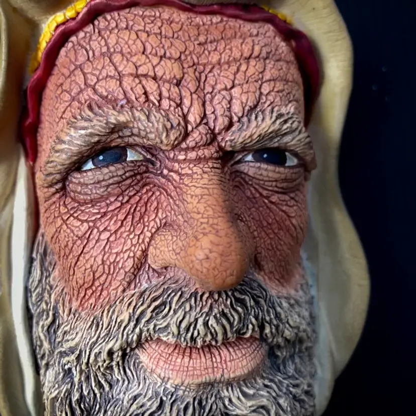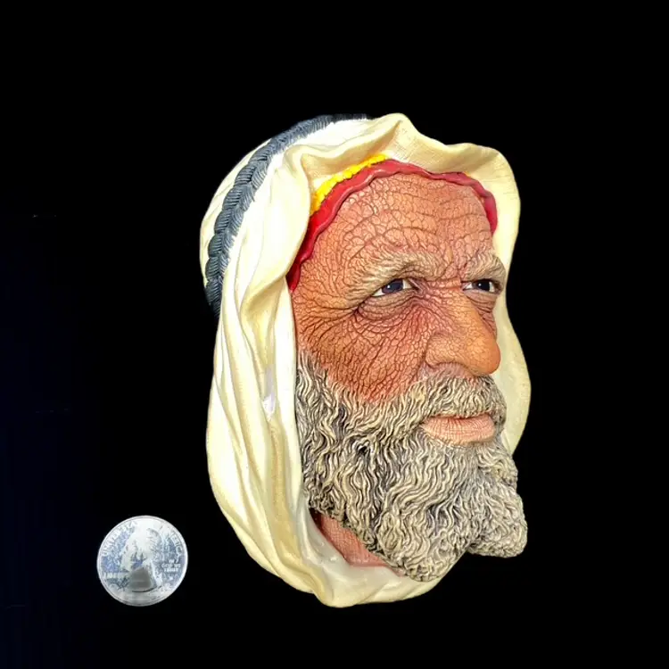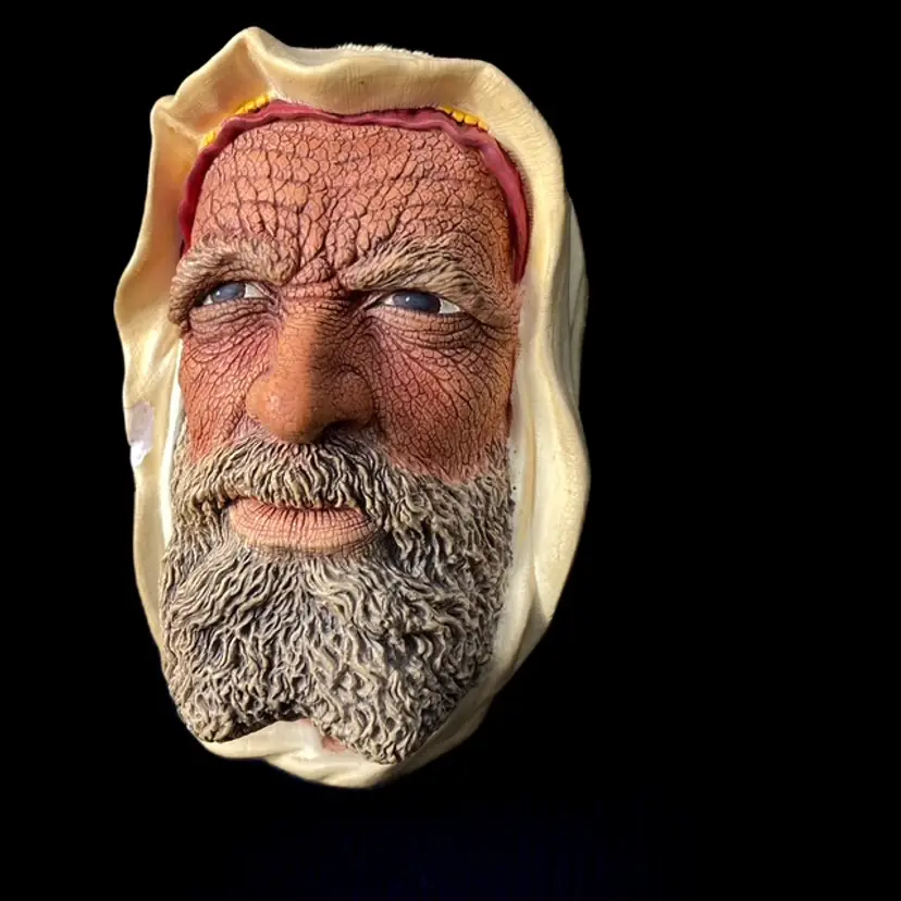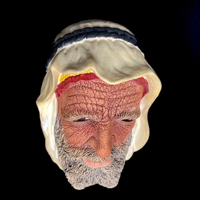 Circa 1958- 1965, Hand painted weathered face with deep wrinkles. This wall display measures 5.25" tall and 3.75" wide. In very good condition with expected paint wear. Small paint chip on the inside of hood- please see photos. mar1524