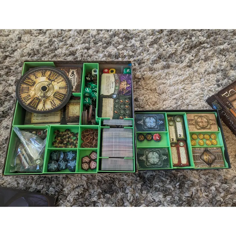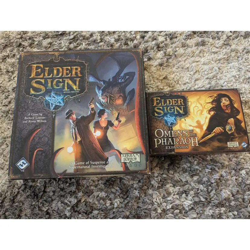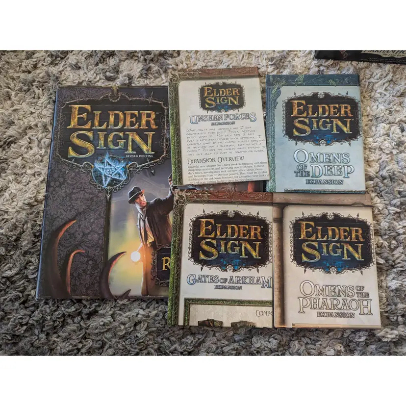 Elder Sign with Unseen Forces, Omens of the Deep, Gates of Arkham, and Omens of the Pharaoh expansions. Everything is stored in the base game box and Omens of the Pharaoh expansion box. Everything is in excellent condition. Thanks for looking!