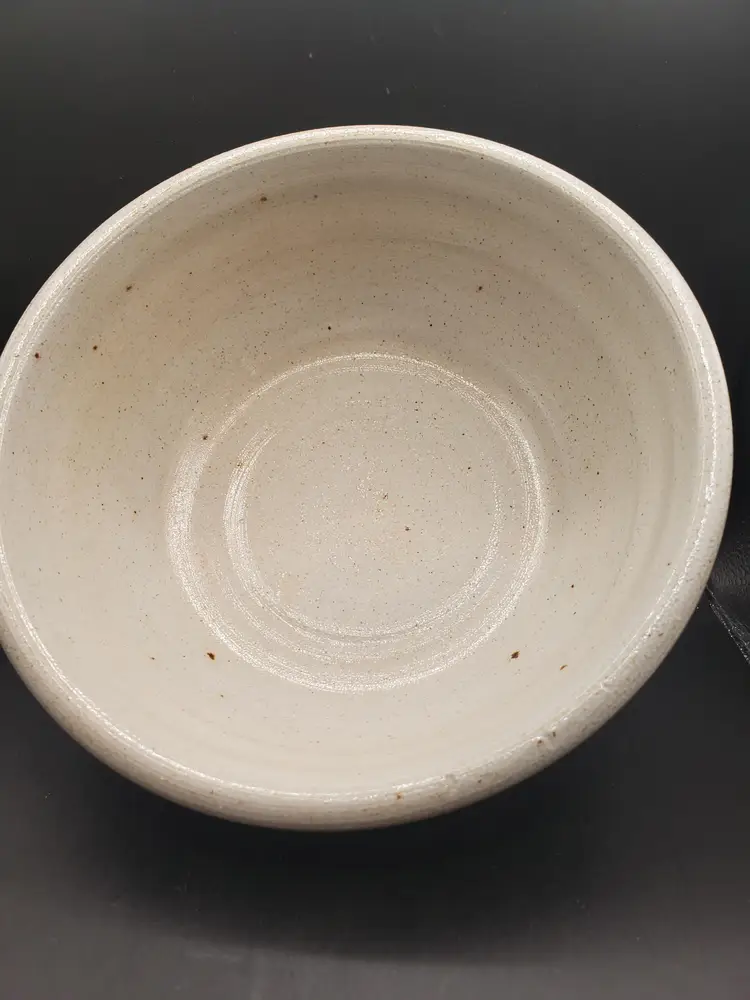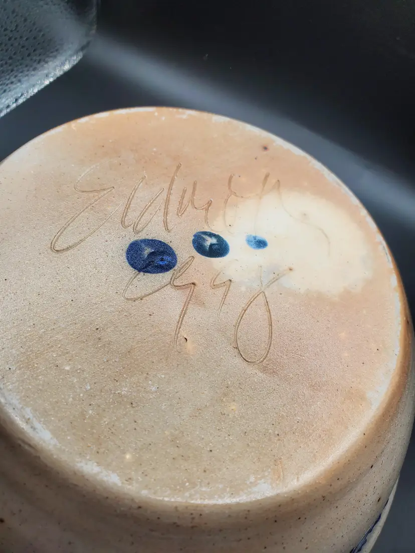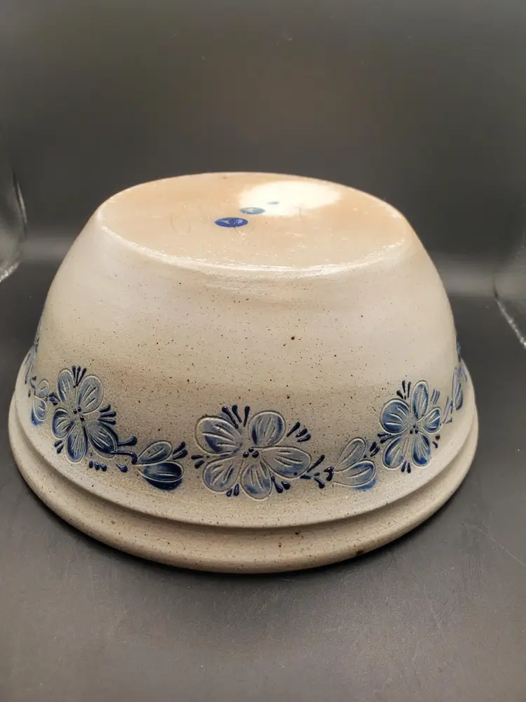 Salt glazed pottery bowl signed Eldreth 1998. Design is blue florals. Nice bowl. No chips or cracks. 8" round.