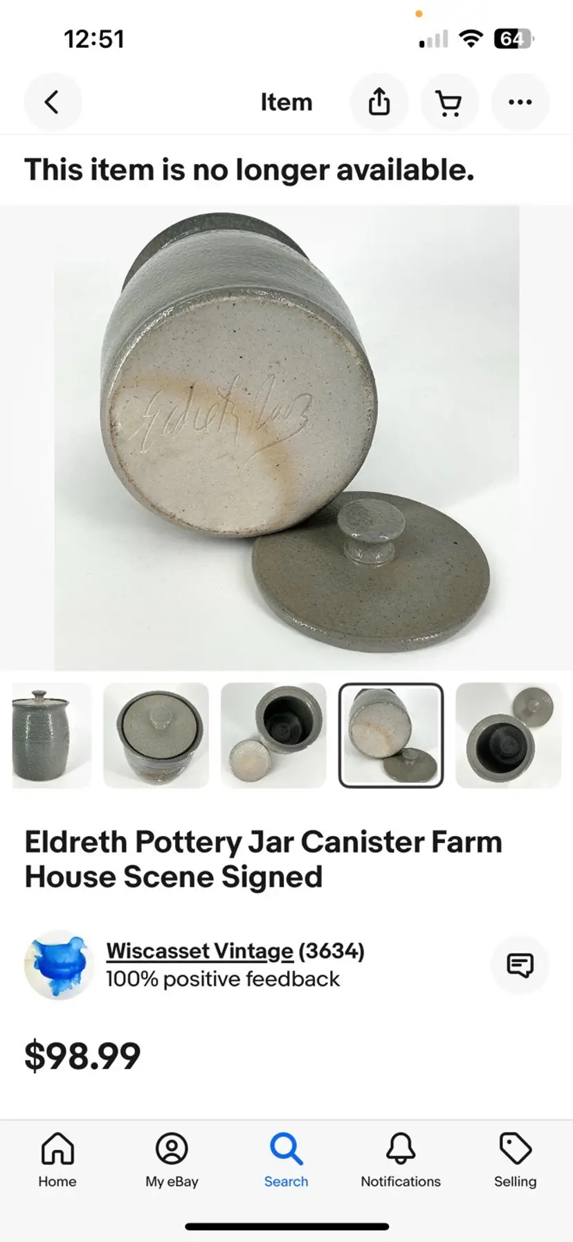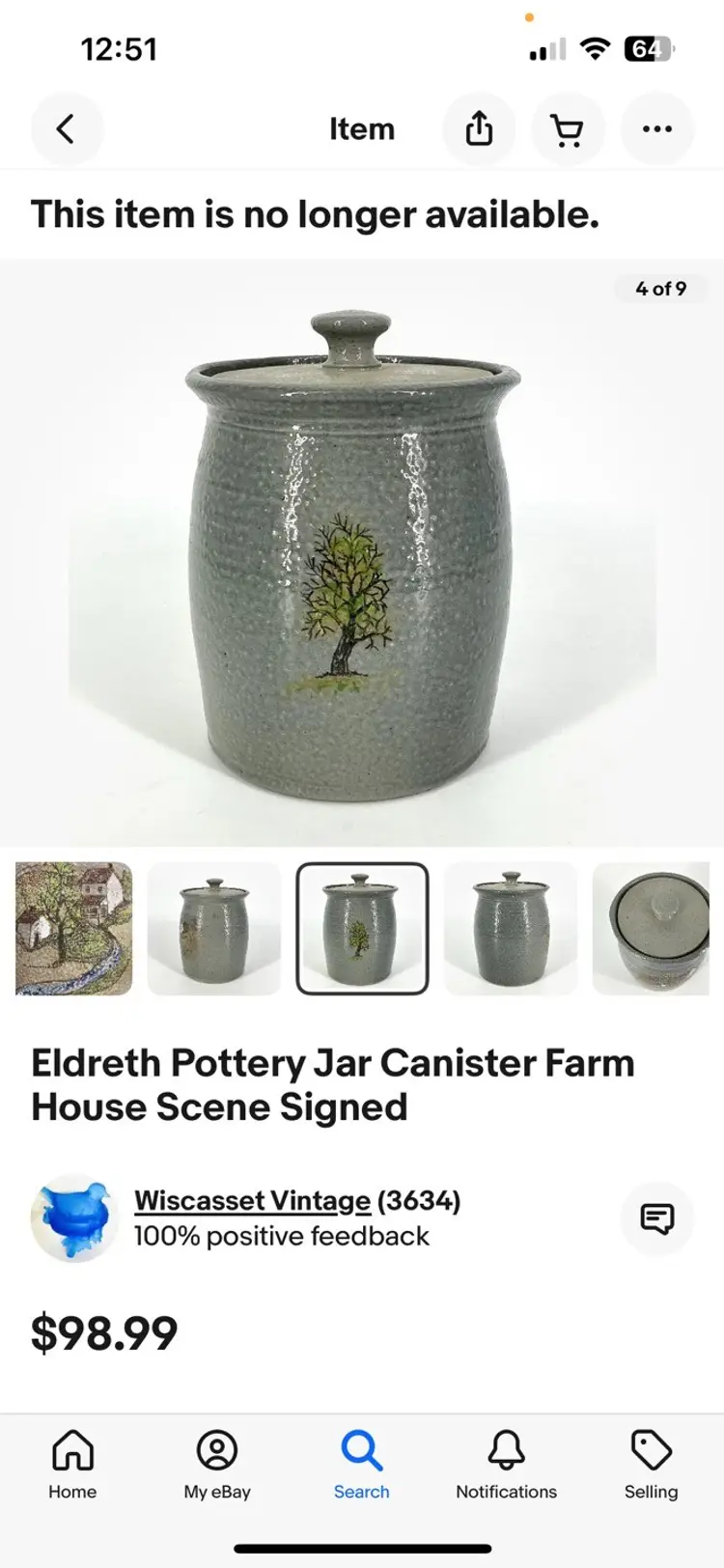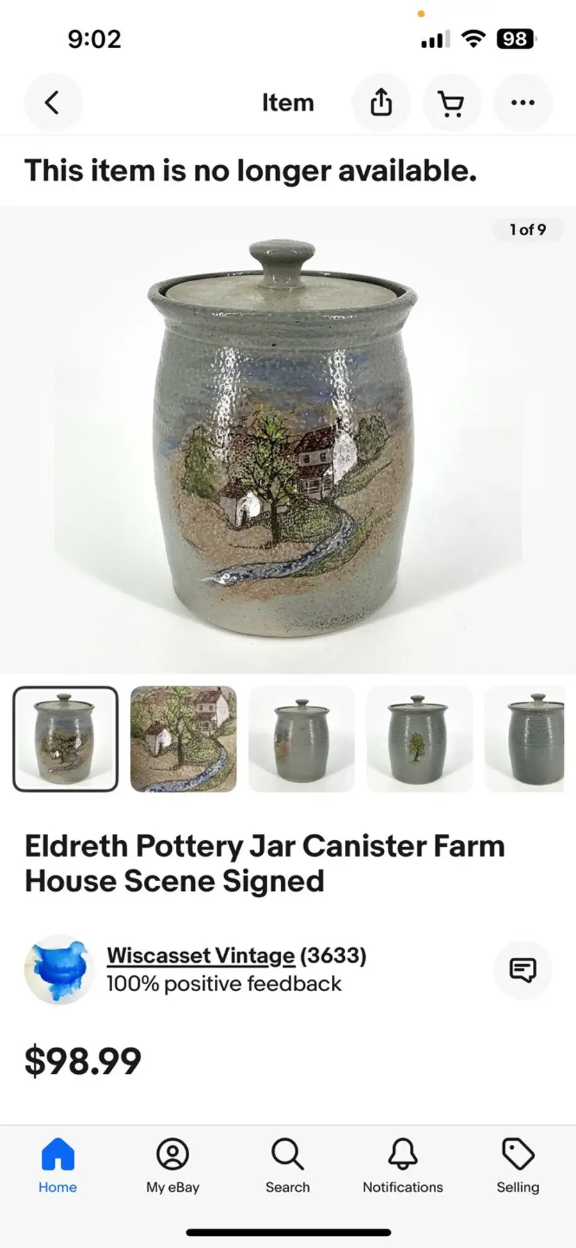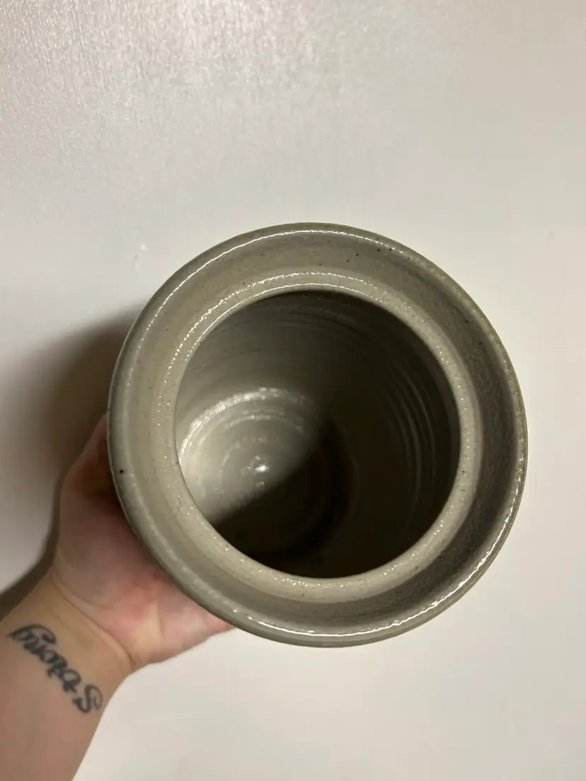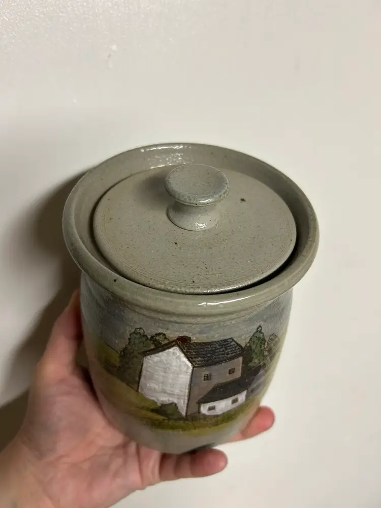 This is not signed, however, I found one online that looks exactly alike but a slightly different farmhouse scene. I did look up if all Eldreth pottery is signed, because I was confused on why mine was not, and it did say that not all Eldreth is signed. I 100% believe this is by Eldreth just like the canister sold online. I placed up the photos of the one I found online so you can see. Height is 6 1/2 width is 4 1/2