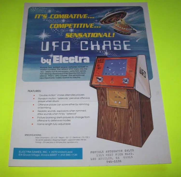 Arcade: Flyer Modified Item: No Country/Region of Manufacture: United States Original/Reproduction: Original Year: 1975 Game Title: Ufo Chase Brand: Elektra Games Theme: Retro Gaming