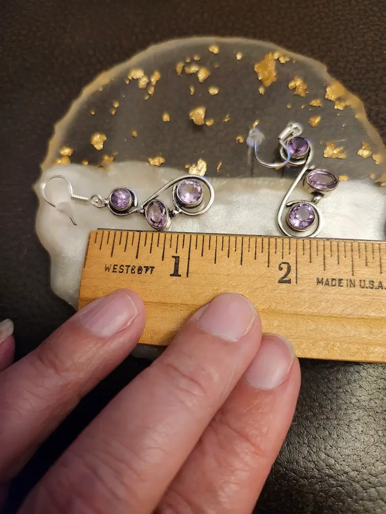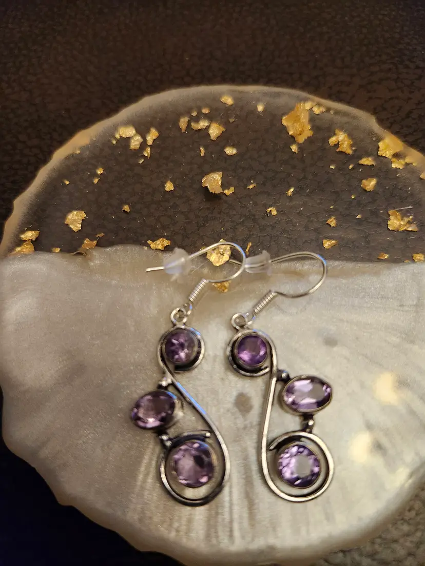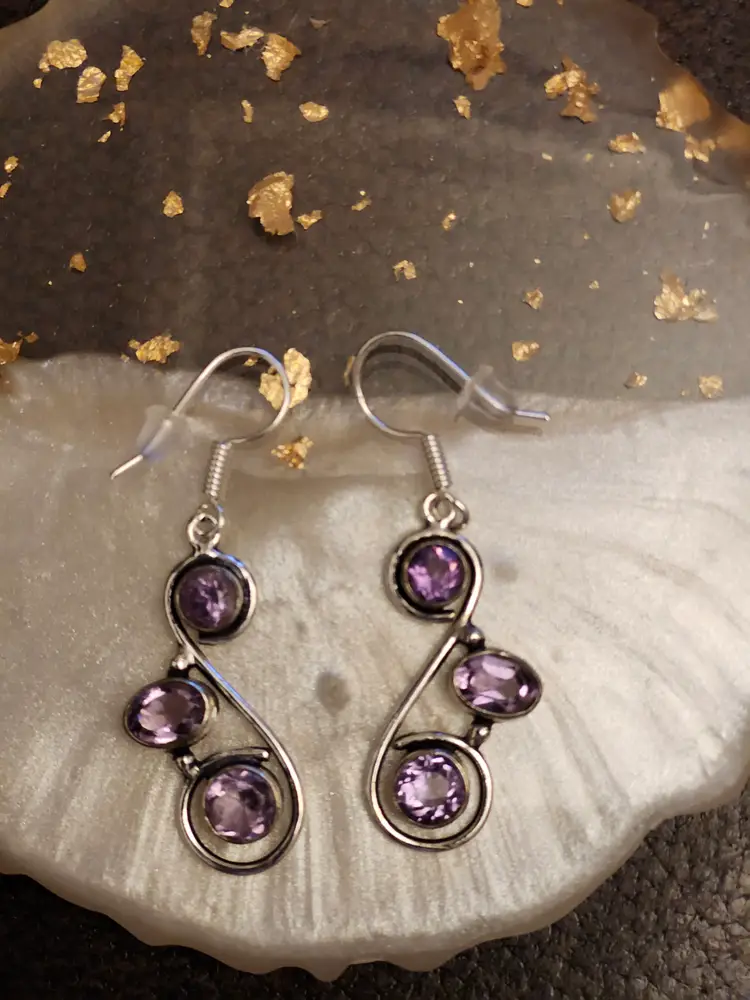 Elegant Amethyst Swirl Earrings Add a touch of sophistication with these handcrafted earrings featuring three faceted amethyst-toned stones set in graceful silver swirls. Lightweight and stylish, these earrings are perfect for both everyday wear and special occasions.