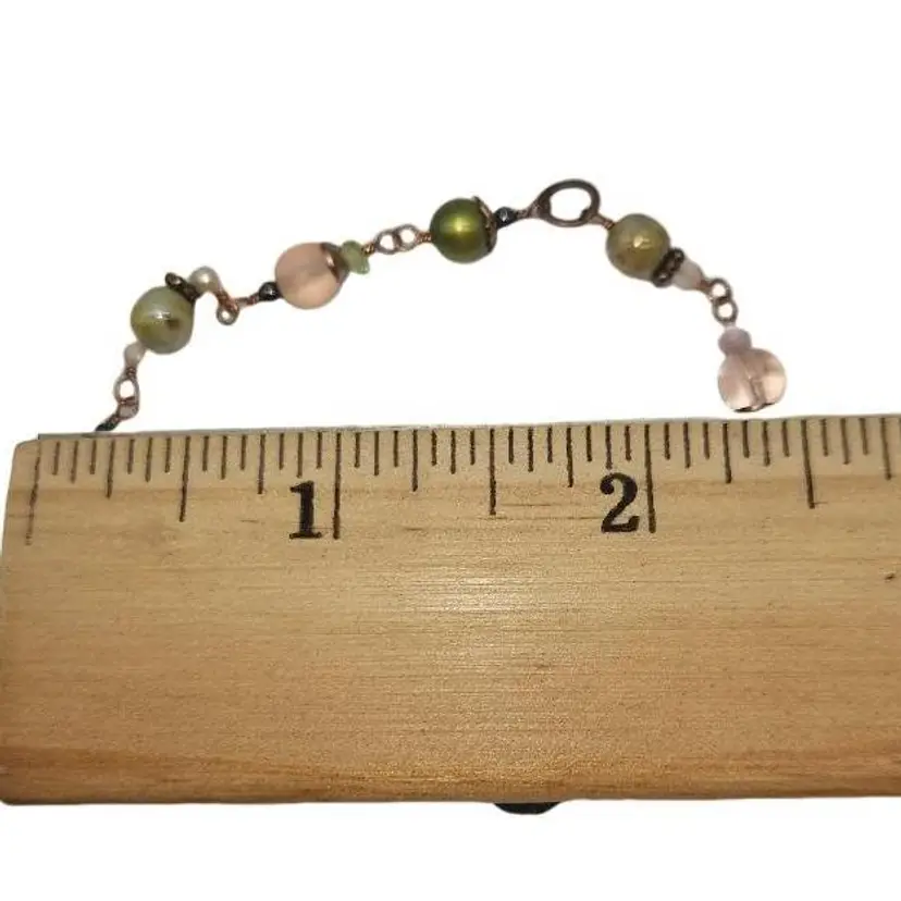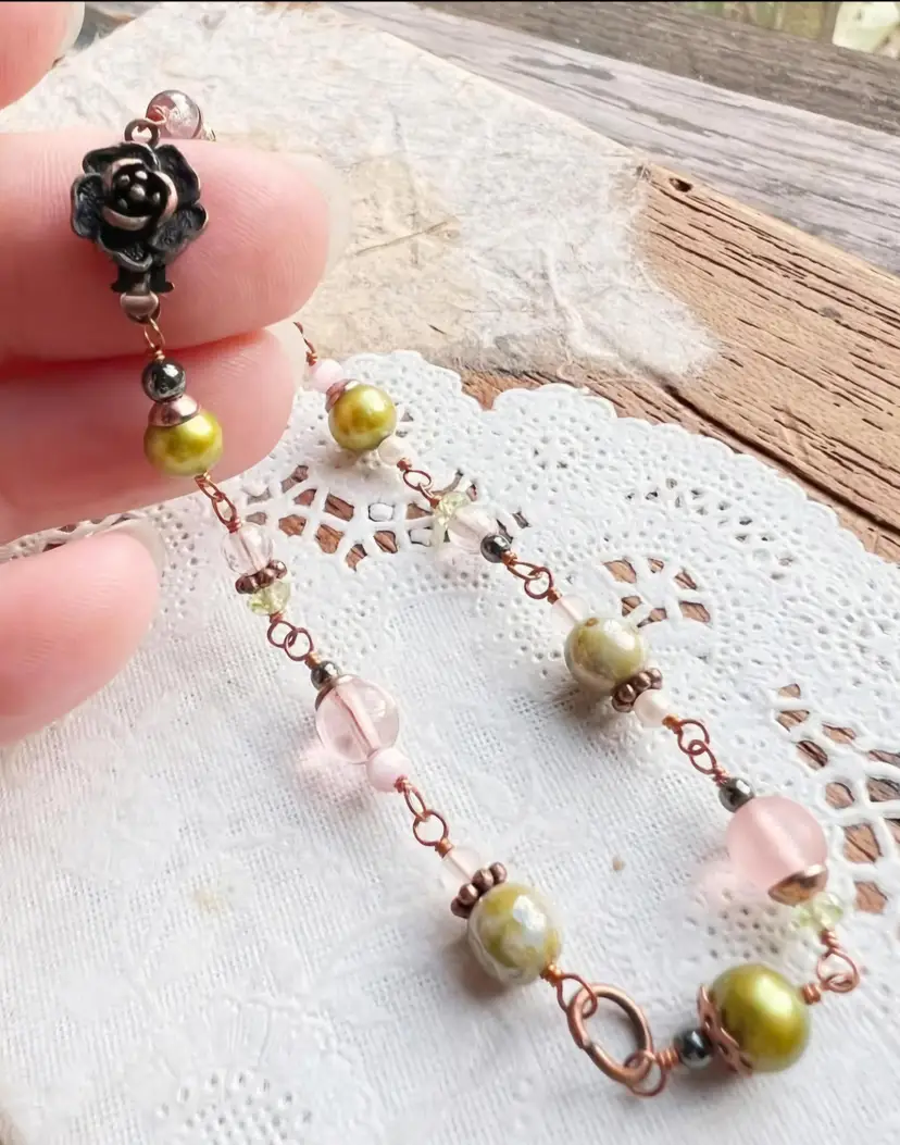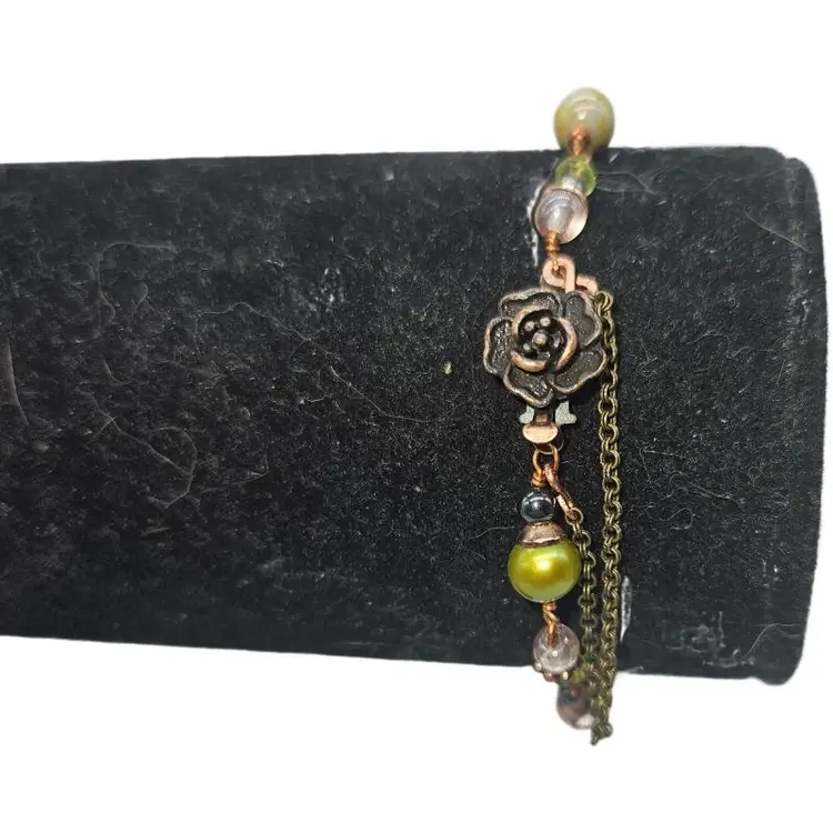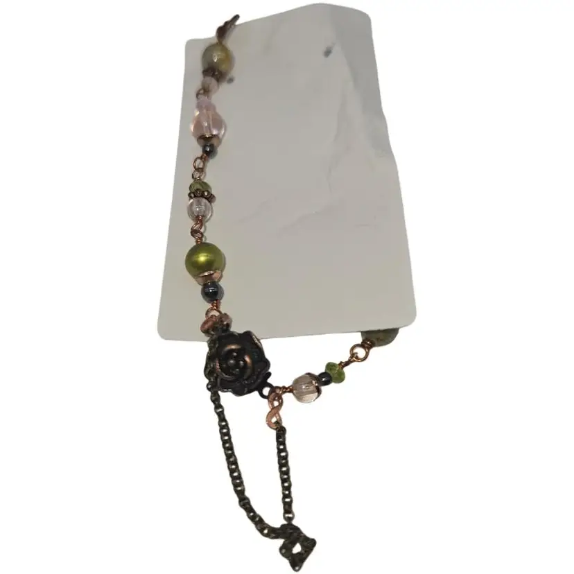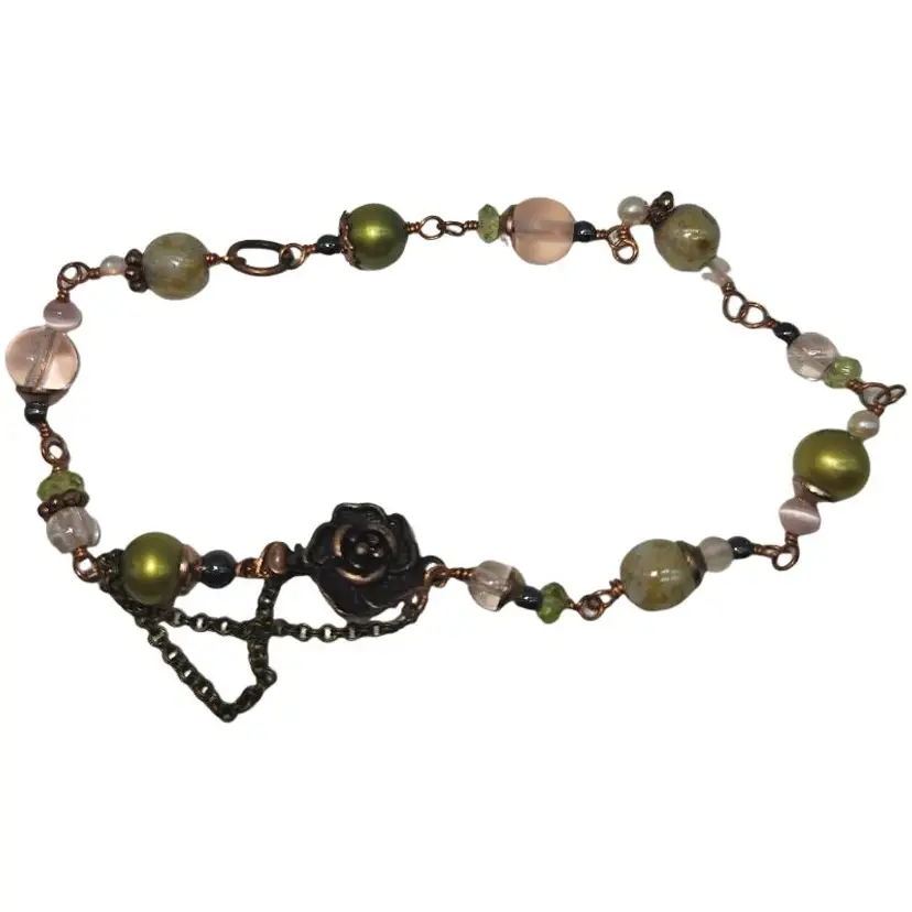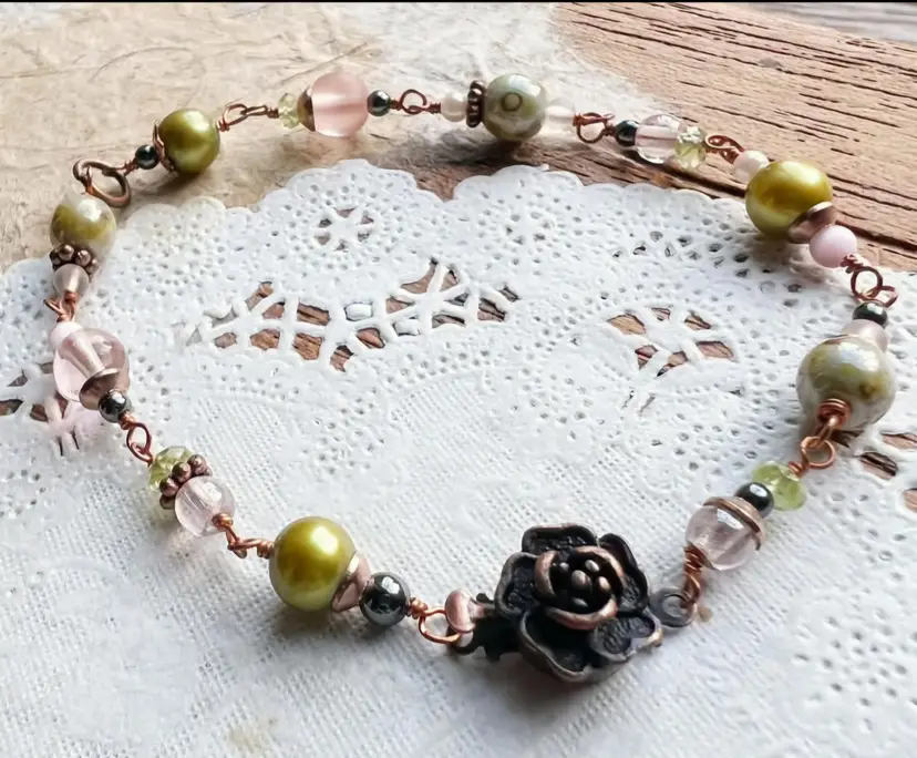 The cutest little romantic bracelet. Hand wrapped glass beads in pink and green with copper accents and a pretty rose clasp. Measures a fairly petite 7”.