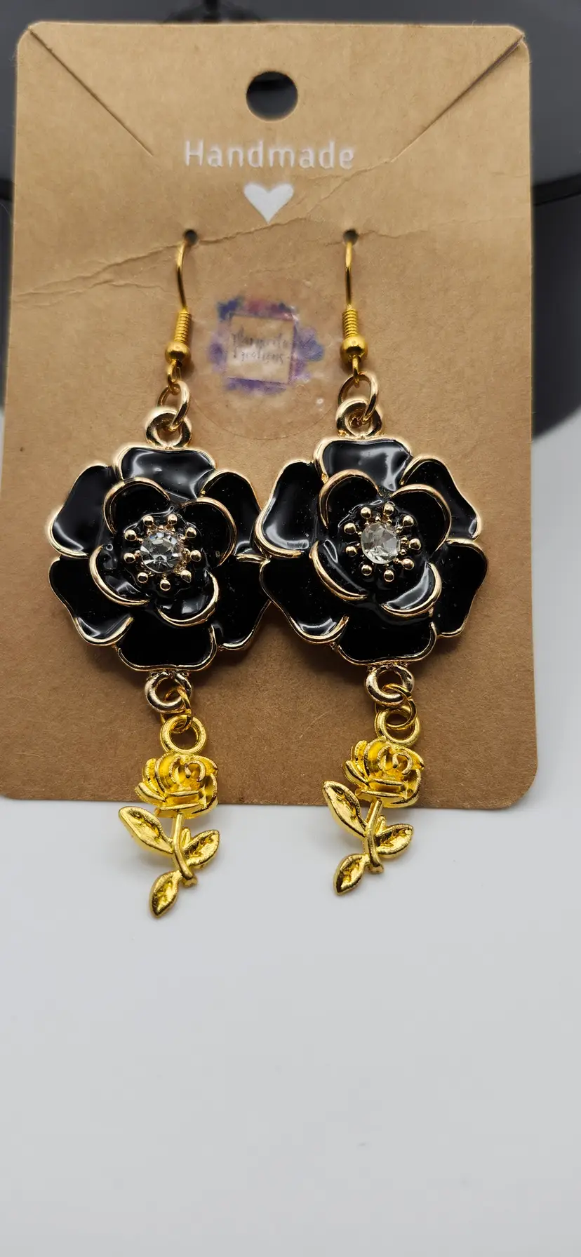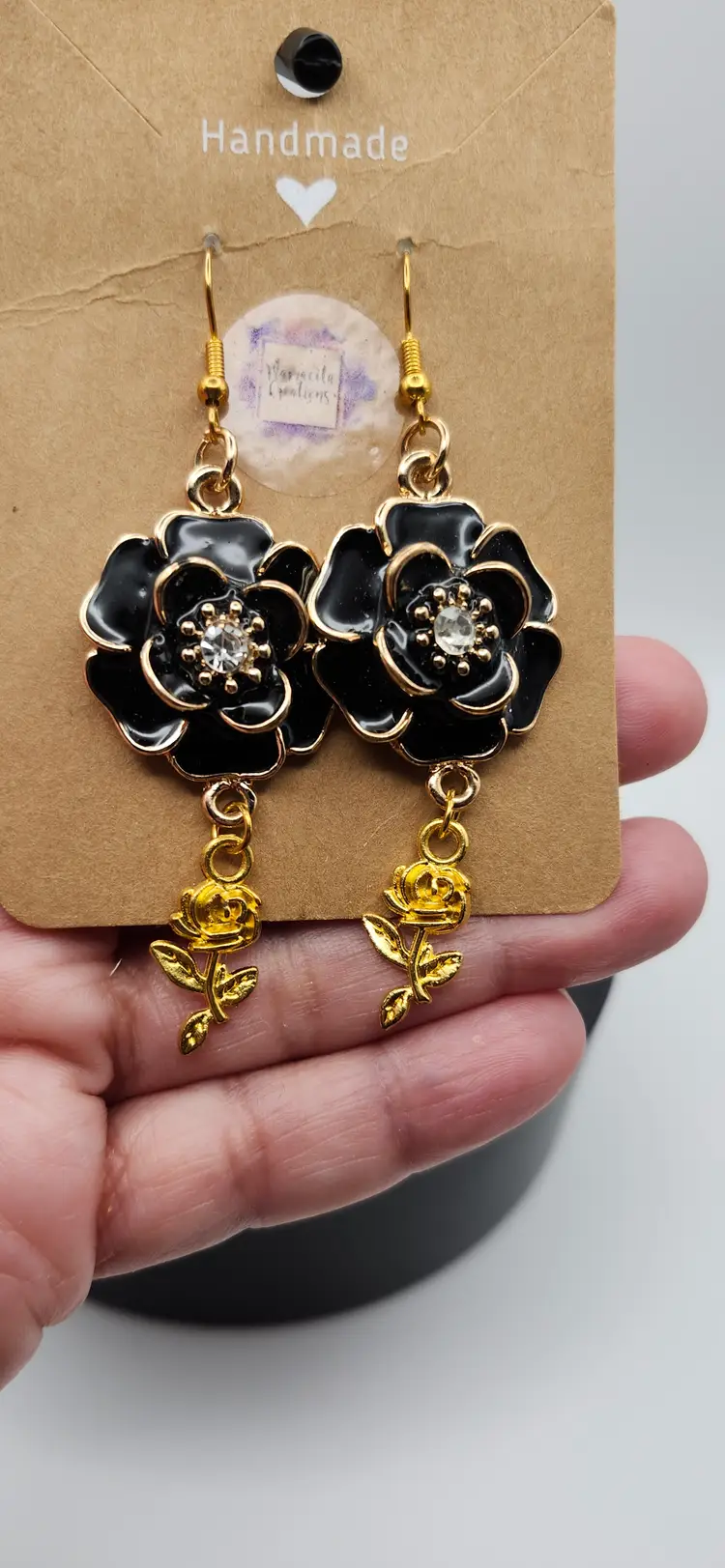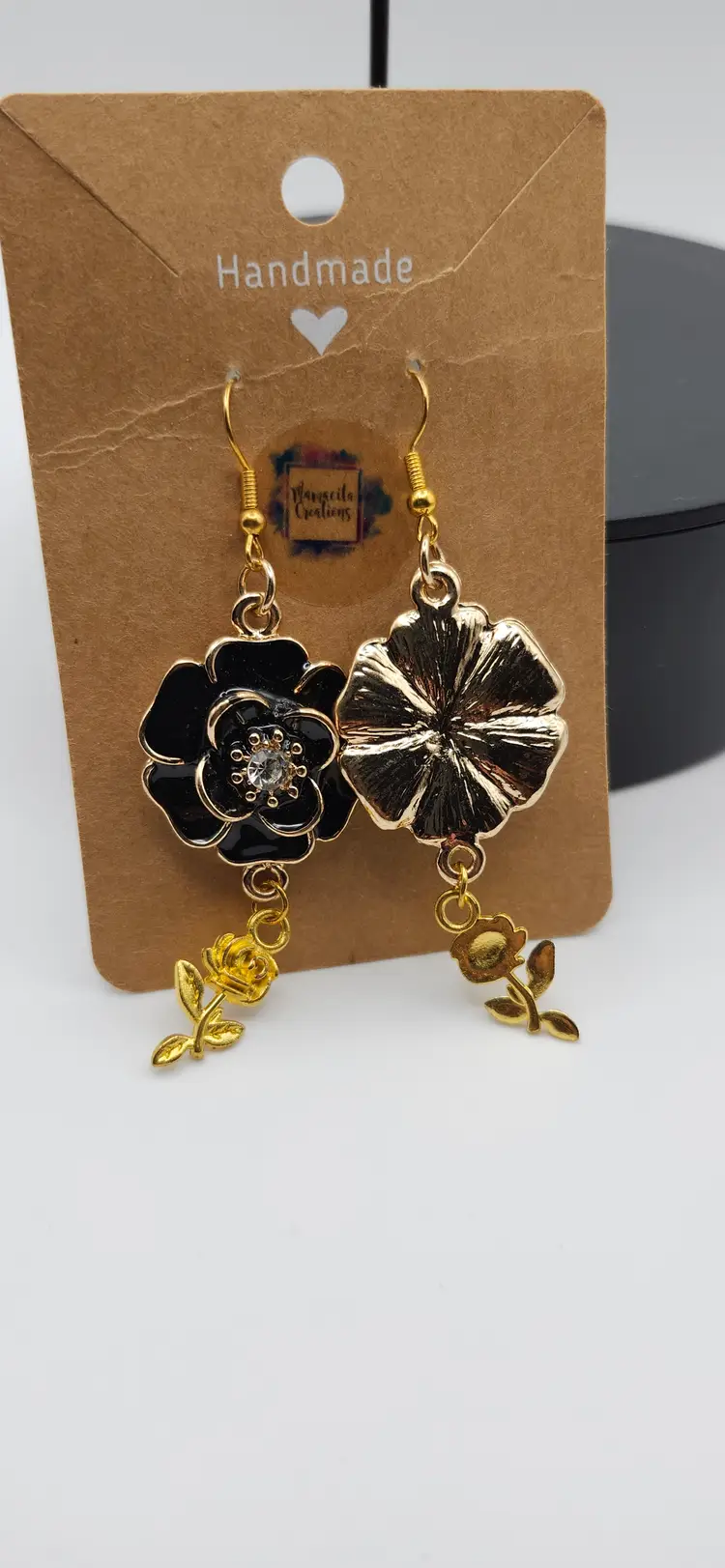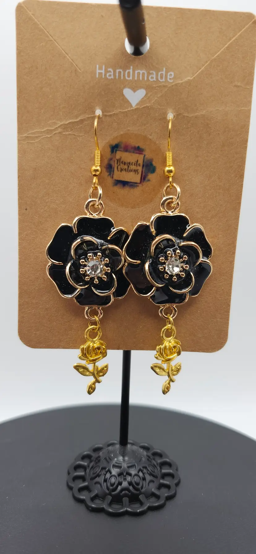 Make a bold and elegant statement with these handmade black and gold ose earrings. Featuring a glossy black enamel flower outlined in gold with a sparkling rhinestone center, each earring is finished with a delicate gold-tone dangling rose charm. Lightweight yet eye-catching, these earrings are perfect for special occasions or add touch Of floral glamour to your everyday style.