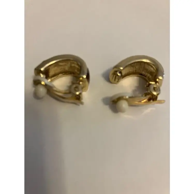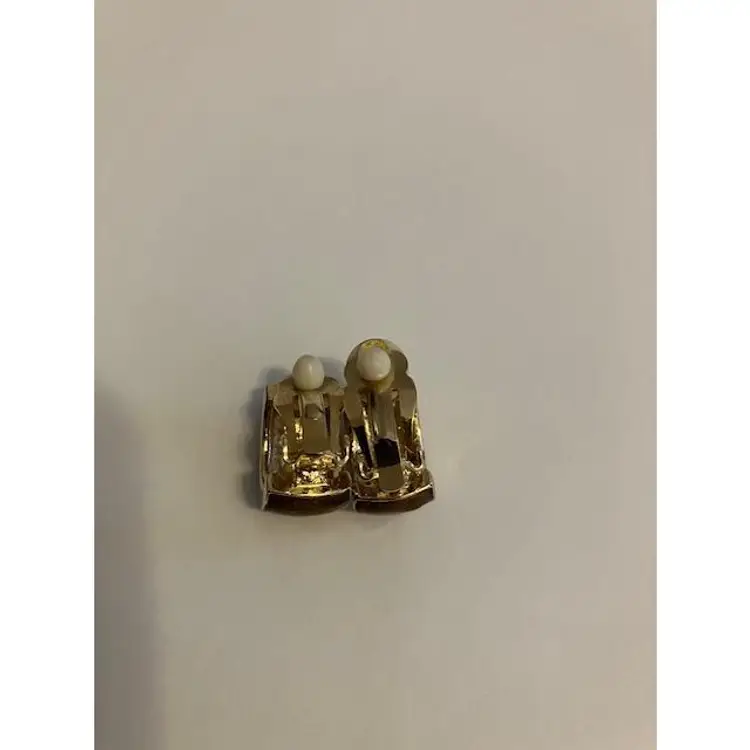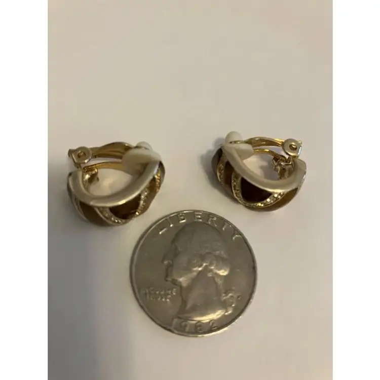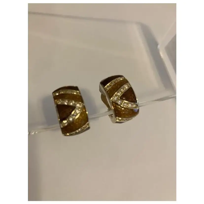 Sparkly rhinestones, brown & gold enamel with gold tone hardware and ear pads. They measure 3/4" x 1/4". Dainty and well made.