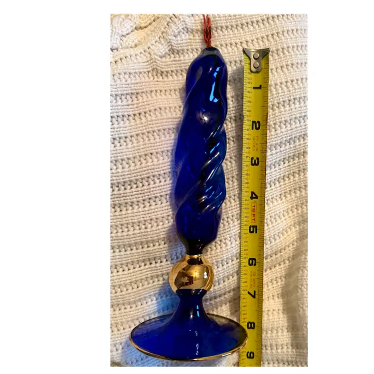 This stunning glass art sculpture features a beautiful blend of blue and gold hues.