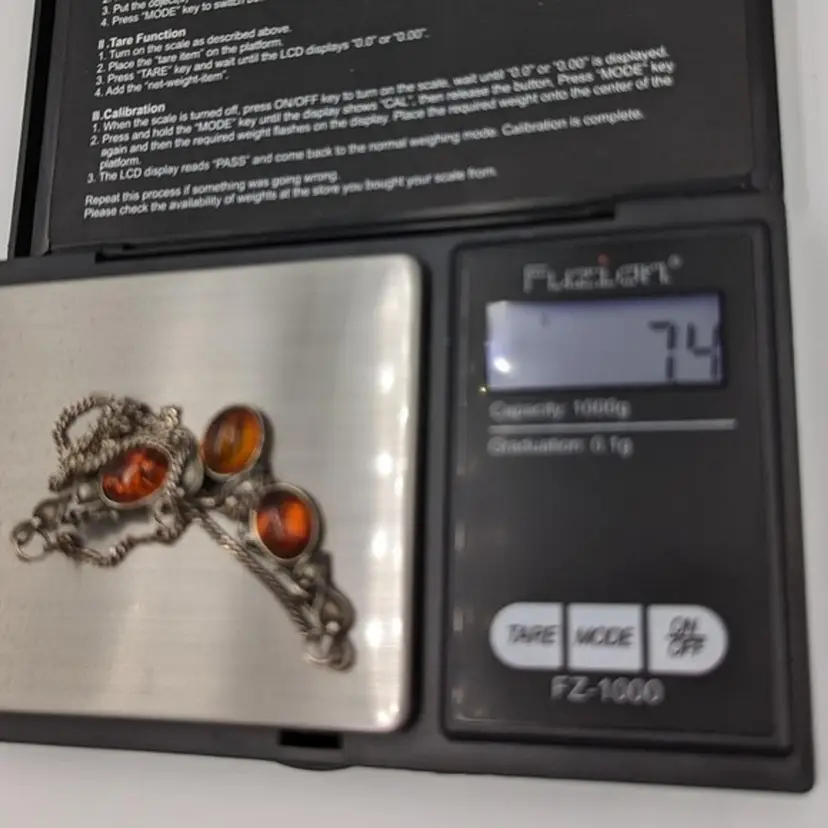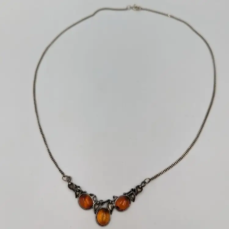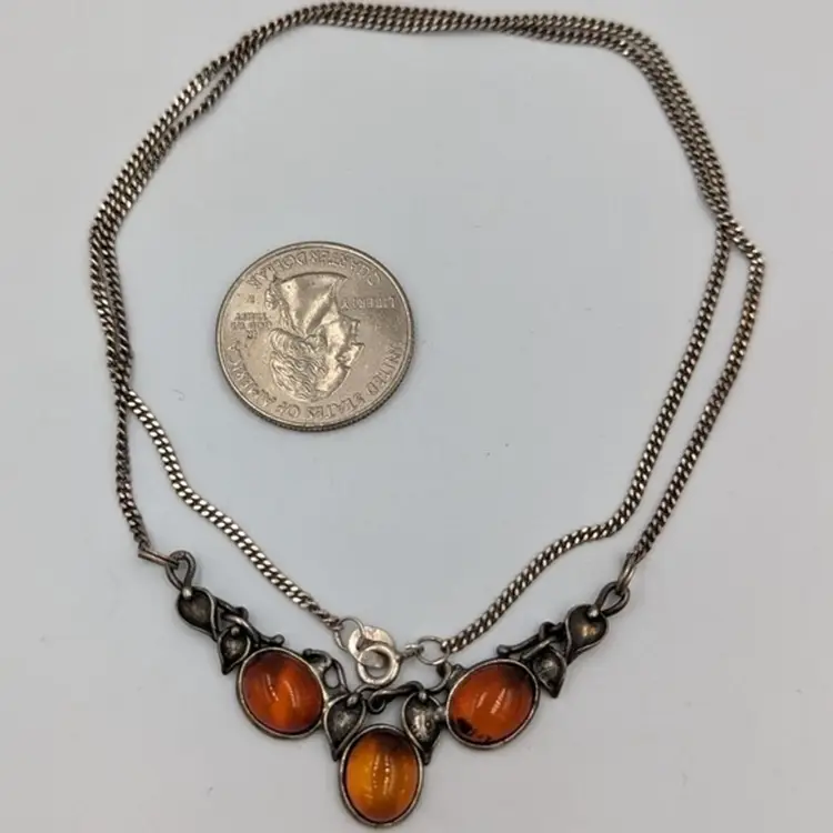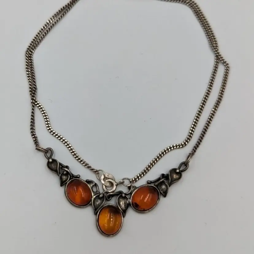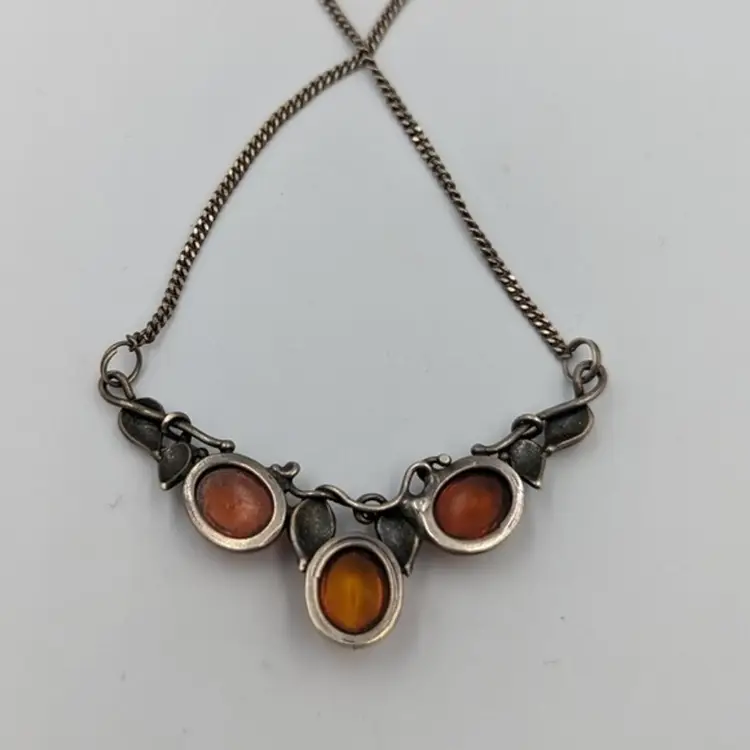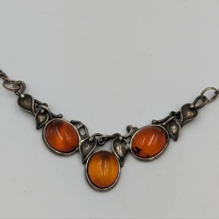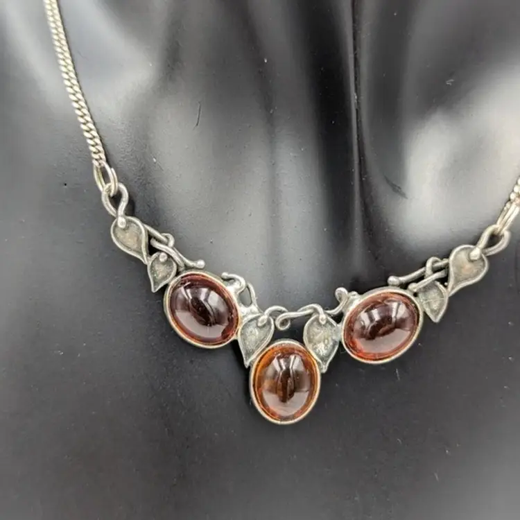 Elegant Cognac Color Baltic Amber Sterling 925 Art Nouveau Style Necklace 20" Marked 925 Art 7.4 grams total weight 20" long Spring ring clasp Good pre-owned condition