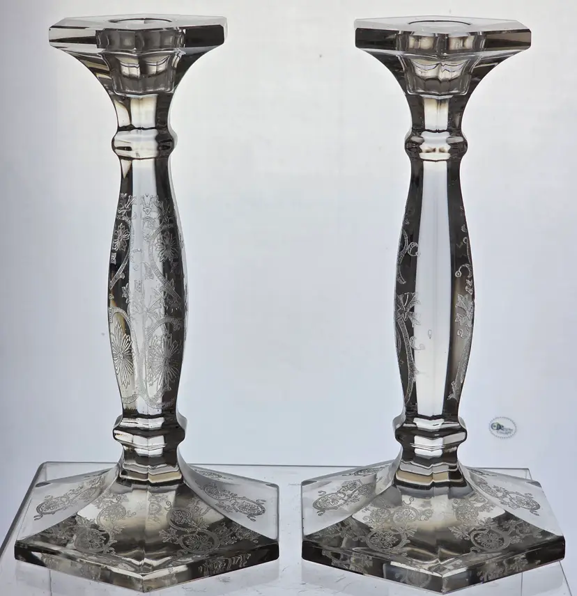 Pair of exquisite crystal candlesticks featuring intricate etched patterns. Each stands approximately 10 inches tall, perfect for adding a touch of elegance to any setting.