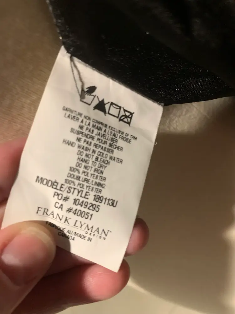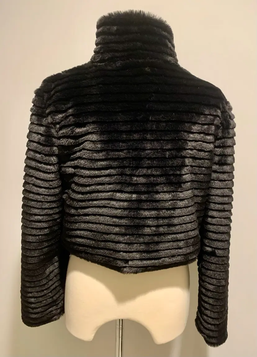 Frank Lyman: Women's Black Faux Fur Crop Jacket w/Brooch. 100% Polyester, Hand Wash Cold Made in Canada. Smoke free Measurements taken across flat garment Sz Sm: Shoulder 17", Bust 18", Length 17.5", Sleeve 24" Sz Lg: Shoulder 18.5", Bust 19", Length 19", Sleeve 25" *All Sales Final