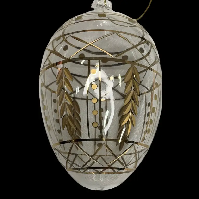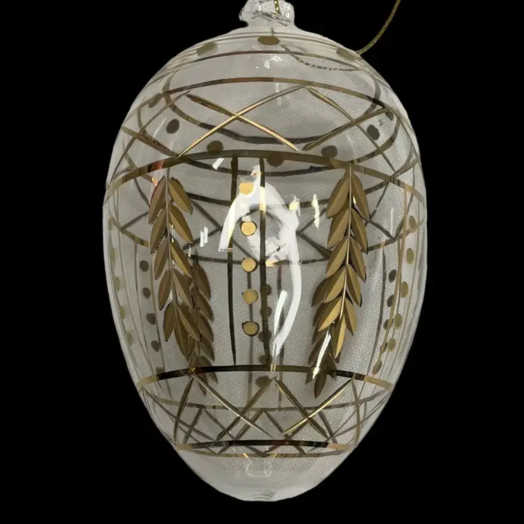 This stunning glass egg ornament features intricate gold detailing, perfect for adding a touch of elegance to your holiday decor. a7