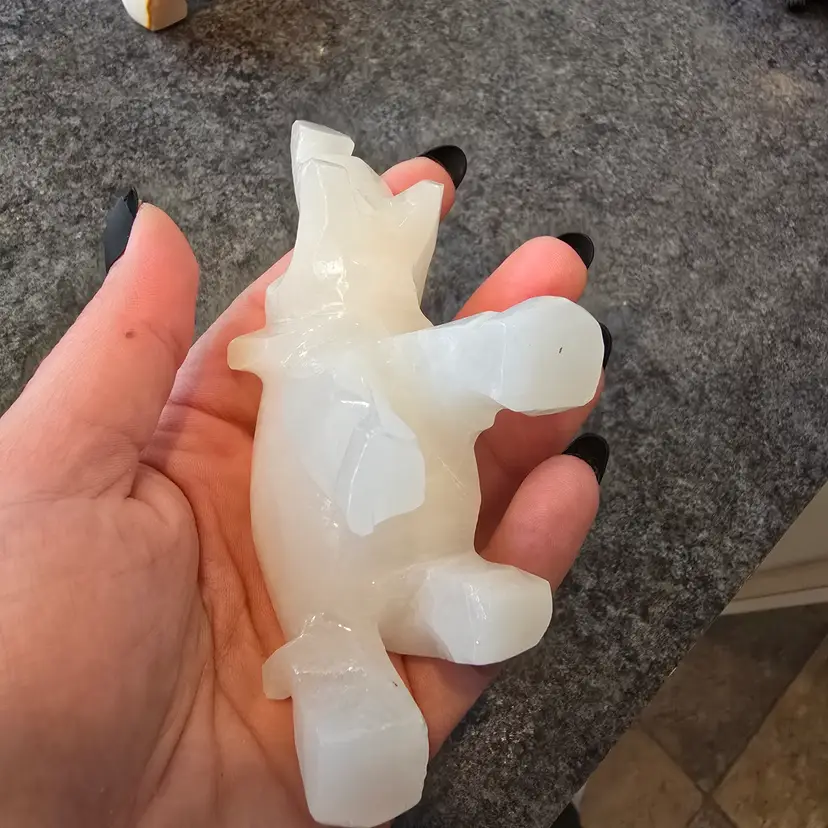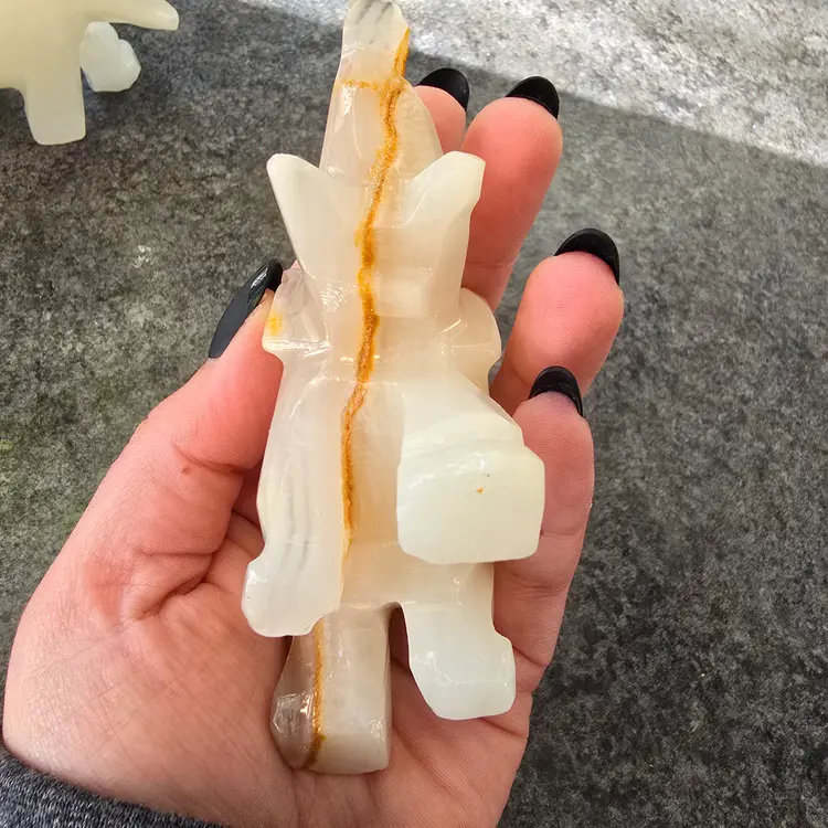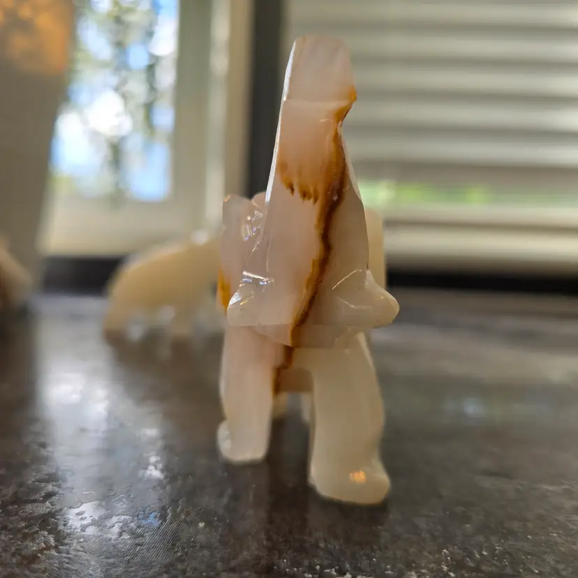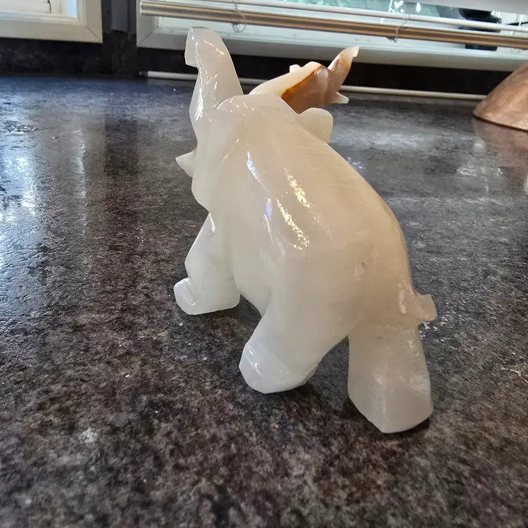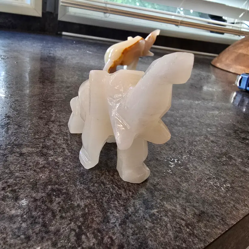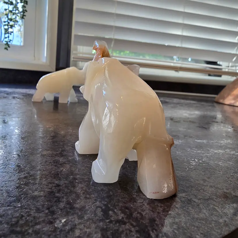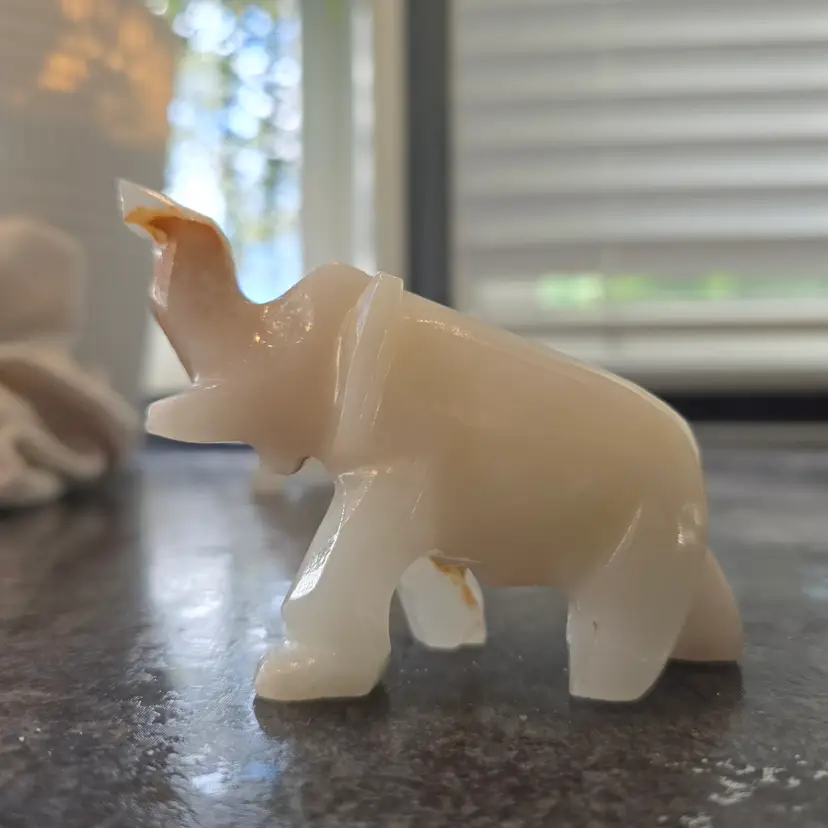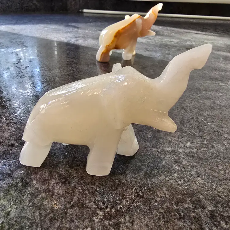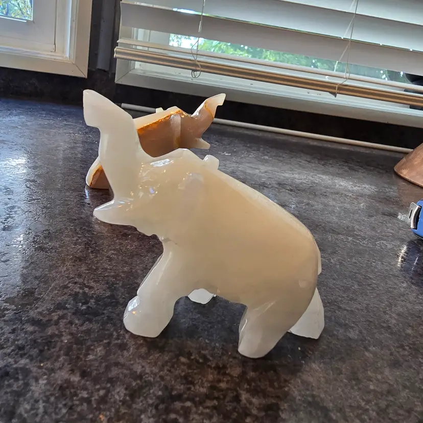 Unique hand carved elephant figurines made out of onyx. This listing is for the pair (2) of elephants. Enhance your home decor with these elegant cream and tan elephant figurines. Perfect for adding a touch of sophistication to any room. Each measures 4" x 1.5" x 3"
