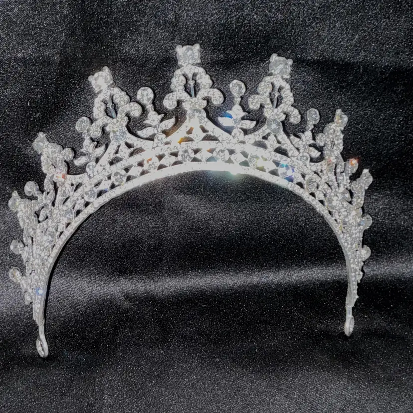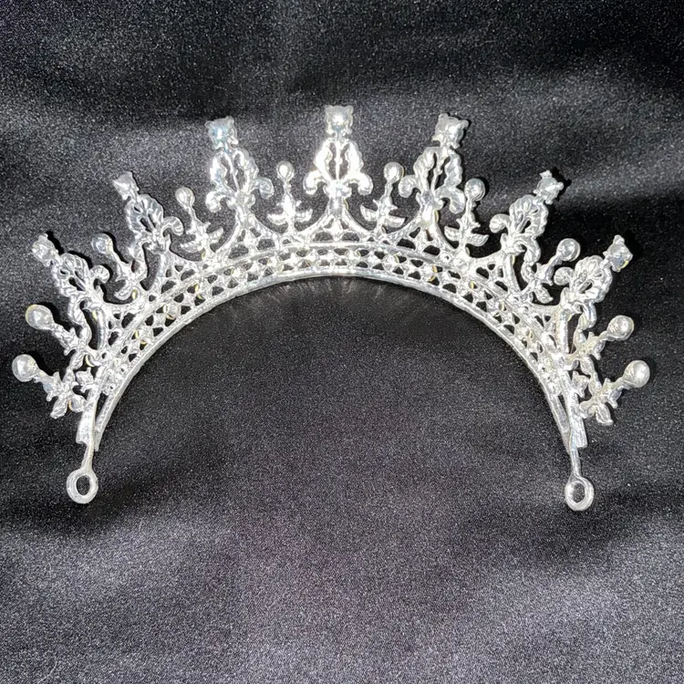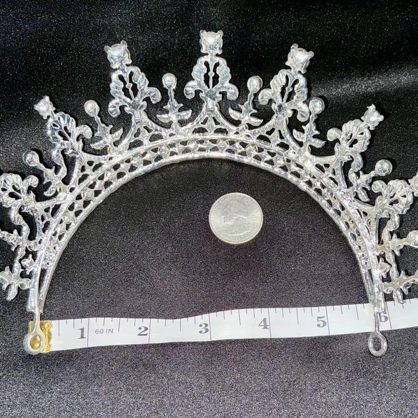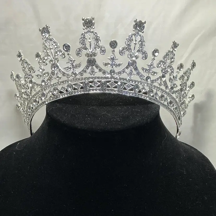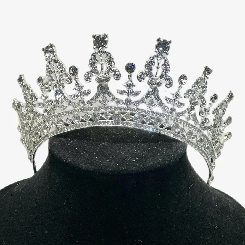 Elegant silver tone rhinestone tiara with a classic royal silhouette.