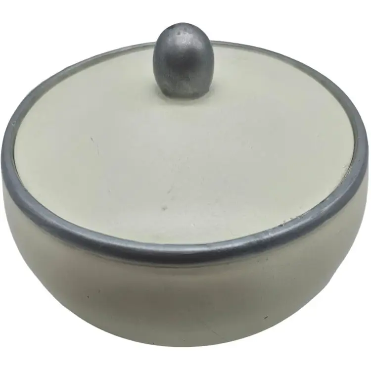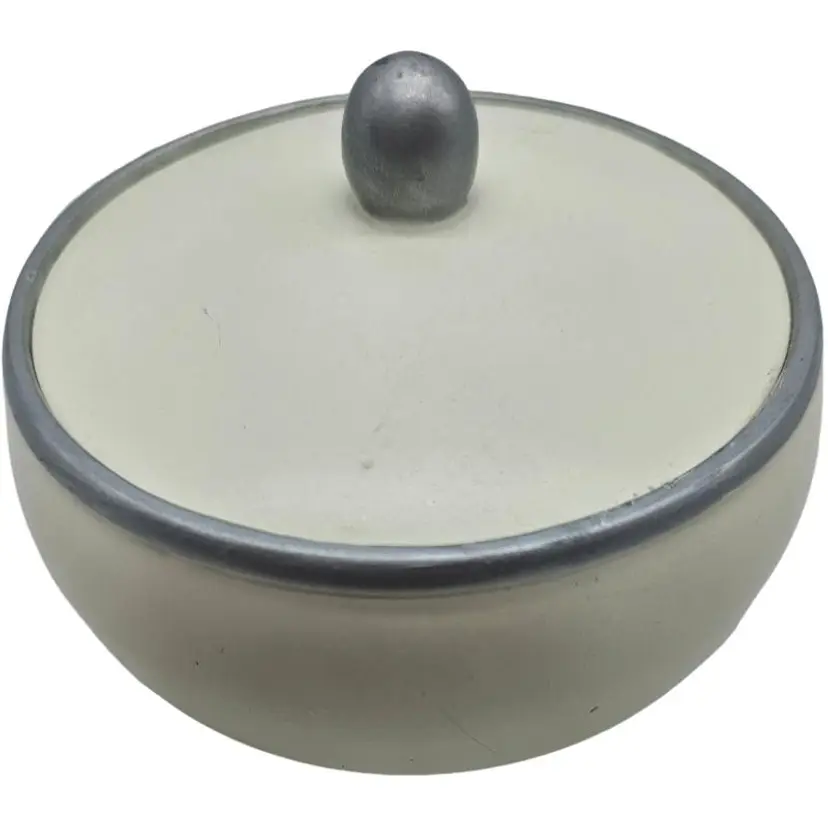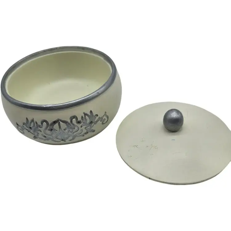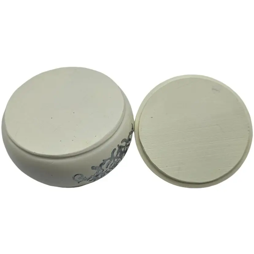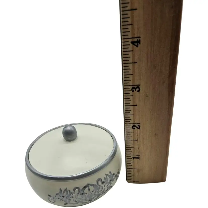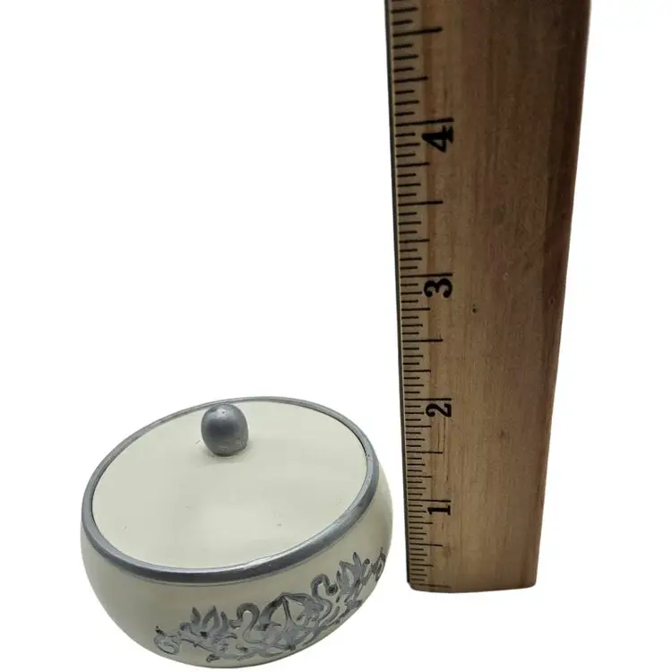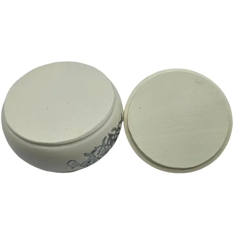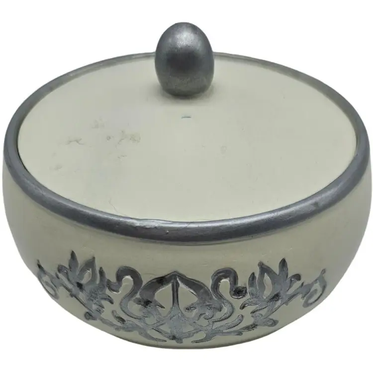 Round decorative box with intricate silver detailing. Perfect for storing small items. Adds a touch of elegance to any space.