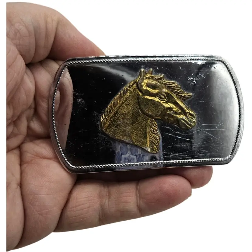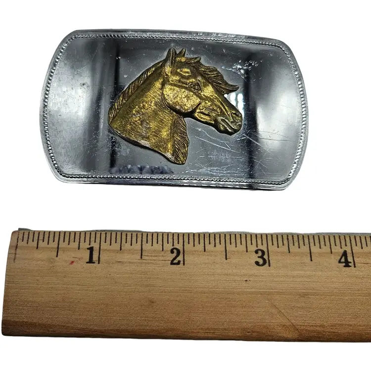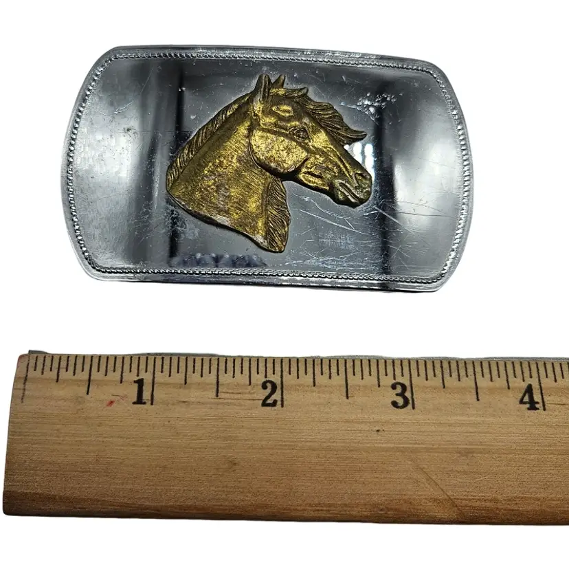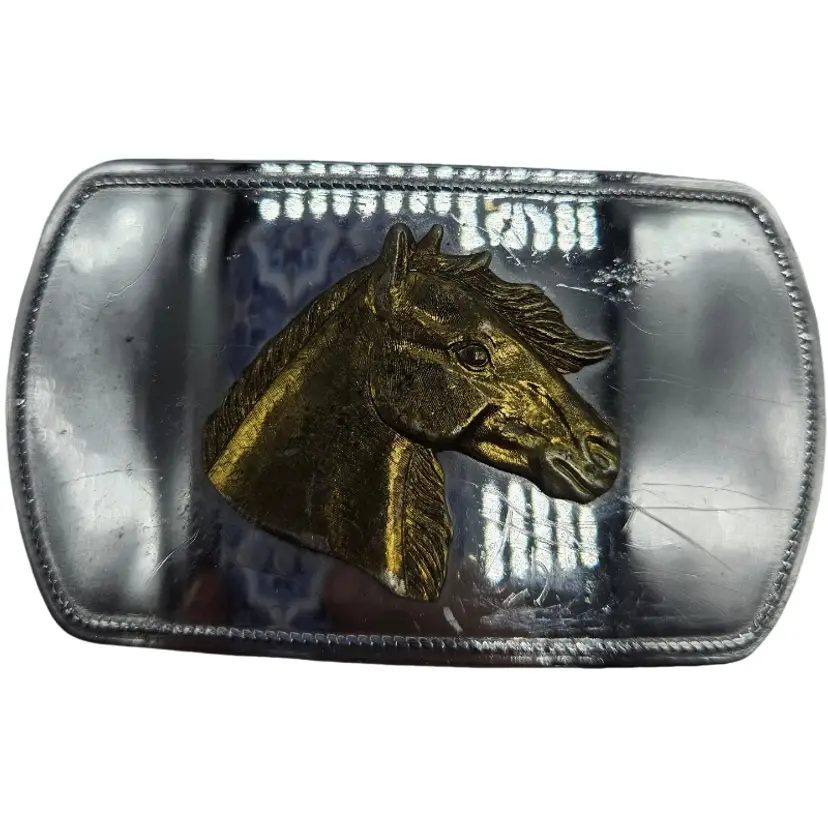 a horse head belt buckle, featuring a detailed horse head design in gold-toned metal set against a silver-toned, rectangular background.