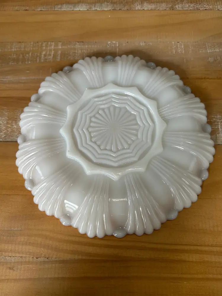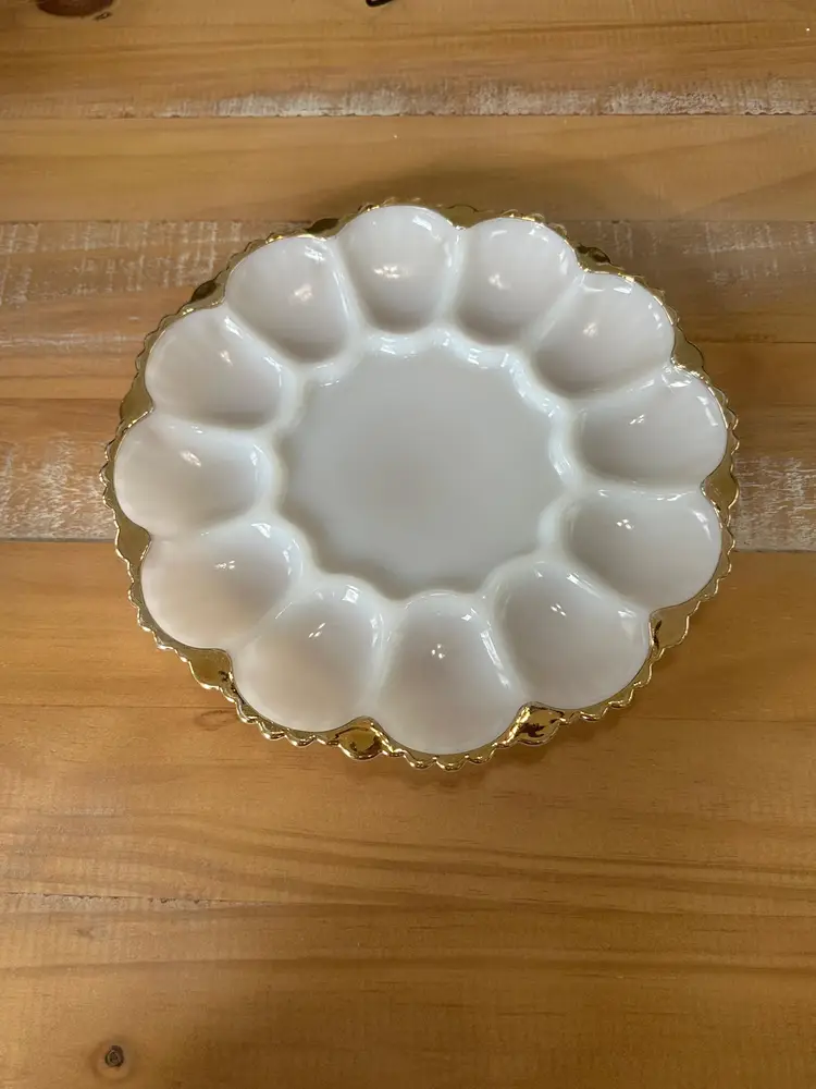Elevate your dining experience with this exquisite vintage milk glass bowl, adorned with a sophisticated gold trim. Its scalloped edges and lustrous finish make it a stunning addition to any table setting or collection. W: 10" H: 1"