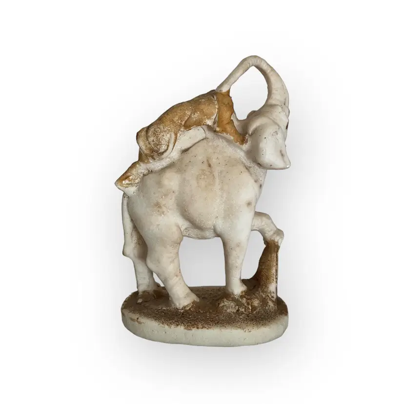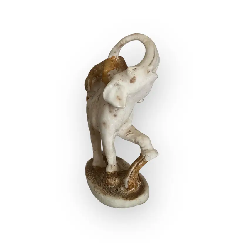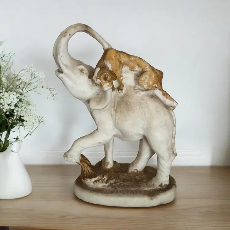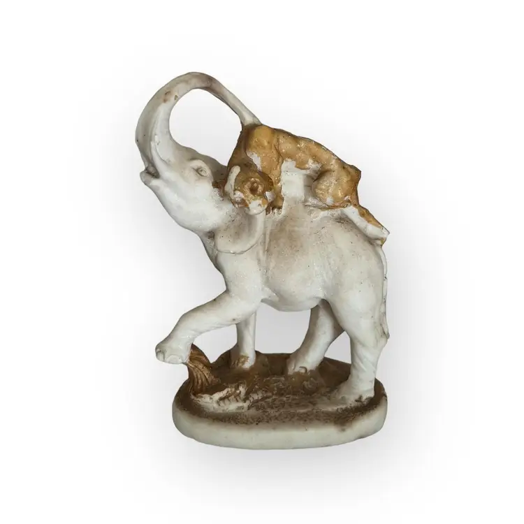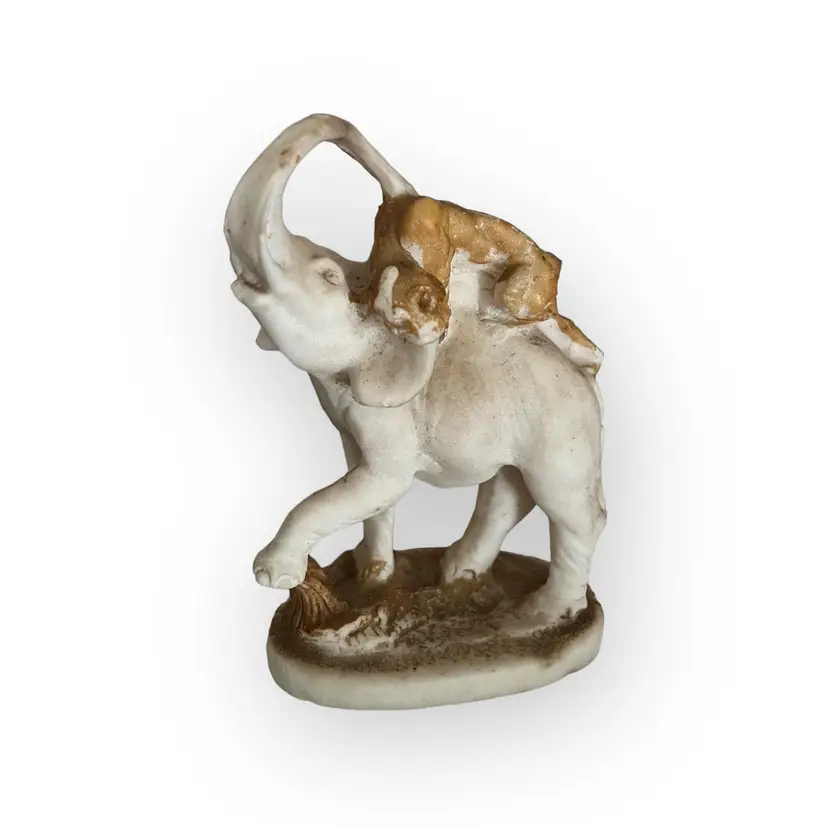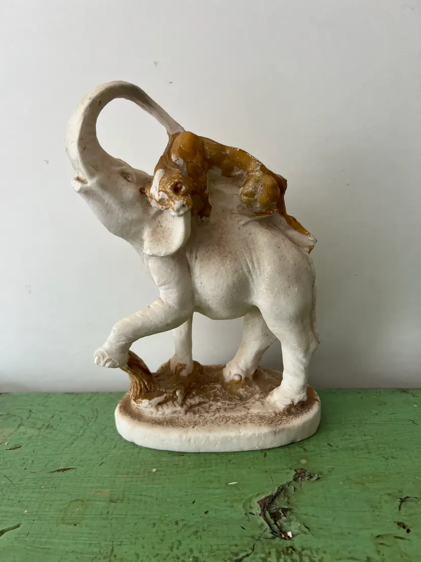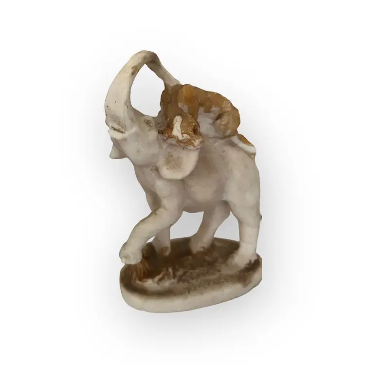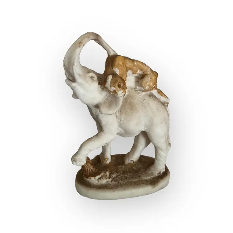 Beautiful hand carved stone statue of a lion (or panther) attacking an elephant. I believe this to be marble Approximately 8" tall. The statue is unmarked. There is wear to the coloring on the ground and lion. There are a few notable chips on the bottom lip of the elephant, the tail and back foot of the lion, the elephants foot etc. These may have happened when the statue was carved. SO unusual! I cant find another like it!