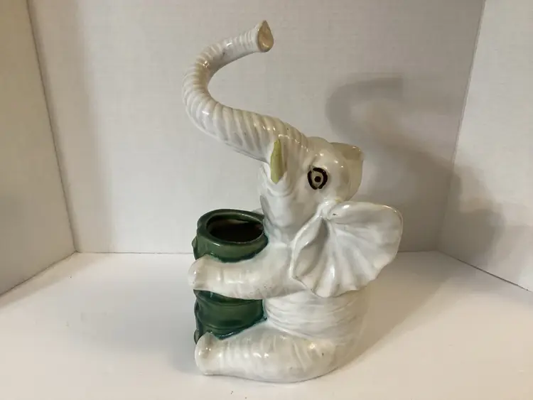 Lucky elephant planter. Trunk held high in the air. 12@x7” planter opening 2.5”