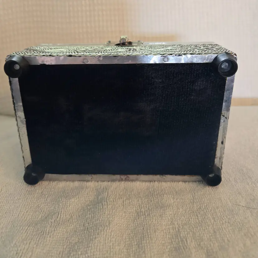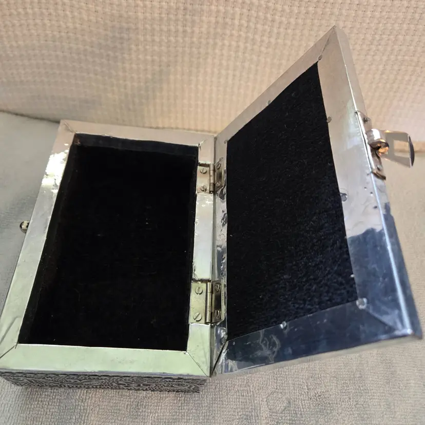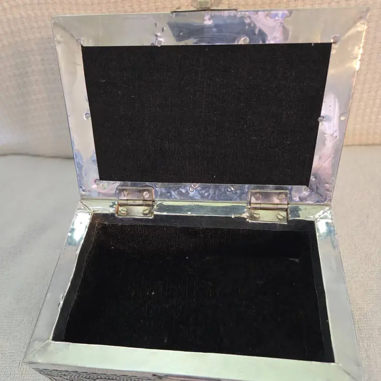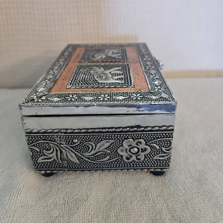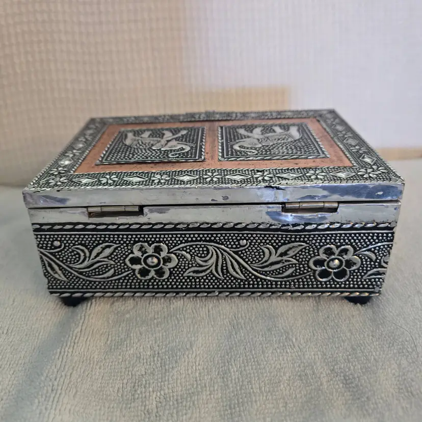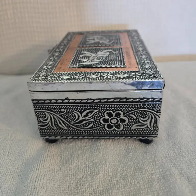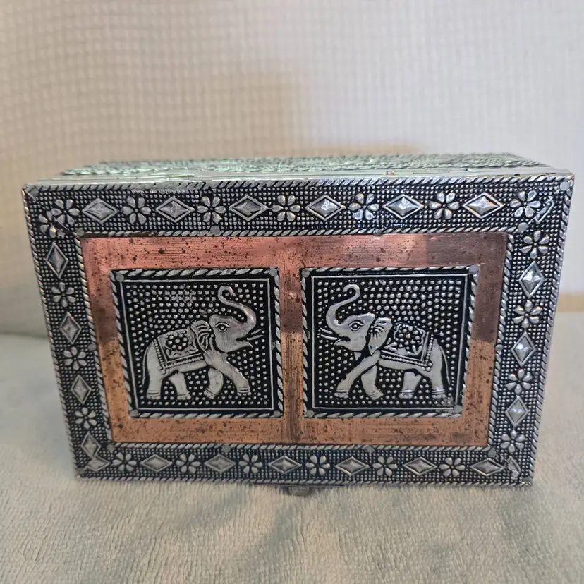 Beautiful jewelry box probably made in India. Features 2 embossed elephants on top with floral designs. Made from aluminum with copper accents on the lid. Great for jewelry or keepsakes. Measures 21/2" tall and 6" wide. , 4" from front to back. In great condition showing normal wear. It also has a pretty black lining inside.