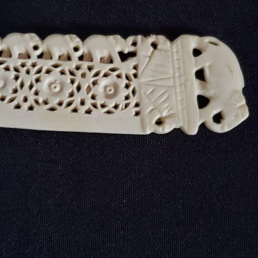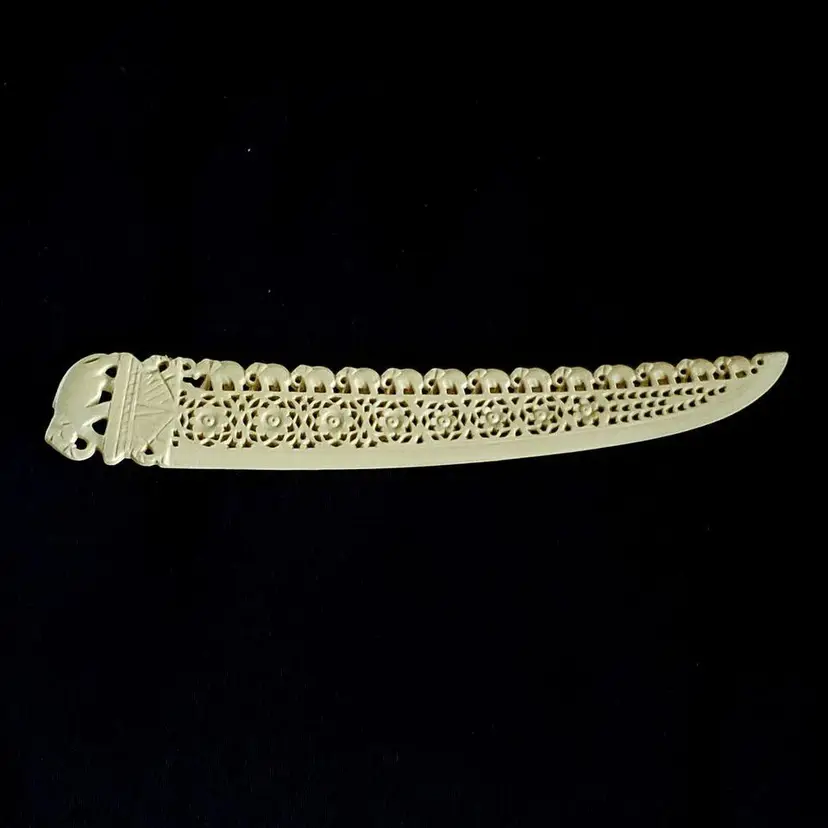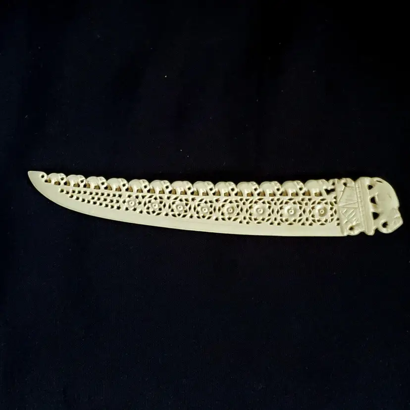 Vintage Elephants Letter Opener Celluloid Plastic 7” Ivory Toned Carved Design. Used condition with slight warp, dirt, scuffs, scratches, edgewear, etc. Please view all the photos and read the entire item description and please ask any questions prior to purchase when possible.