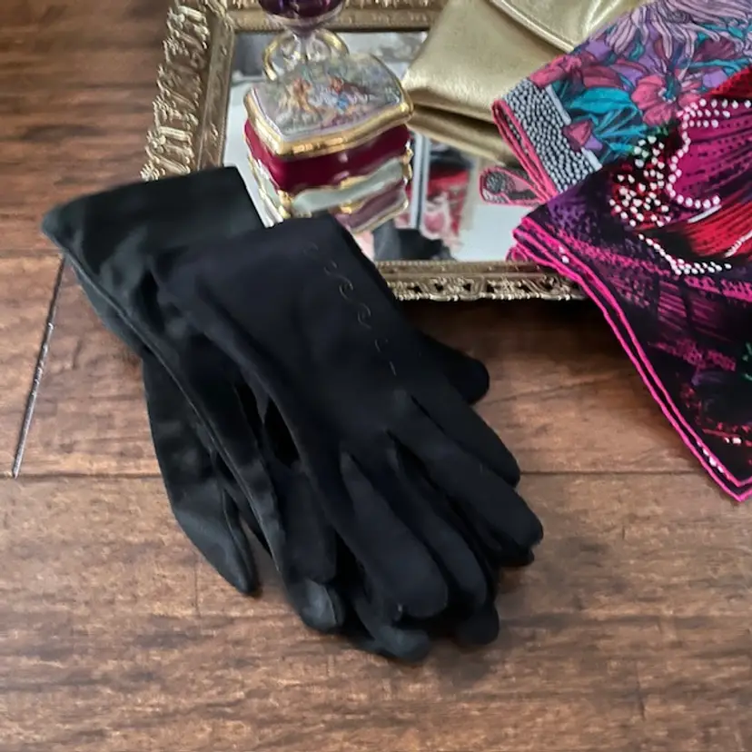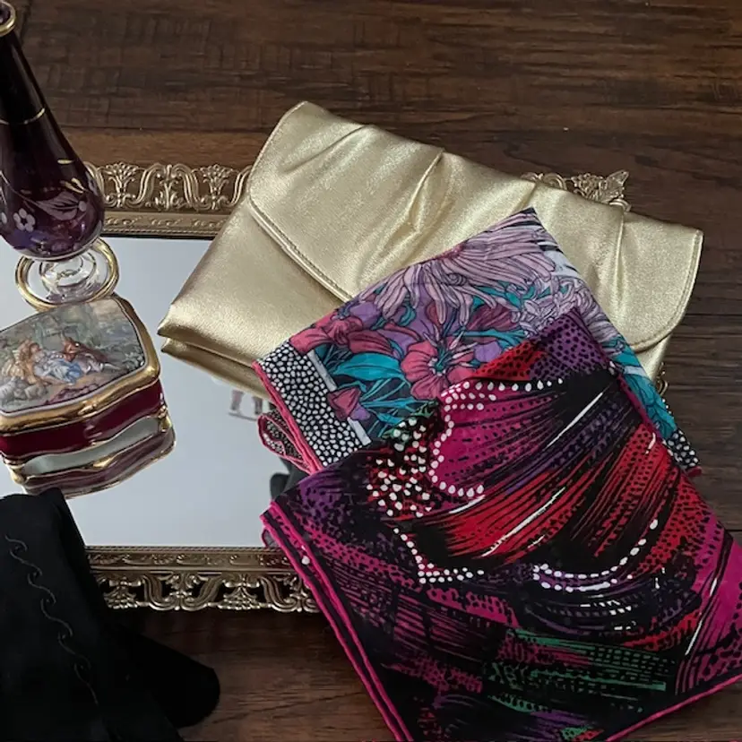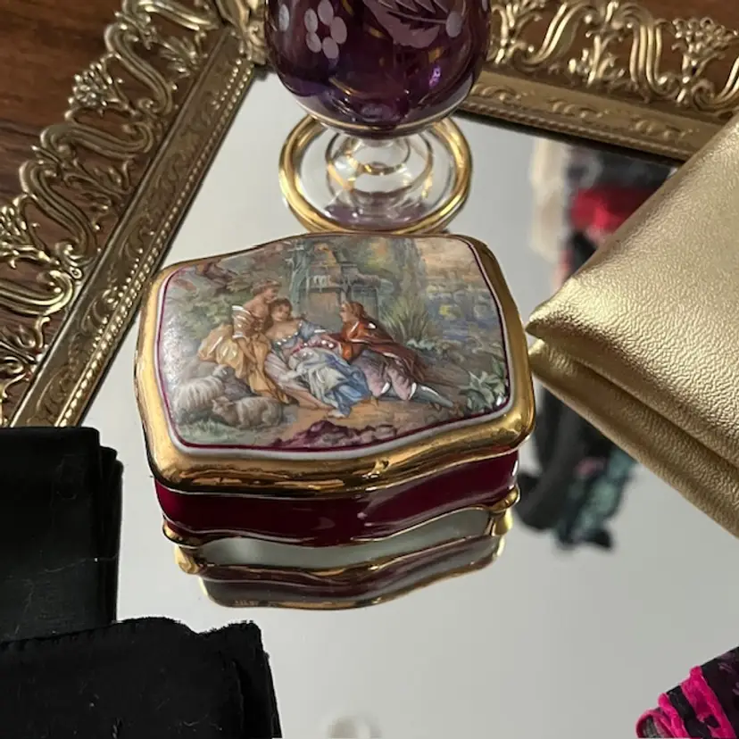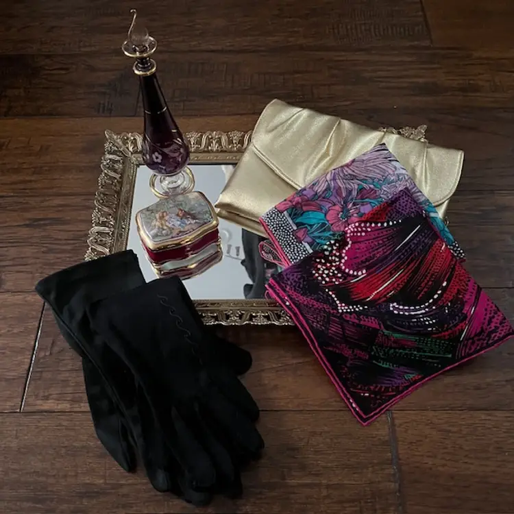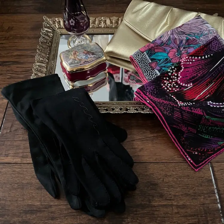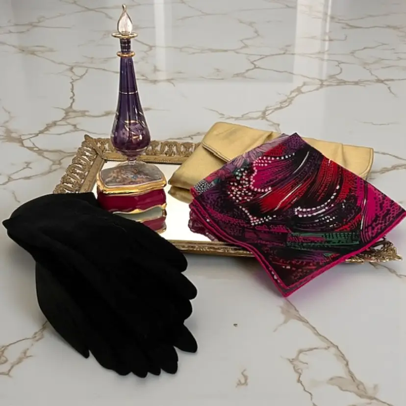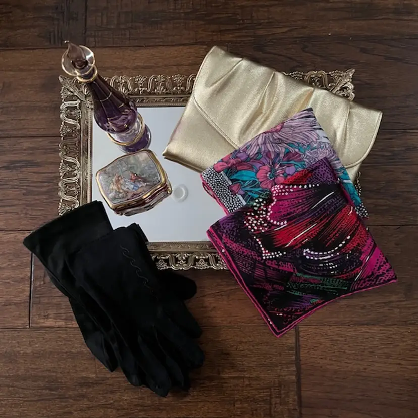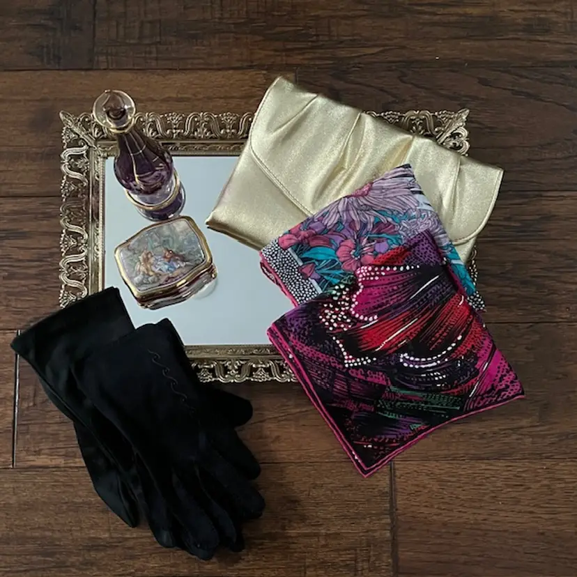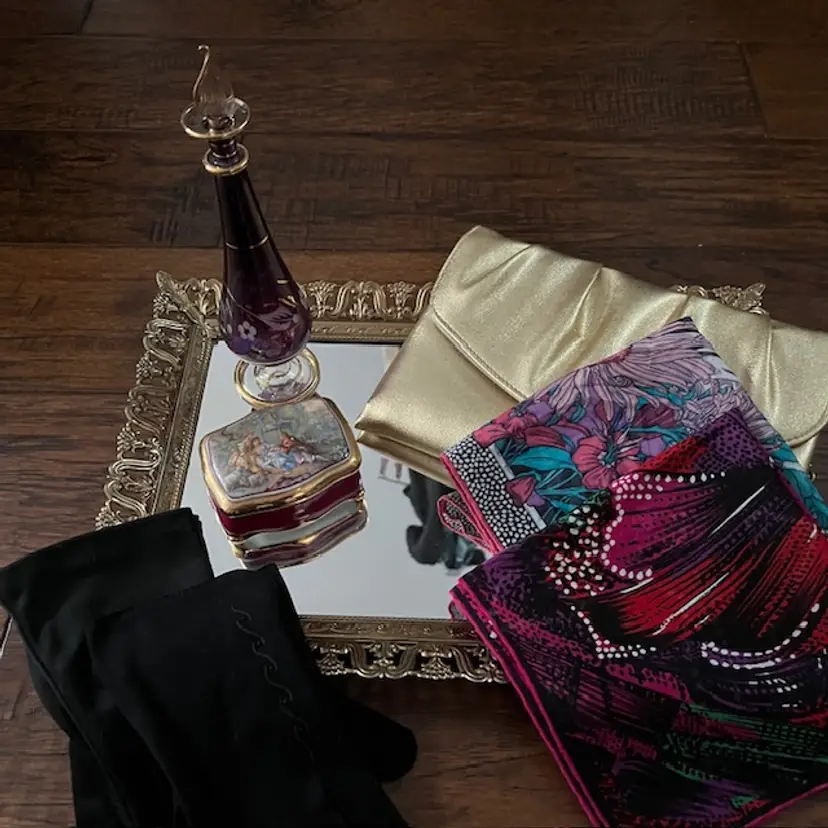 Included: MCM Mirrored Vanity Tray Egyptian Perfume Bottle Limoges "Courting Couple" Trinket Box VTG Gold Clutch Purse Choice of 1 Hankie Choice of 1 Pair of Vintage Black Gloves