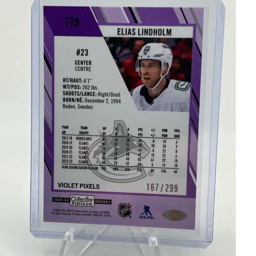 Elias Lindholm 2023-2024 O-Pee-Chee Platinum Violet Pixels Parallel 167/299 Vancouver Canucks. Shipping is $1.00 for the first card, +0.50 for additional cards, and ships PWE within 1-2 days.