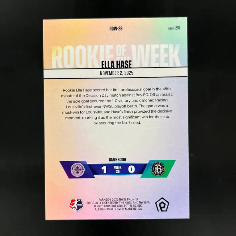 Ella Hase 2025 NWSL Parkside Pronto Rookie Of The Week Subscriber Exclusive /210 Soccer Card #ROW26