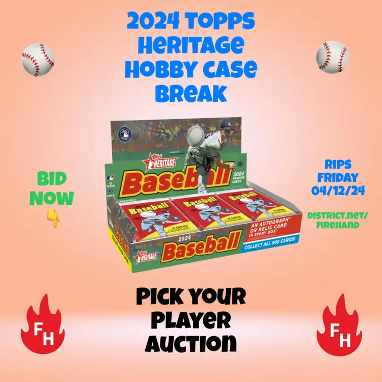 You are bidding on the cards of the player listed in the title in this Hobby Case of 2024 Topps Heritage Baseball Cards (12 Hobby Boxes per case). Case will be opened LIVE after auctions end (apx. 8 PM PST) on Friday, 04/12/2024 on our YouTube channel (https://www.youtube.com/channel/UCETc4FyfADGzg3vTTww-Qew). US Shipping is $5 for your first auction spot won and only $.25 per each additional spot you win! Any spot won where no cards of the player are found in the box will receive a bonus card or pack from Firehand Cards. Any hits pulled (Cut Signatures, Hidden Gems etc.) of a player who is NOT listed in the auction will be assigned by draw between all participants. Any dual or multi-auto & relic cards featuring multiple players will be randomized live between the spots depicted on the card. NOTE - team names are provided for search purposes only - it could be possible that the player listed now plays for a different team or has a different team on the card, you will still get ALL the cards associated with this player.