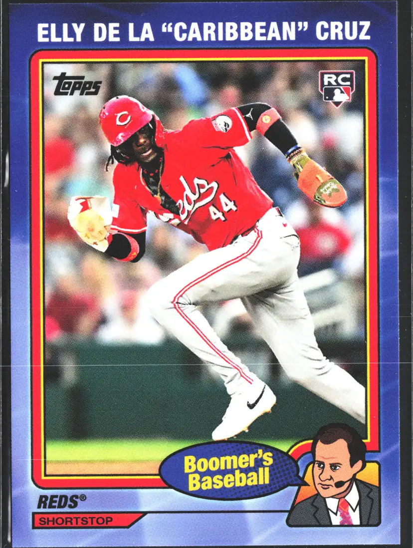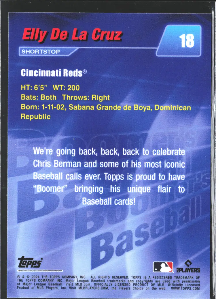 1st time buyer? Get $5 Off with code DISTRICT5 at checkout! Card as shown. All cards $20 and under ship PWE via lettertrackpro [https://www.letter-track.com/registerap.asp?AFID=8757] Manufacturer: Topps Player/Athlete: Elly De La Cruz Team: Cincinnati Reds Type: Sports Trading Card Sport: Baseball Set: 2024 Topps x Chris Berman Boomer's Baseball Parallel/Variety: Nickname Parallel Features: Rookie Autographed: No Year Manufactured: 2024 Vintage: No Graded: No Autograph Authentication: Topps Season: 2024 League: Major League (MLB) Material: Card Stock Original/Licensed Reprint: Original Country/Region of Manufacture: United States Card Condition: Near Mint or Better