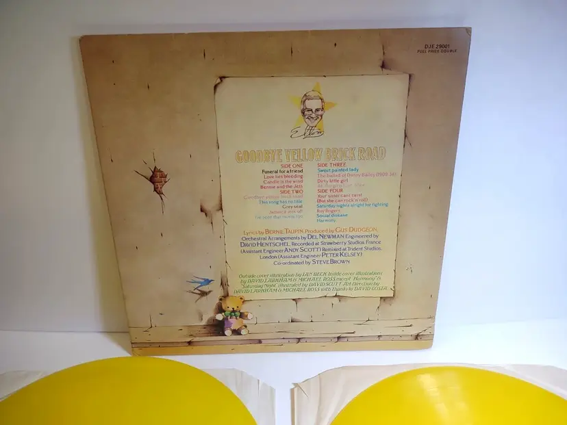 Artist: Elton John Record Label: DJM Case Type: Cardboard Sleeve Custom Bundle: No MPN: DJE 29001 Inlay Condition: Excellent (EX) Record Grading: Excellent (EX) Format: Record Release Year: 1978 Language: English Style: 1970s, Classic Rock, Glam Rock, Pop Rock Record Size: 12" Features: Gate-Fold Cover, Limited Edition, Colored Vinyl, Import, Original Cover, Original Inner Sleeve Number of Audio Channels: Stereo Speed: 33 RPM Release Title: Goodbye Yellow Brick Road Color: Yellow Material: Vinyl Duration: LP Edition: Limited Edition Modified Item: No California Prop 65 Warning: No Type: LP Sleeve Grading: Excellent (EX) Era: 1970s Genre: Pop, Rock Country/Region of Manufacture: United Kingdom