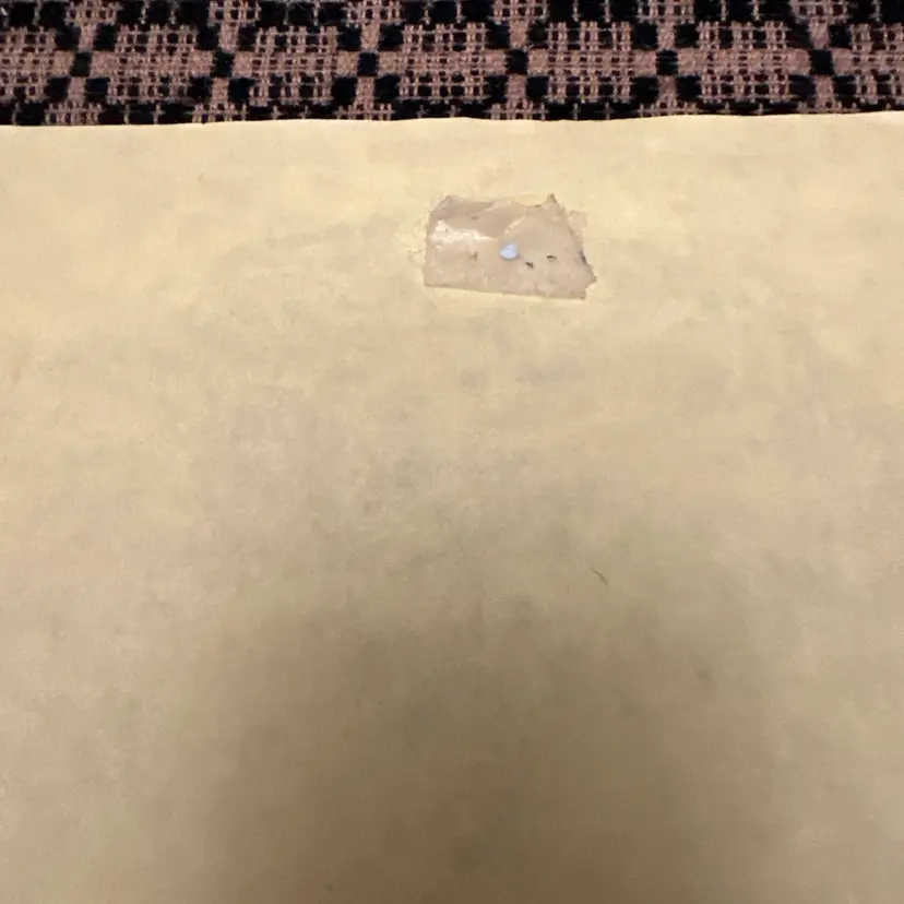 There is a small piece of tape on the backside and there is a crease in the center and on the edges corners