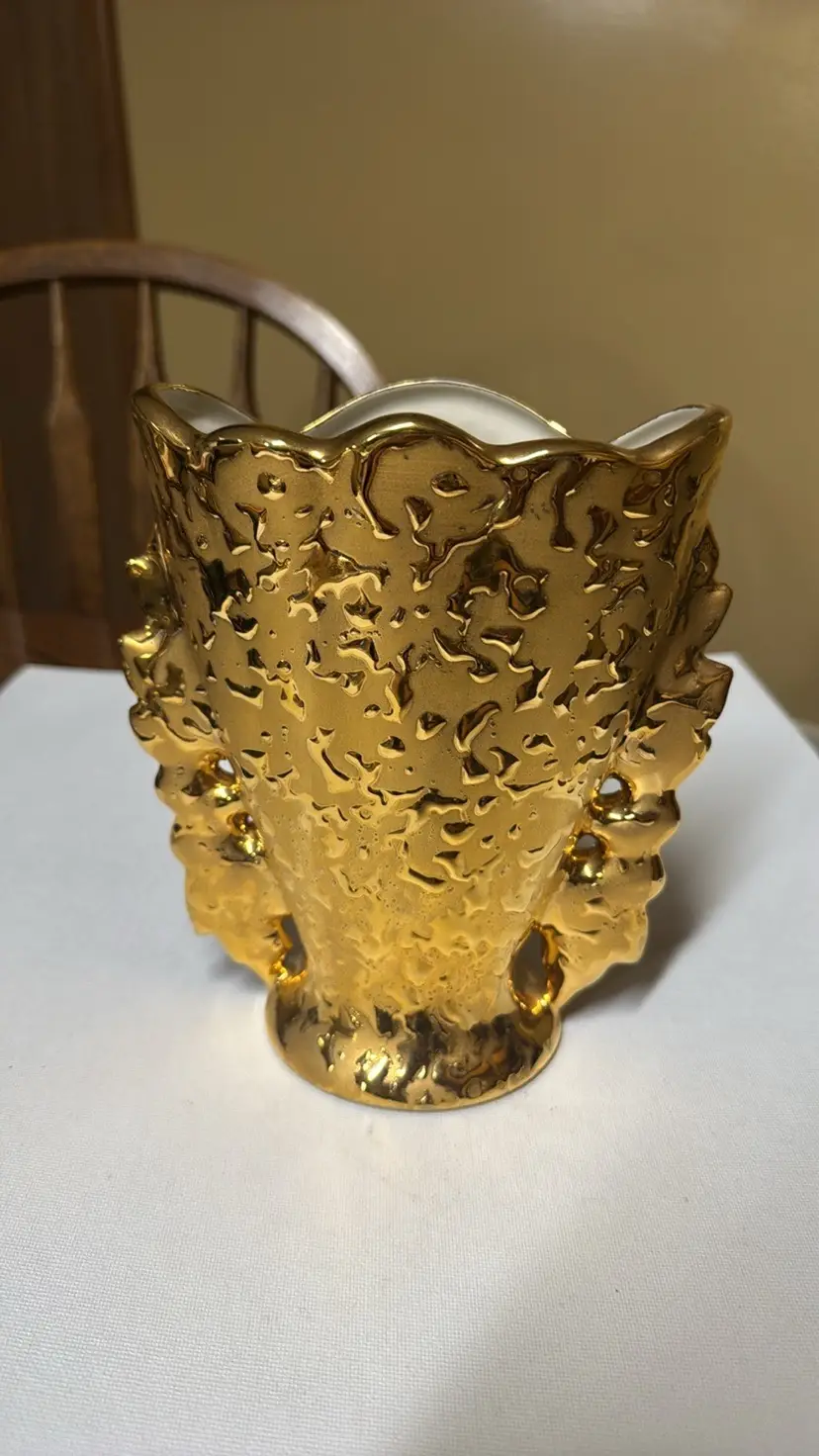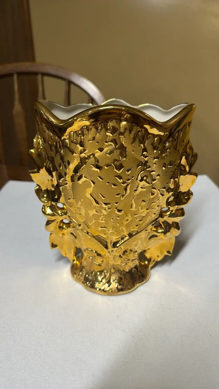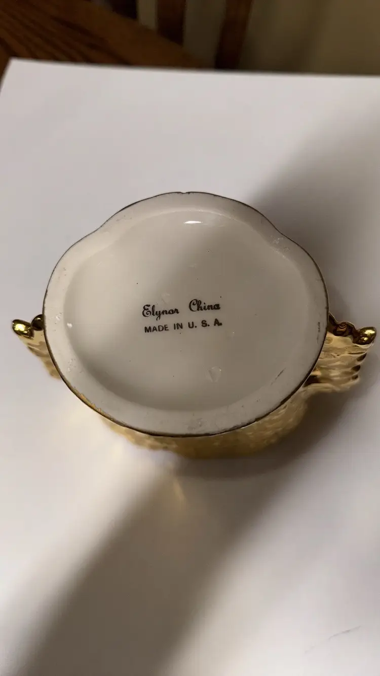 Vintage Elynor China Weeping Gold Vase 7.25 Inches Tall about 7” wide by 3.5” Made in USA Beautiful vase with no breaks or chips and very little wear on the gold there is a tiny bit on the bottom edges on the sides. (82122255)