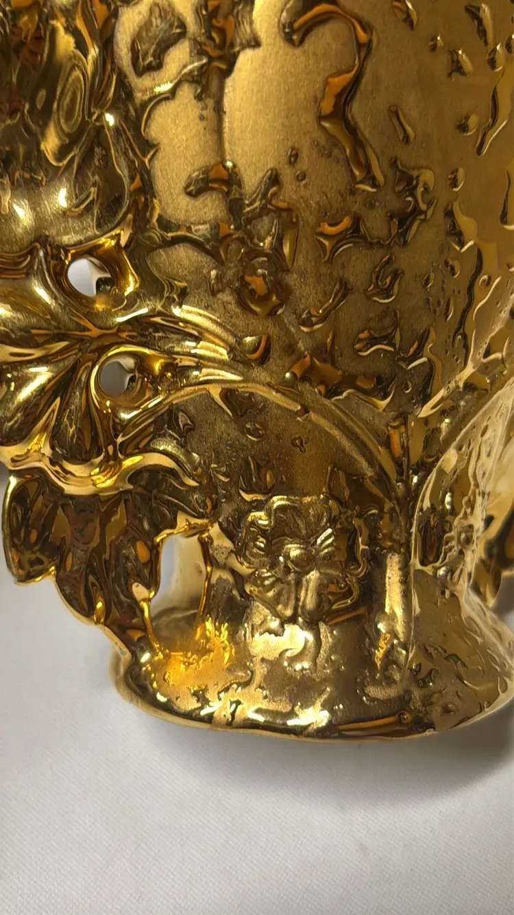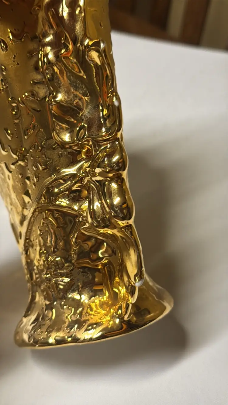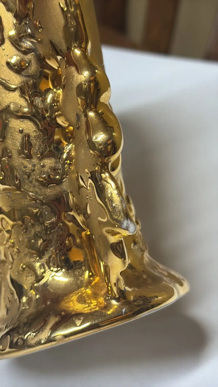 Vintage Elynor China Weeping Gold Vase 7.25 Inches Tall about 7” wide by 3.5” Made in USA Beautiful vase with no breaks or chips and very little wear on the gold there is a tiny bit on the bottom edges on the sides. (82122255)