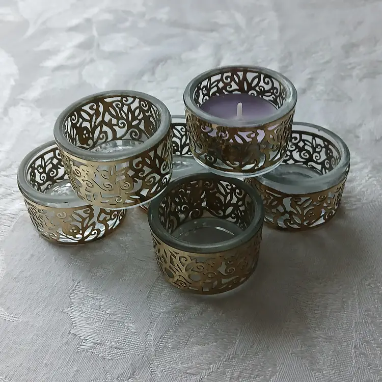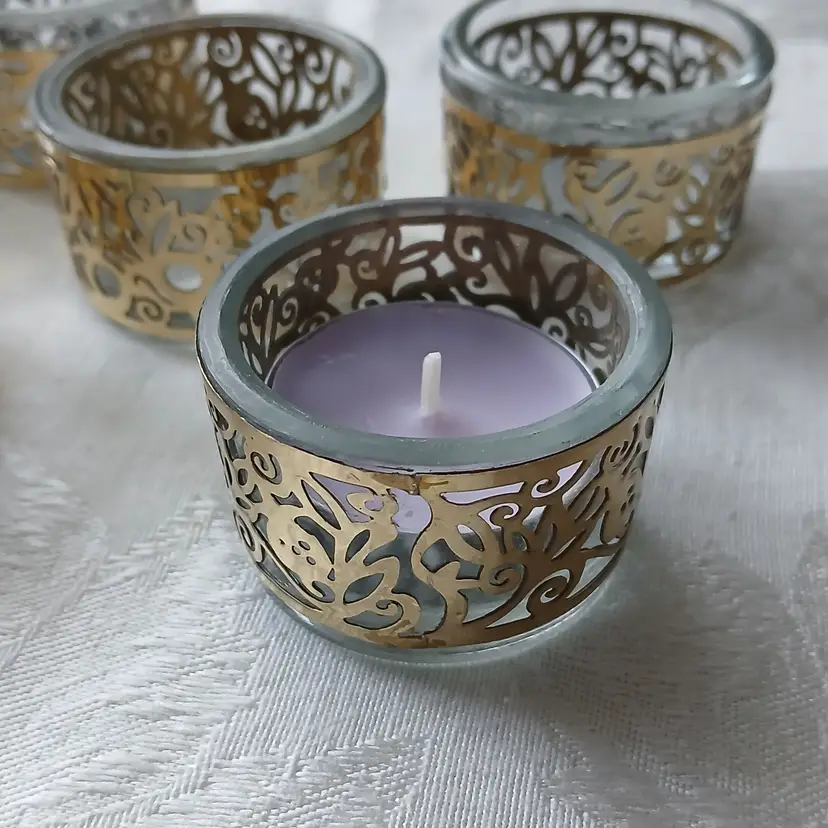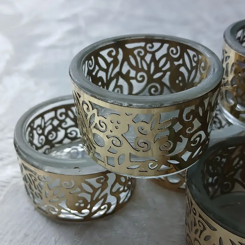 Gorgeous little Tea light Holders with beautiful gold design would be Beautiful placed around your table. You get six of them.