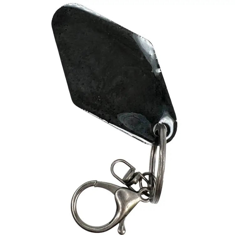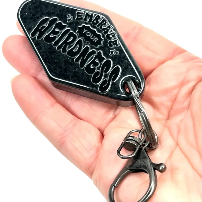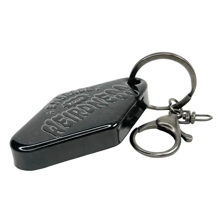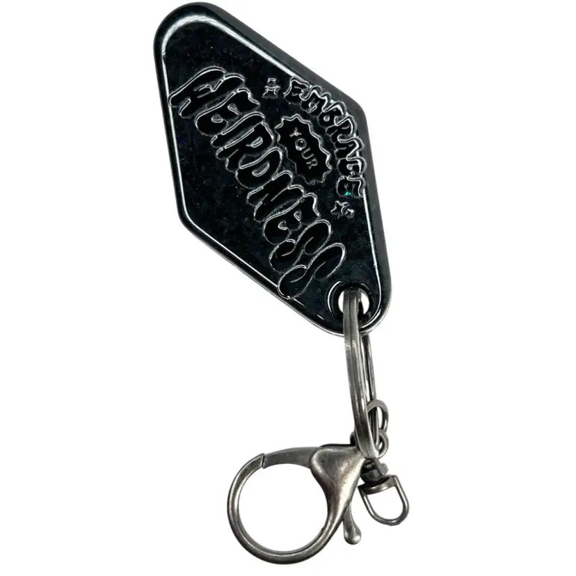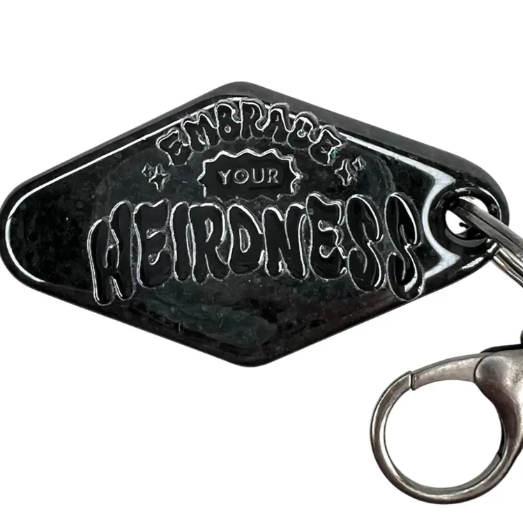 Handmade by me! “Embrace Your Weirdness” appliqué sticker on Black resin Retro Motel-Style shape Dark “gunmetal” color keychain & ring Overall length 5” 2-3/4” x 1-1/2” x 3/8”