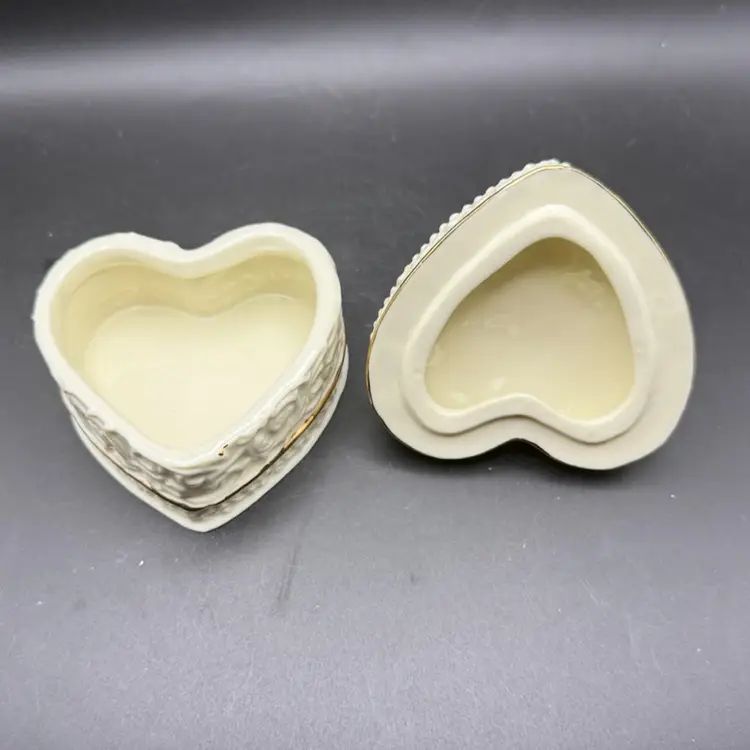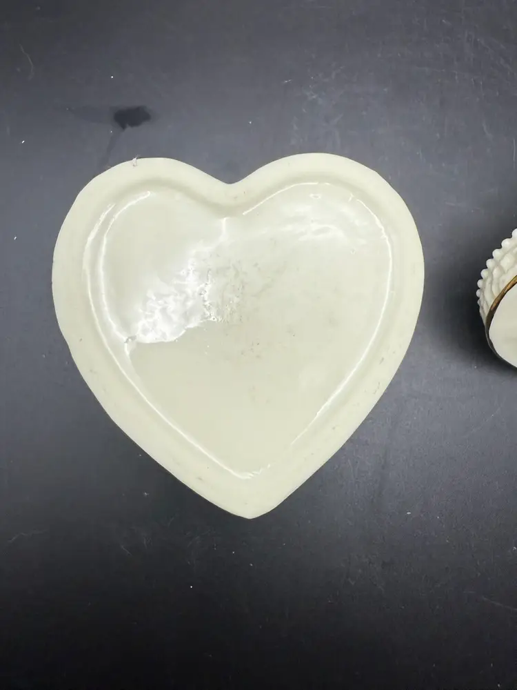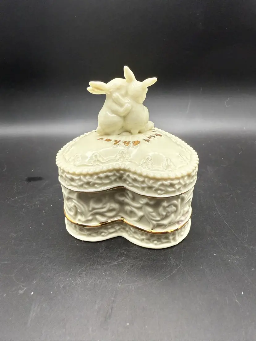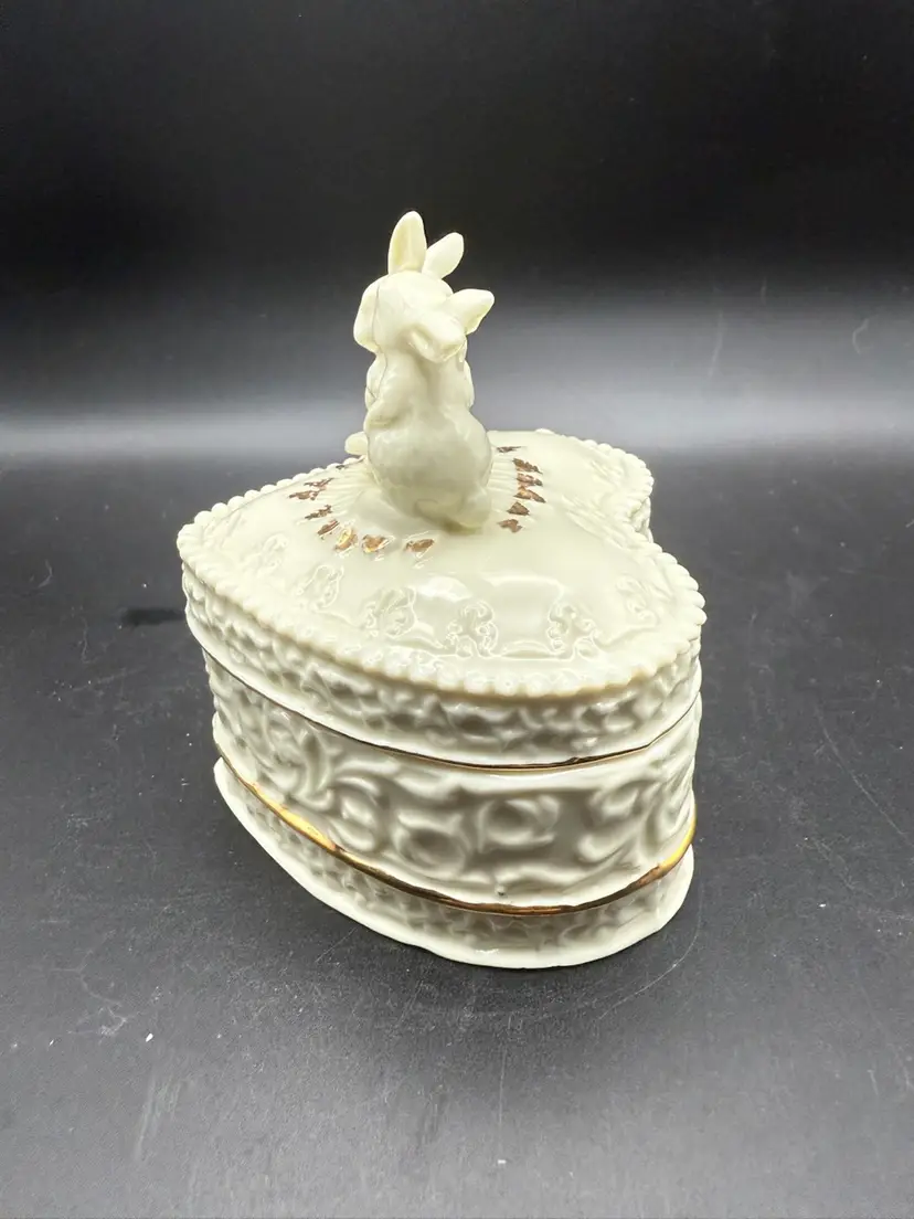 This adorable ceramic, gold trimmed, heart-shaped trinket box has two little bunnies giving each other a hug. These were made in the mid to late century. This is 4 in high by 3 1/2 wide.